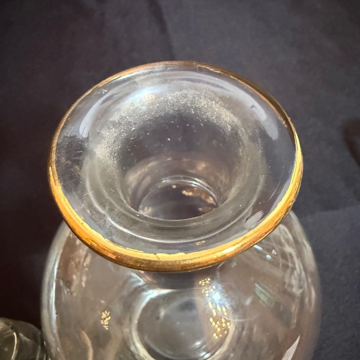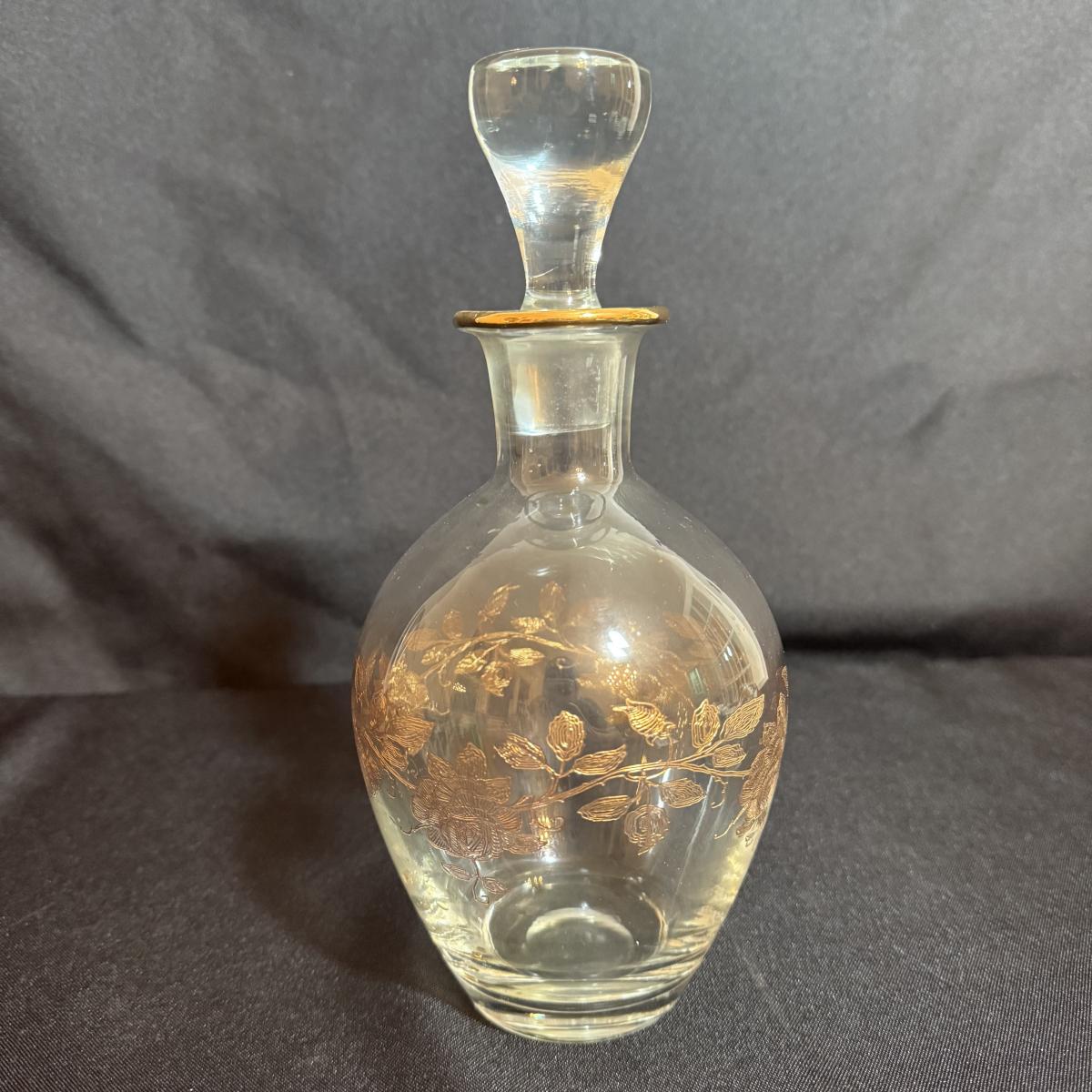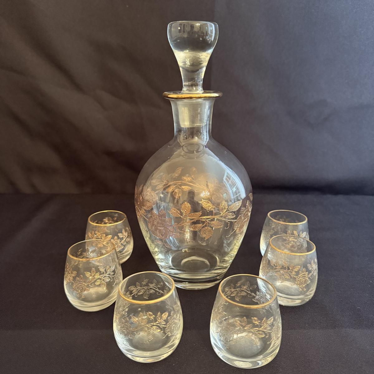 Lovely and delicate gilded and etched rose design adorns this glass decanter with six small matching glasses. The decanter is about 4.5”D x 9.5”H with the stopper. The gold remains vibrant on most of the set, but has faded on a few glasses. The 9” glass bowl included has the appearance of a Savior Vivre Cinderella salad bowl. The floral motif is very lighted tinted with color.