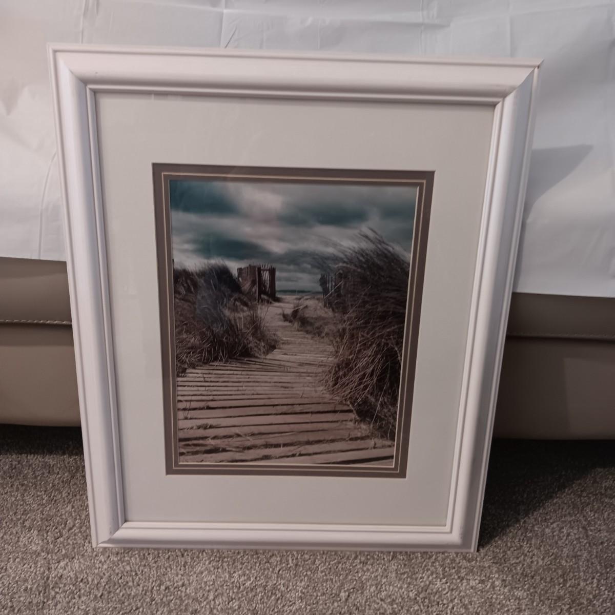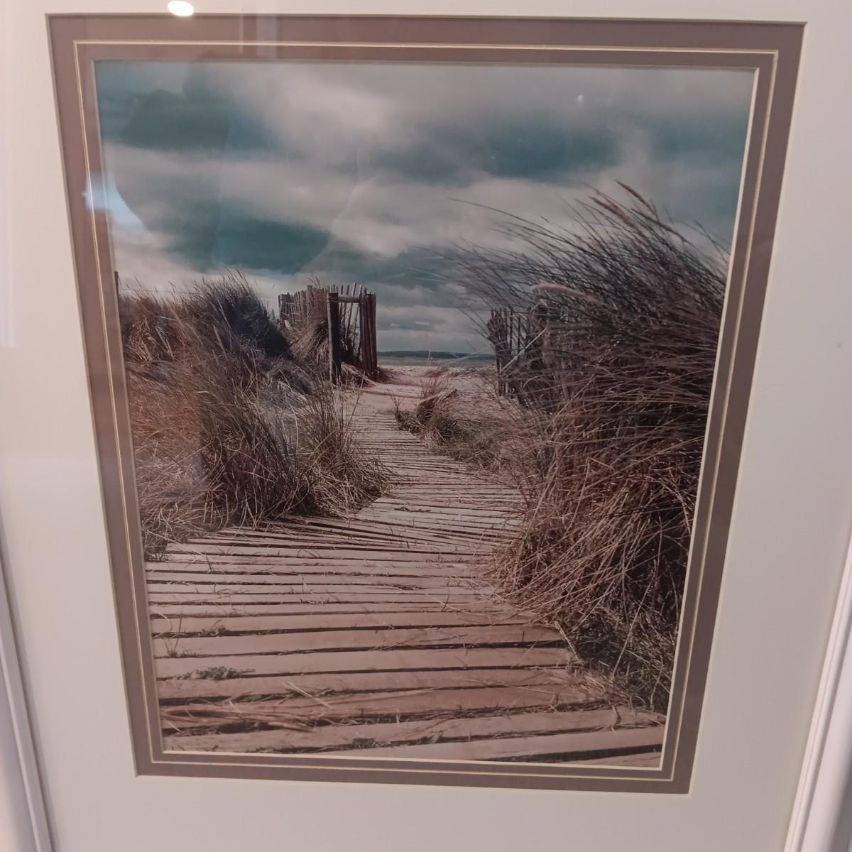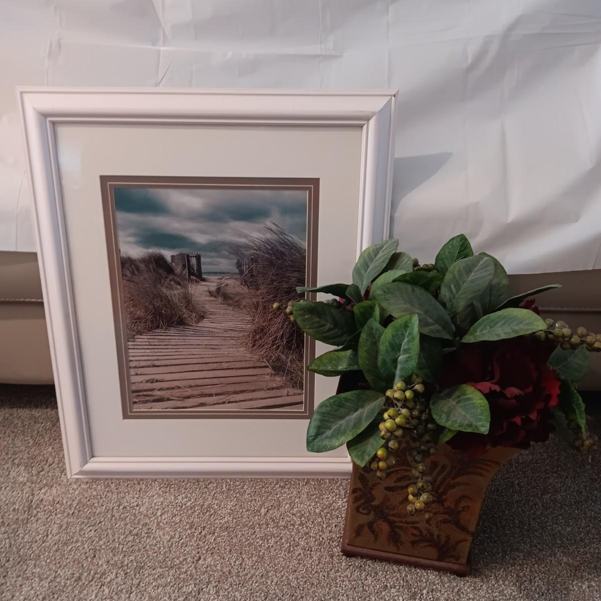 GILL COPELAND FRAMED PHOTO OF BEACH SCENE AND FAUX PLANT IN METAL VASE