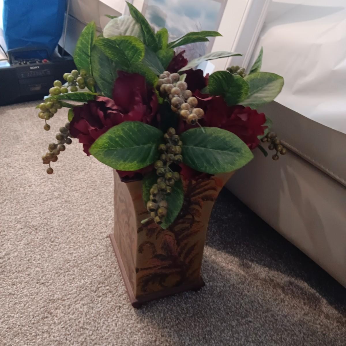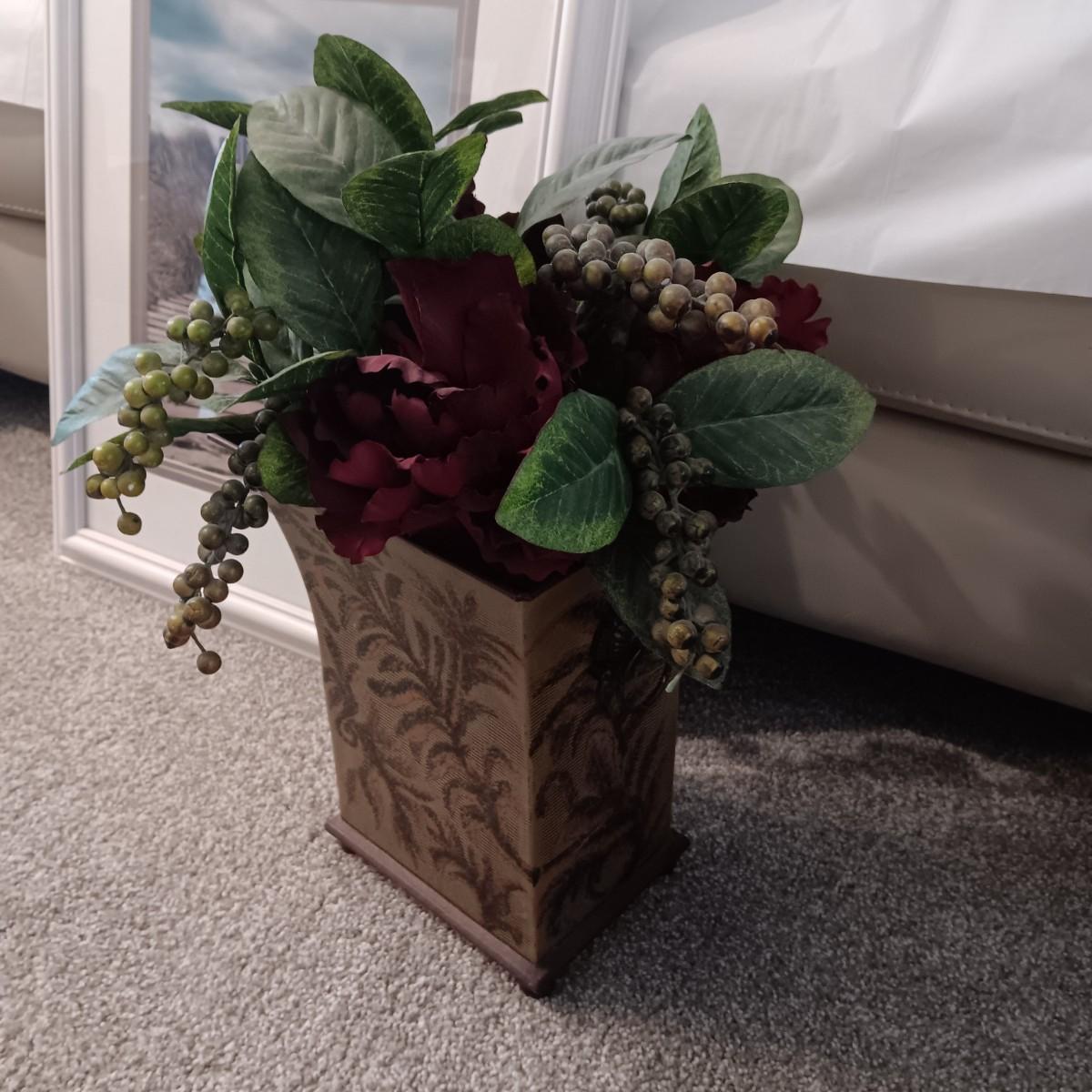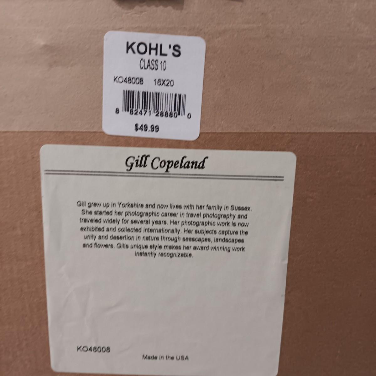 GILL COPELAND FRAMED PHOTO OF BEACH SCENE AND FAUX PLANT IN METAL VASE
