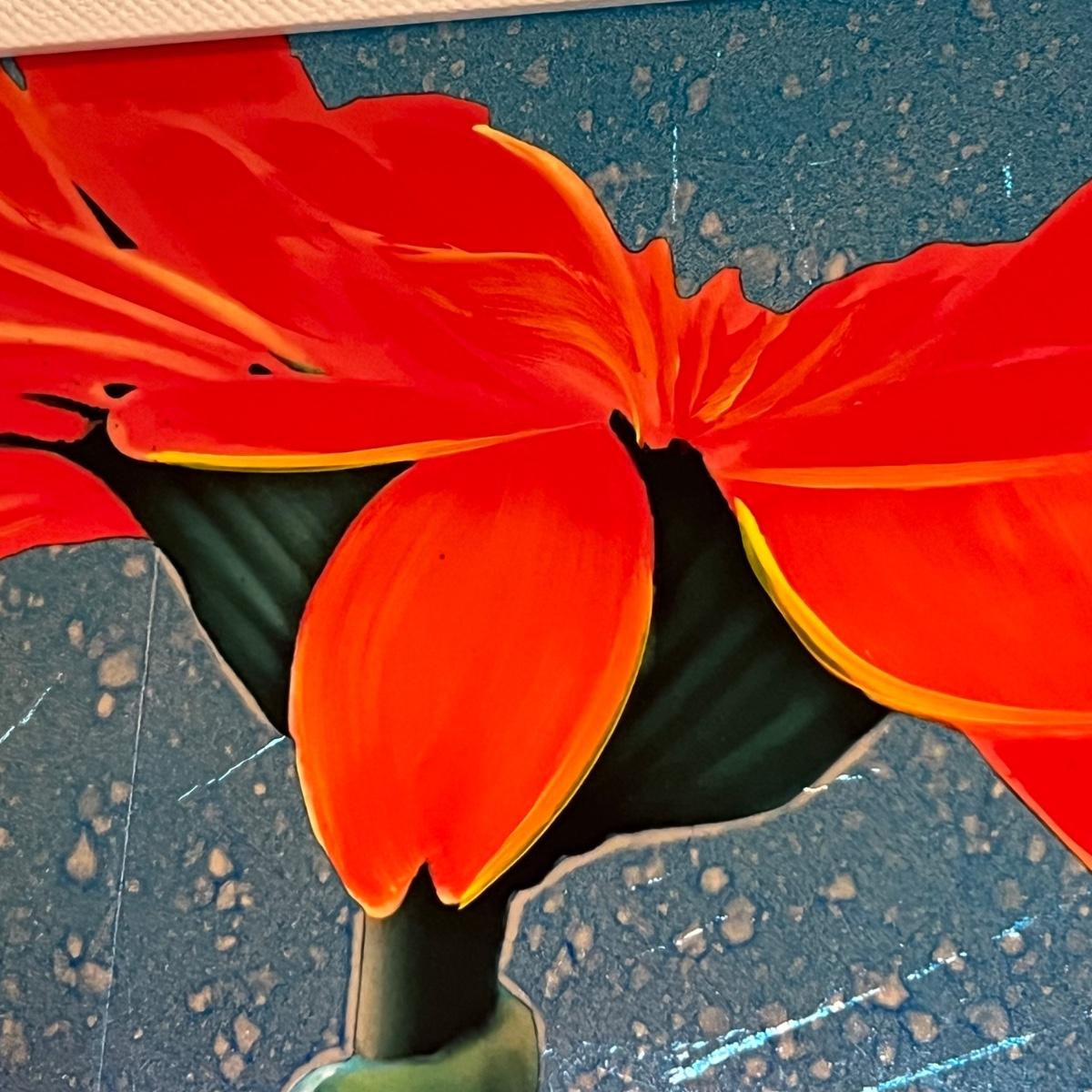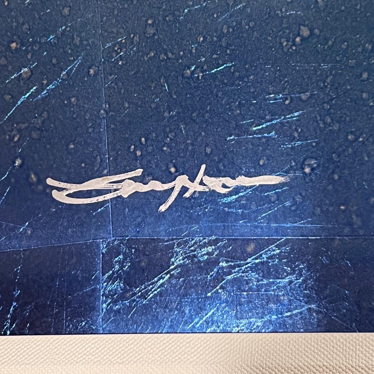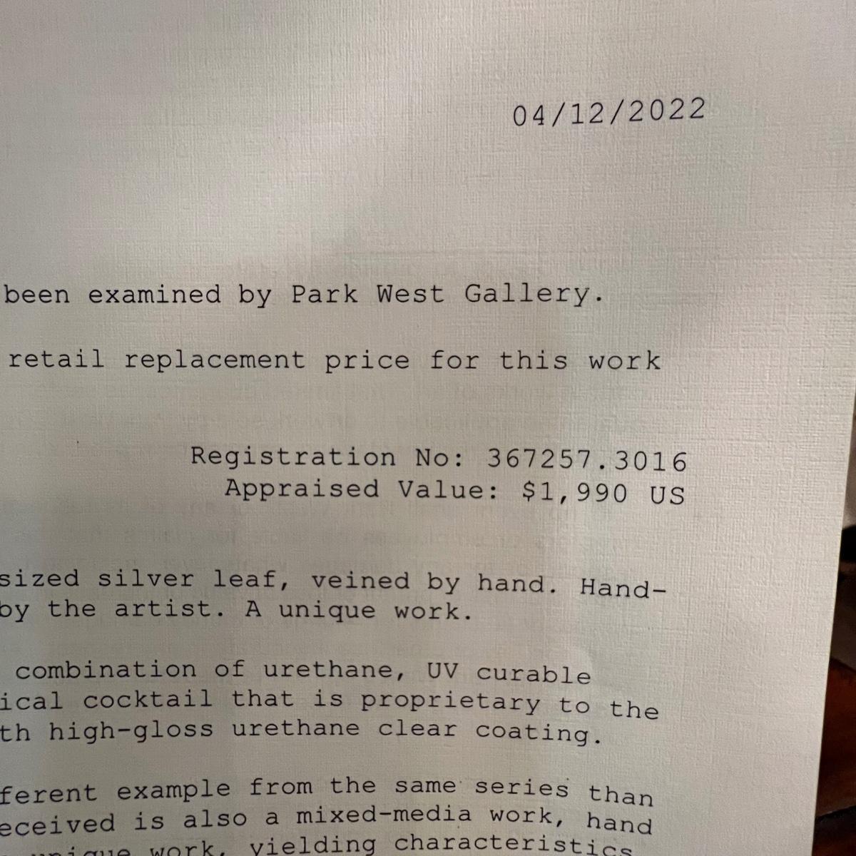 Mixed media on aluminum with sized silver leaf. This sale has three more pieces by this artist. See images for the accompanying COA which has more information about the art. Mounted (not under glass) in a silver metallic resin like frame that compliments the art perfectly; frame measures 19" square x 1” deep.