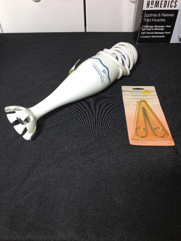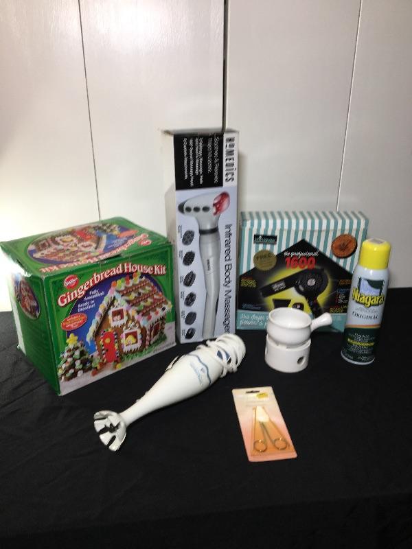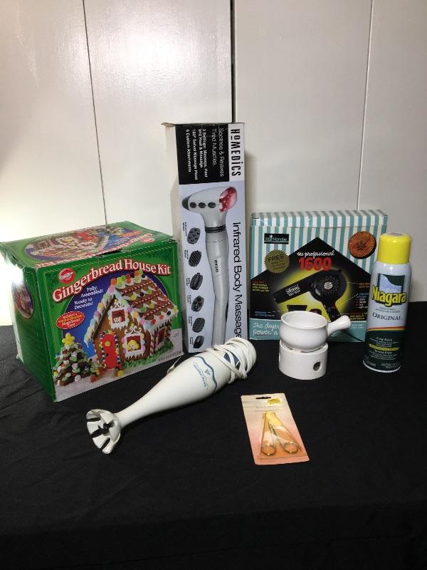 Gingerbread house, massager, chopper, potpourri, hair dryer, & Misc