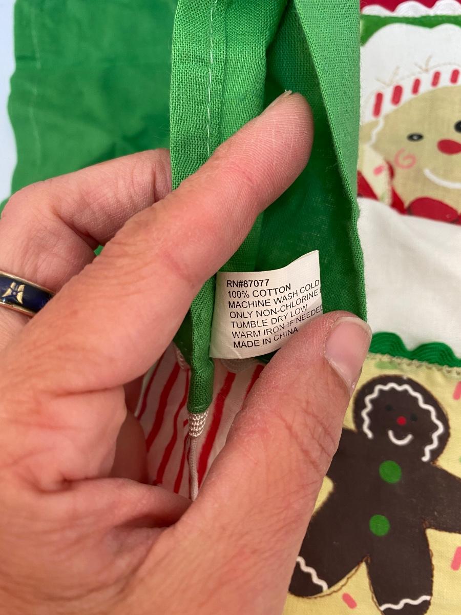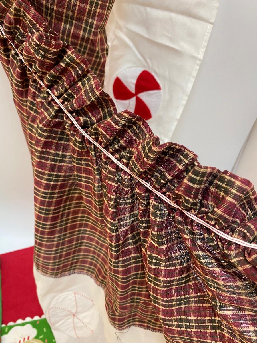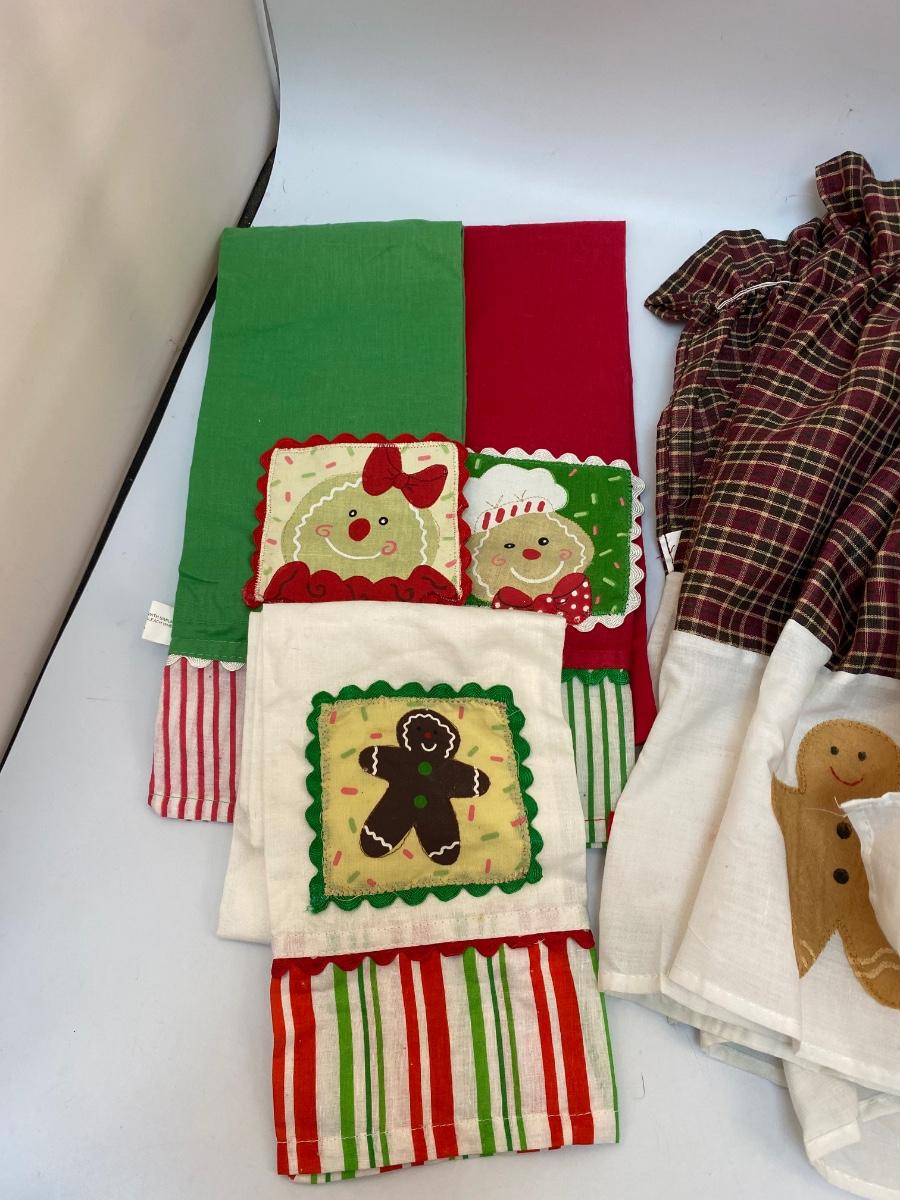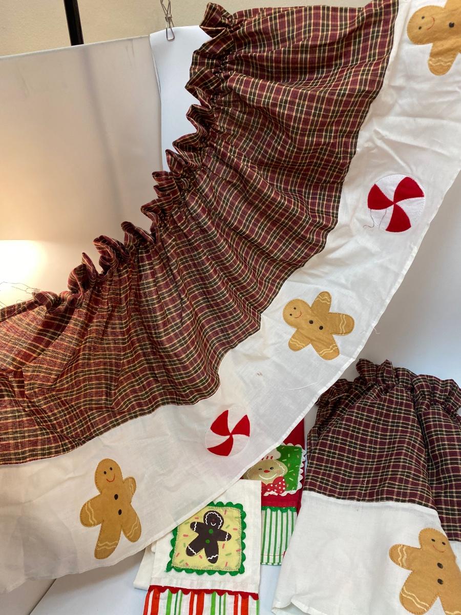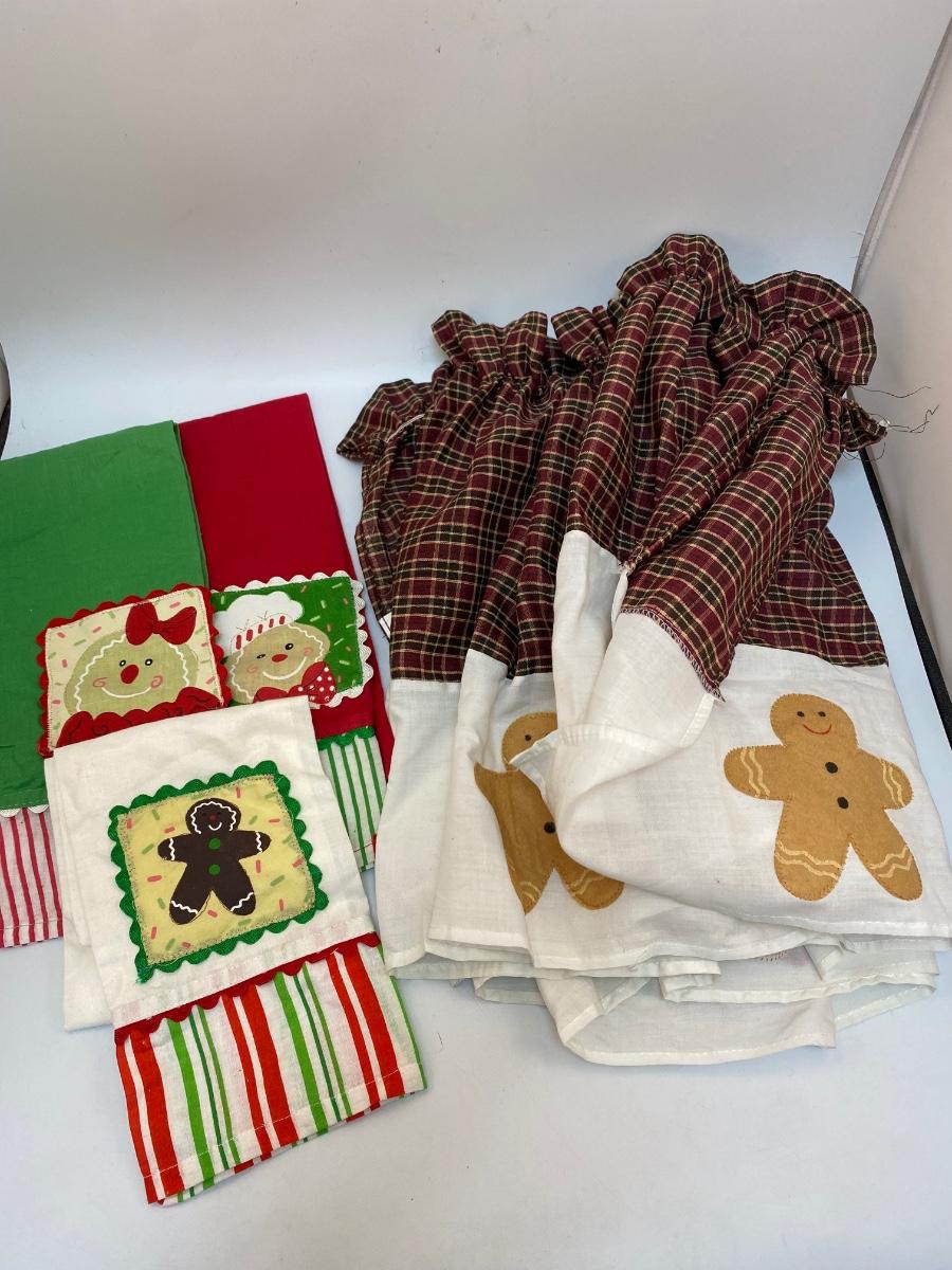 Gingerbread Man Themed Linens. Three hand towels, thin material, best for decor. The two panels have elastic at the top, no ties like apron or spots for hanging, great for repurposing.