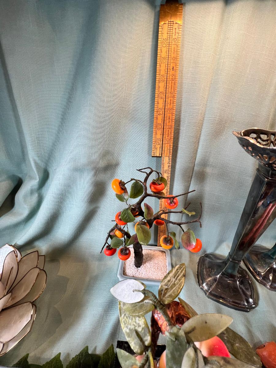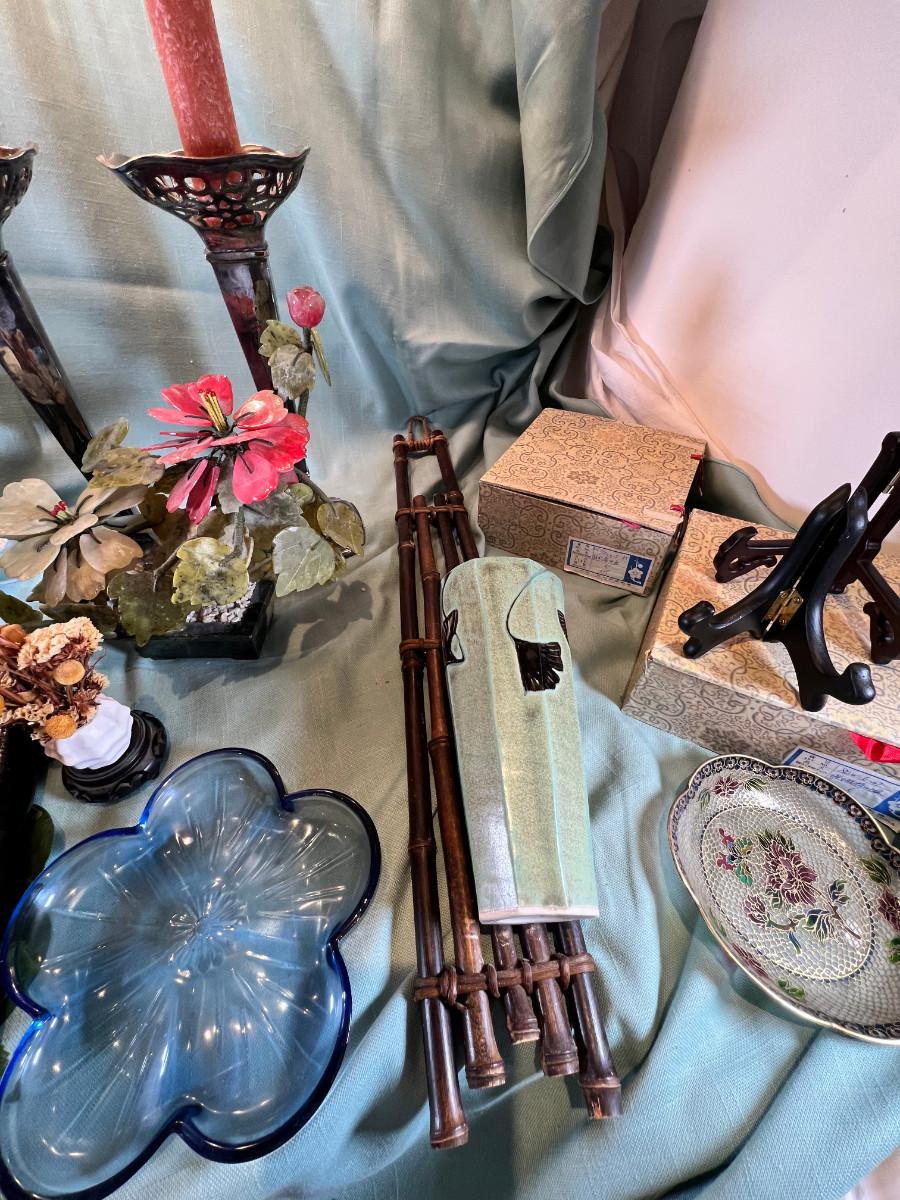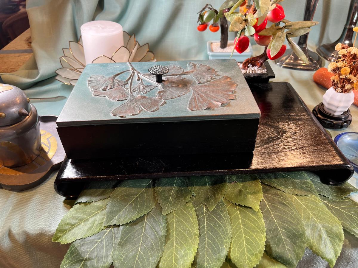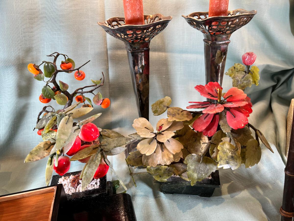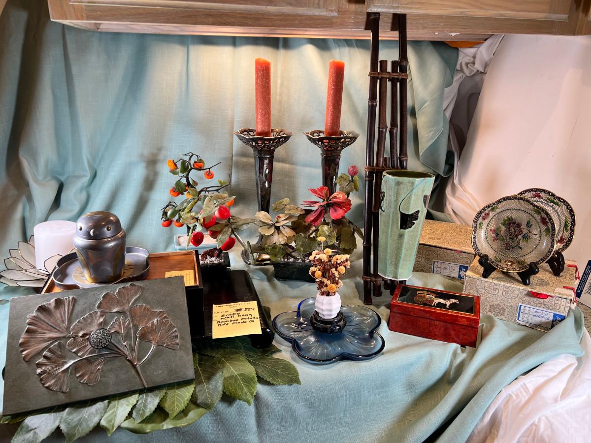 Wall display with Green Ginko ceramic vessel hanging, 2 Silver plated Portuguese metal filigree candle holders with orange tapers, Bamboo Box with a metallized Ginko lid and triple leaf mat . 3 Stone and jape trees, 2 fruit! Blue glass shaped hallmarked plate, miniature vase, Metal vessel and holder from Gumps, 2 translucent plates with boxes. Translucent Lotus Candle holder with new Crate and barrel candle, Reserve.