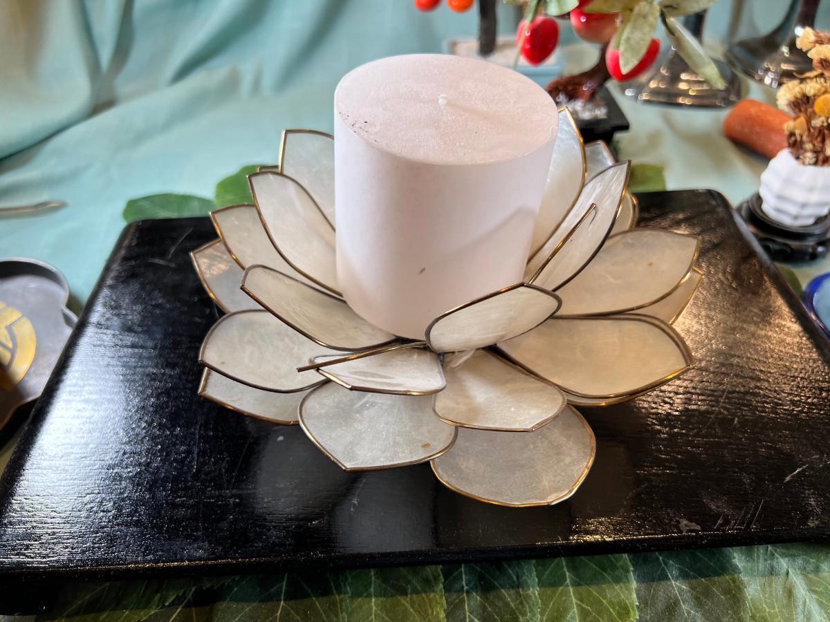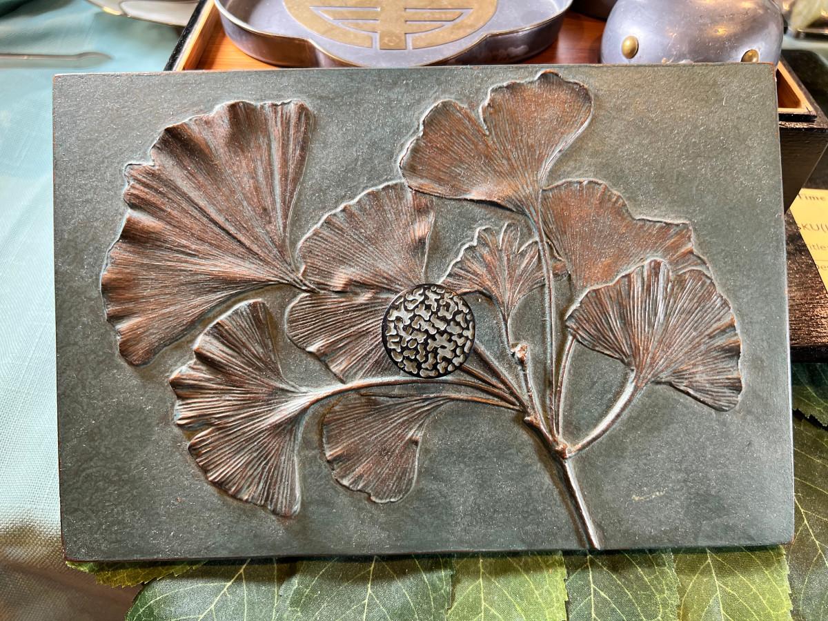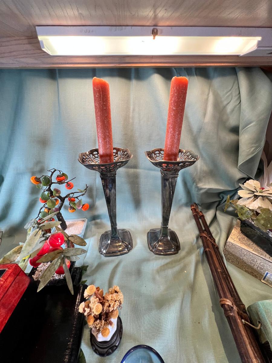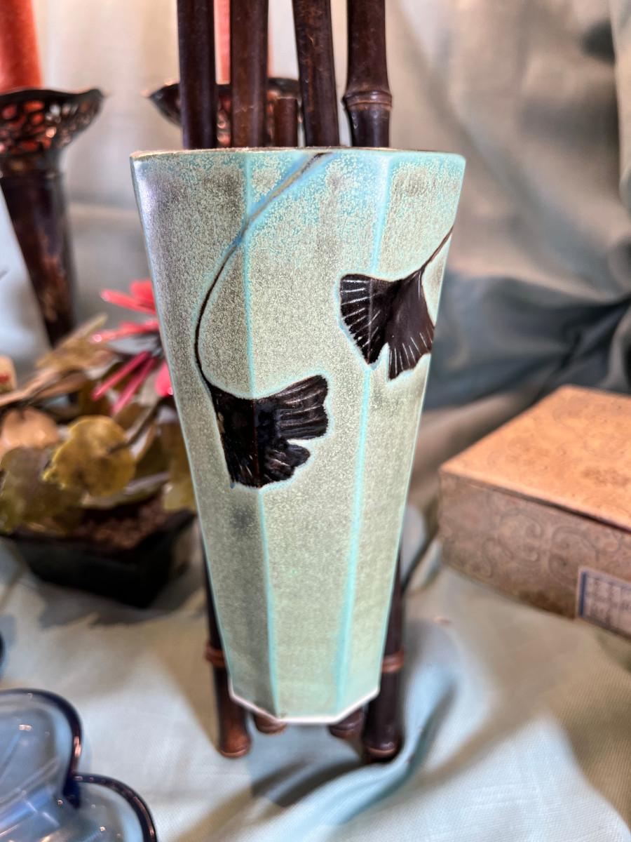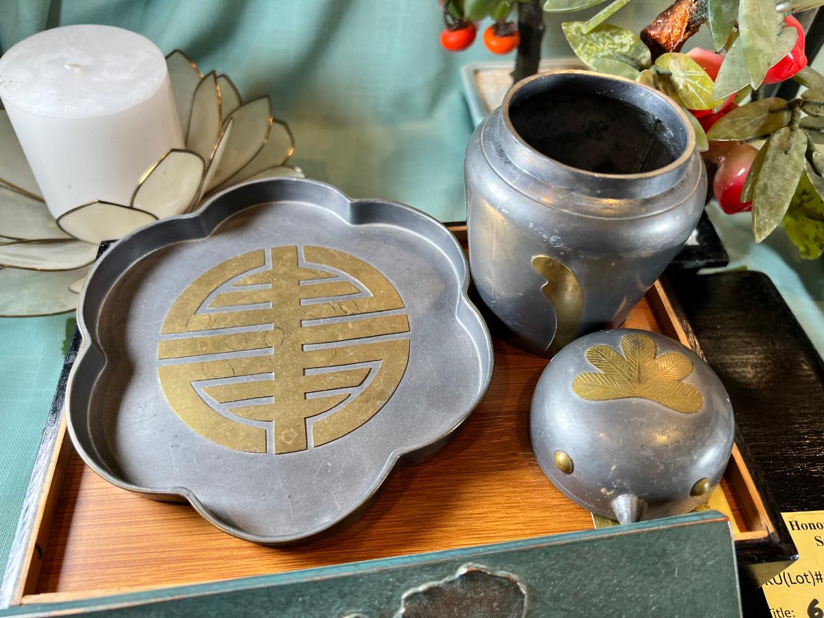 Wall display with Green Ginko ceramic vessel hanging, 2 Silver plated Portuguese metal filigree candle holders with orange tapers, Bamboo Box with a metallized Ginko lid and triple leaf mat . 3 Stone and jape trees, 2 fruit! Blue glass shaped hallmarked plate, miniature vase, Metal vessel and holder from Gumps, 2 translucent plates with boxes. Translucent Lotus Candle holder with new Crate and barrel candle, Reserve.