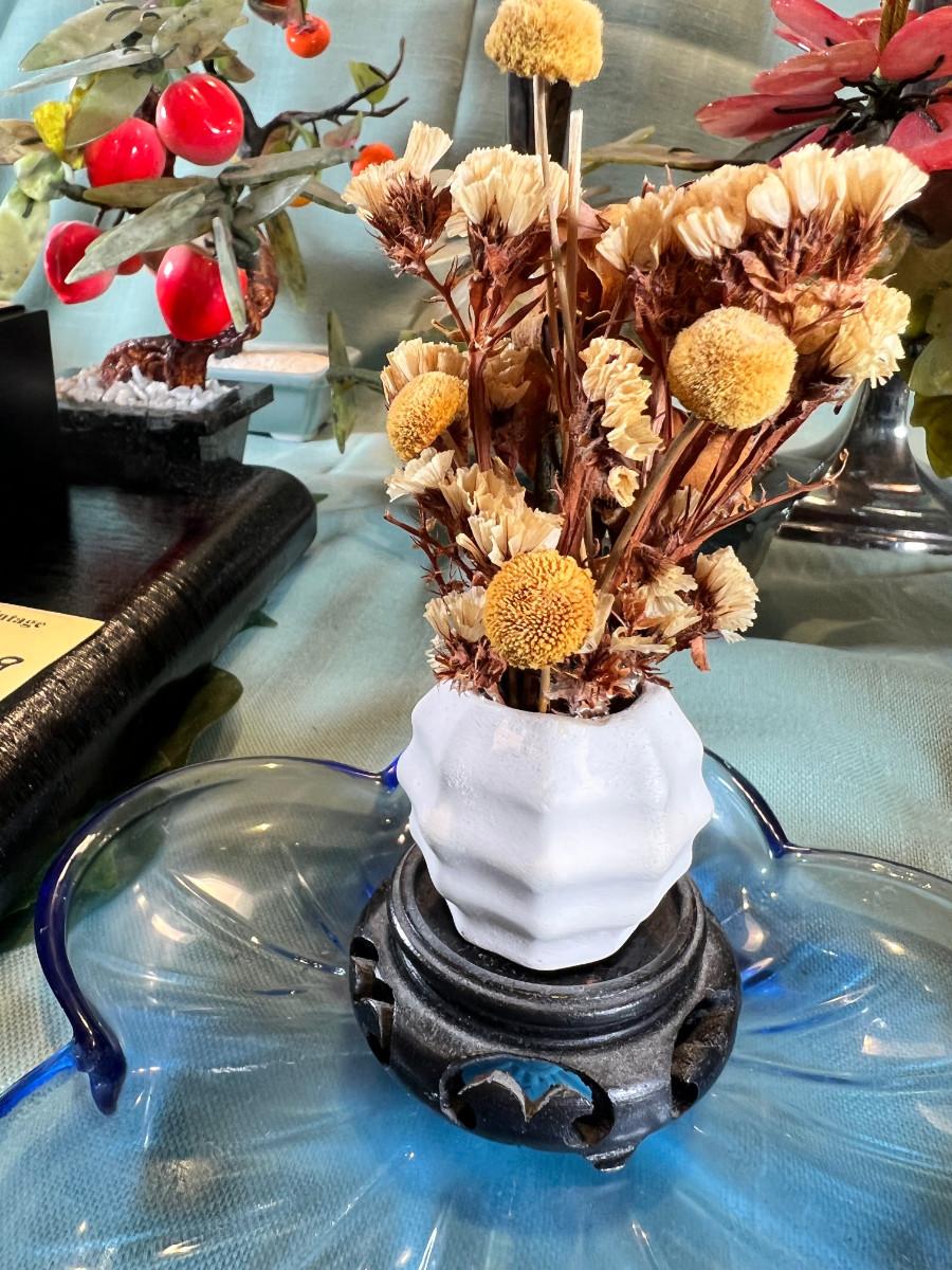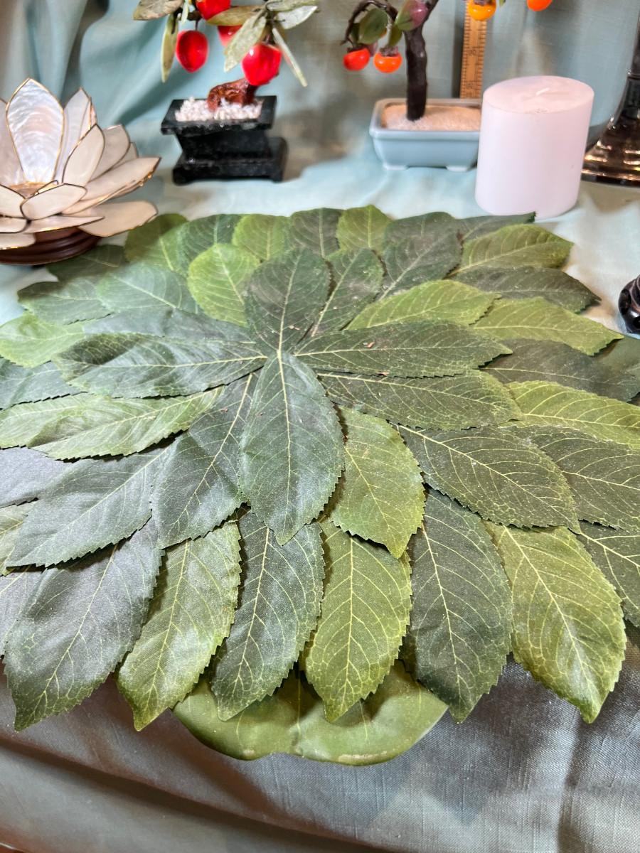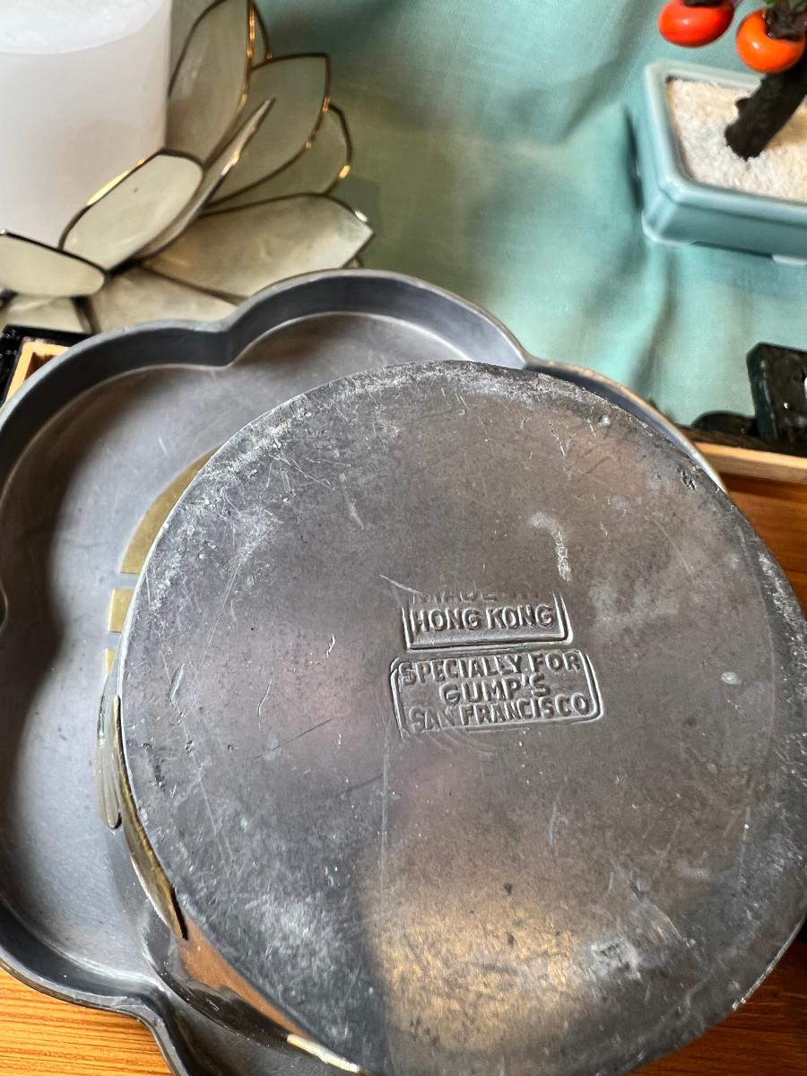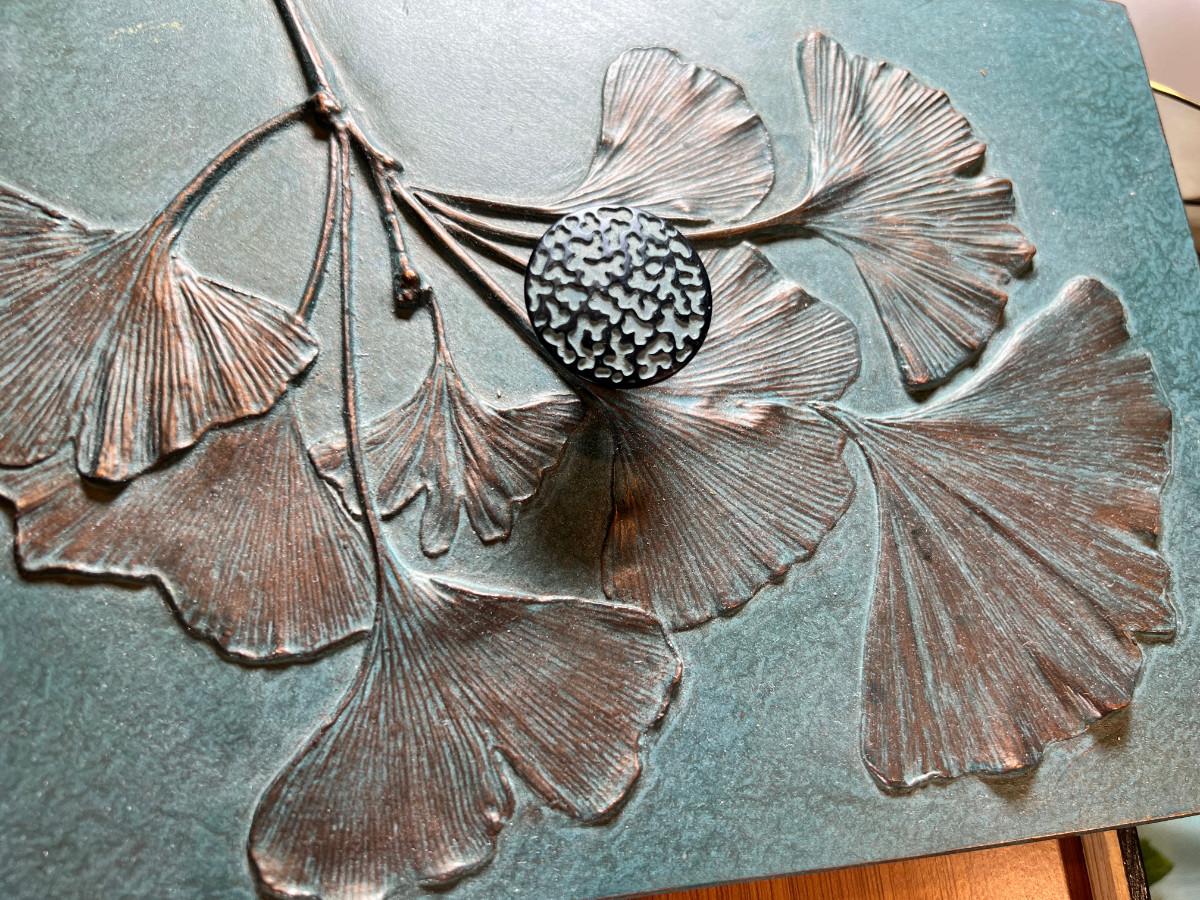 Wall display with Green Ginko ceramic vessel hanging, 2 Silver plated Portuguese metal filigree candle holders with orange tapers, Bamboo Box with a metallized Ginko lid and triple leaf mat . 3 Stone and jape trees, 2 fruit! Blue glass shaped hallmarked plate, miniature vase, Metal vessel and holder from Gumps, 2 translucent plates with boxes. Translucent Lotus Candle holder with new Crate and barrel candle, Reserve.