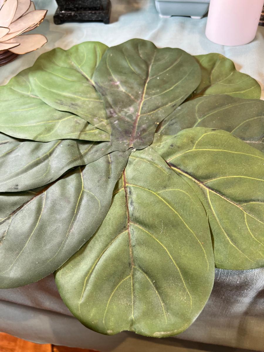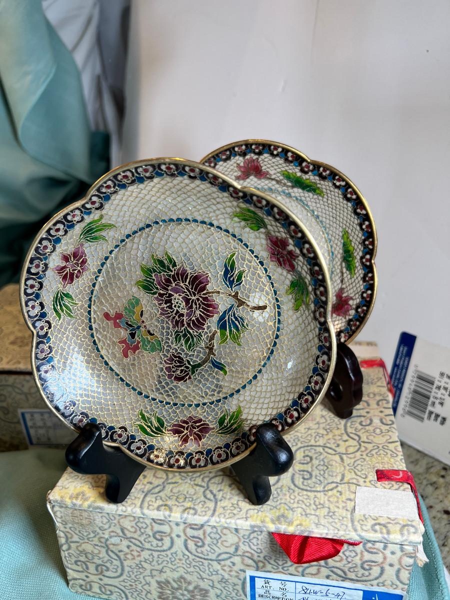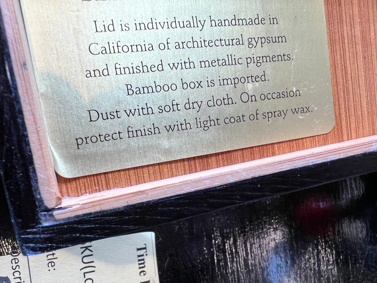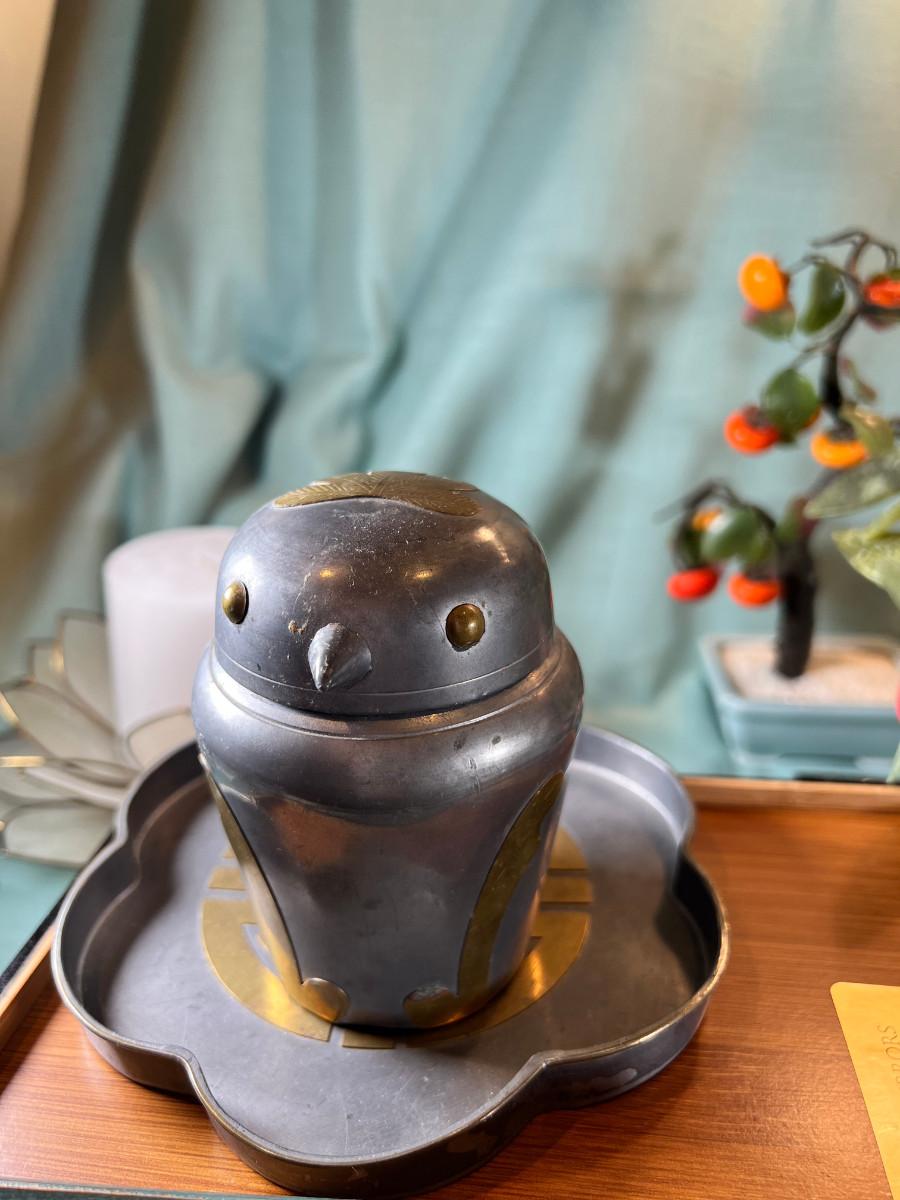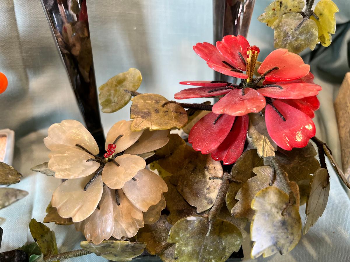 Wall display with Green Ginko ceramic vessel hanging, 2 Silver plated Portuguese metal filigree candle holders with orange tapers, Bamboo Box with a metallized Ginko lid and triple leaf mat . 3 Stone and jape trees, 2 fruit! Blue glass shaped hallmarked plate, miniature vase, Metal vessel and holder from Gumps, 2 translucent plates with boxes. Translucent Lotus Candle holder with new Crate and barrel candle, Reserve.