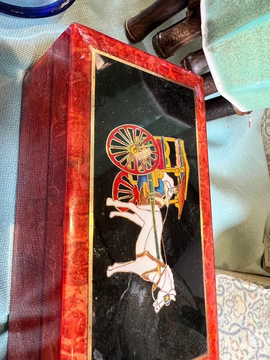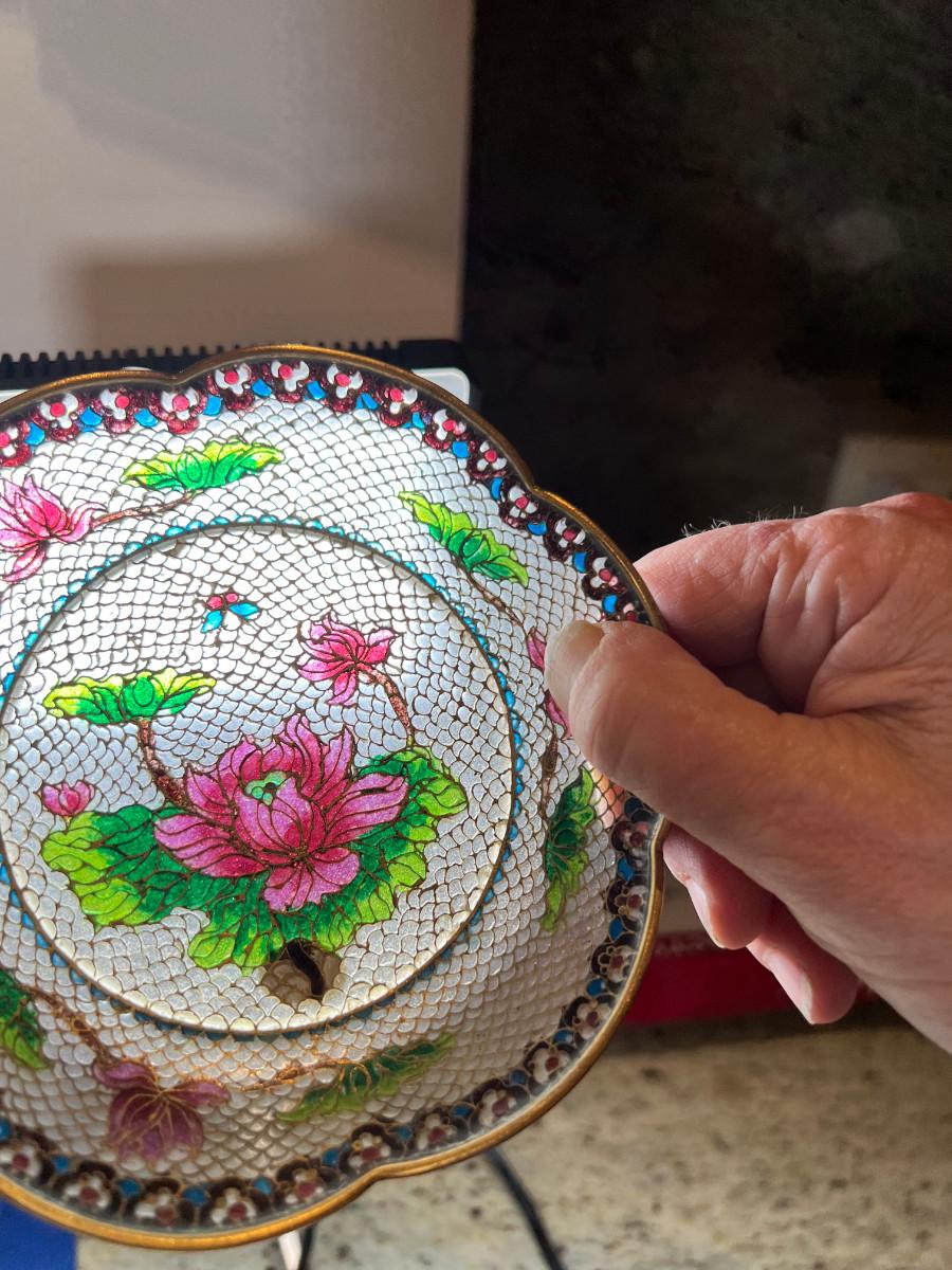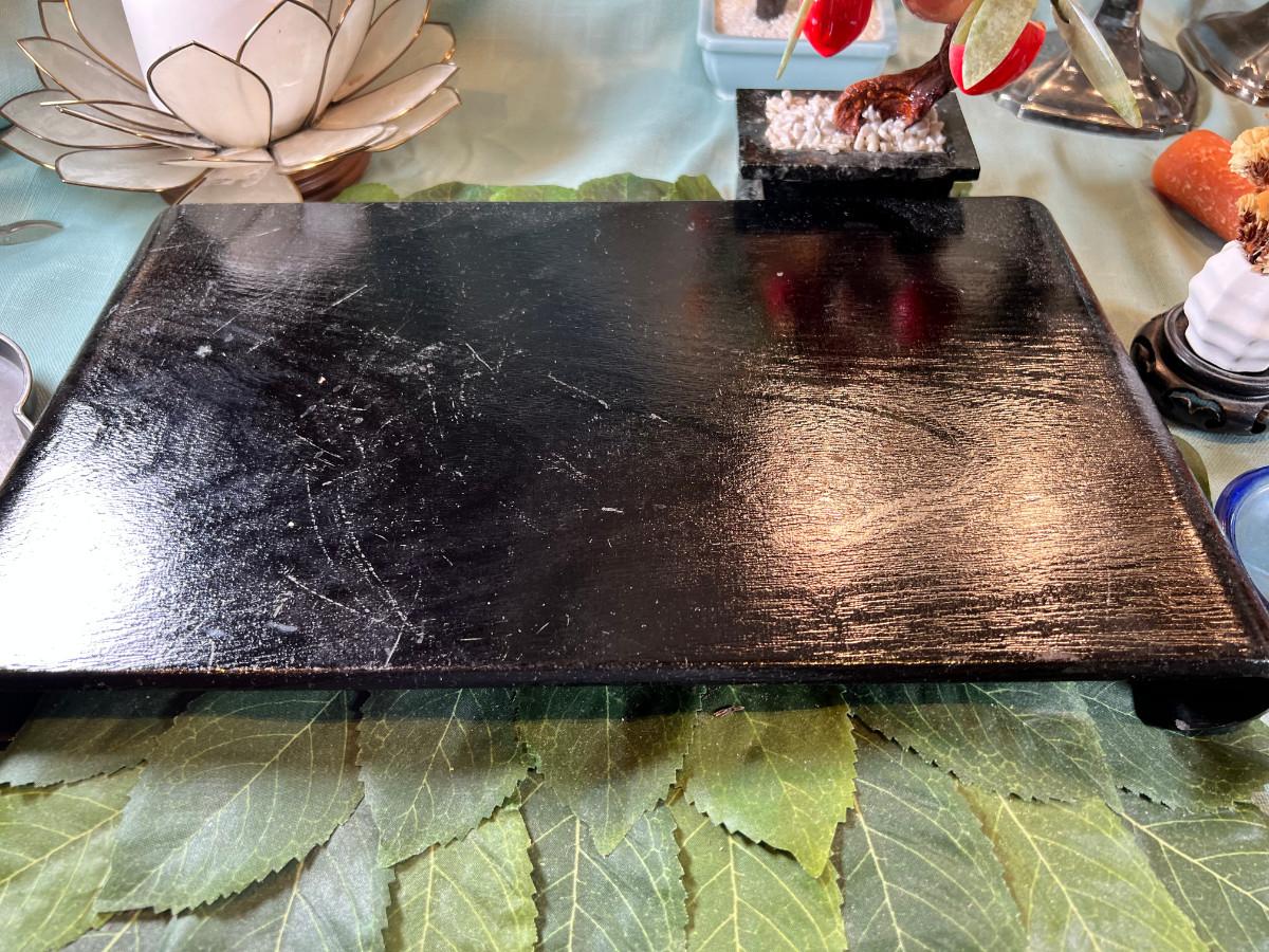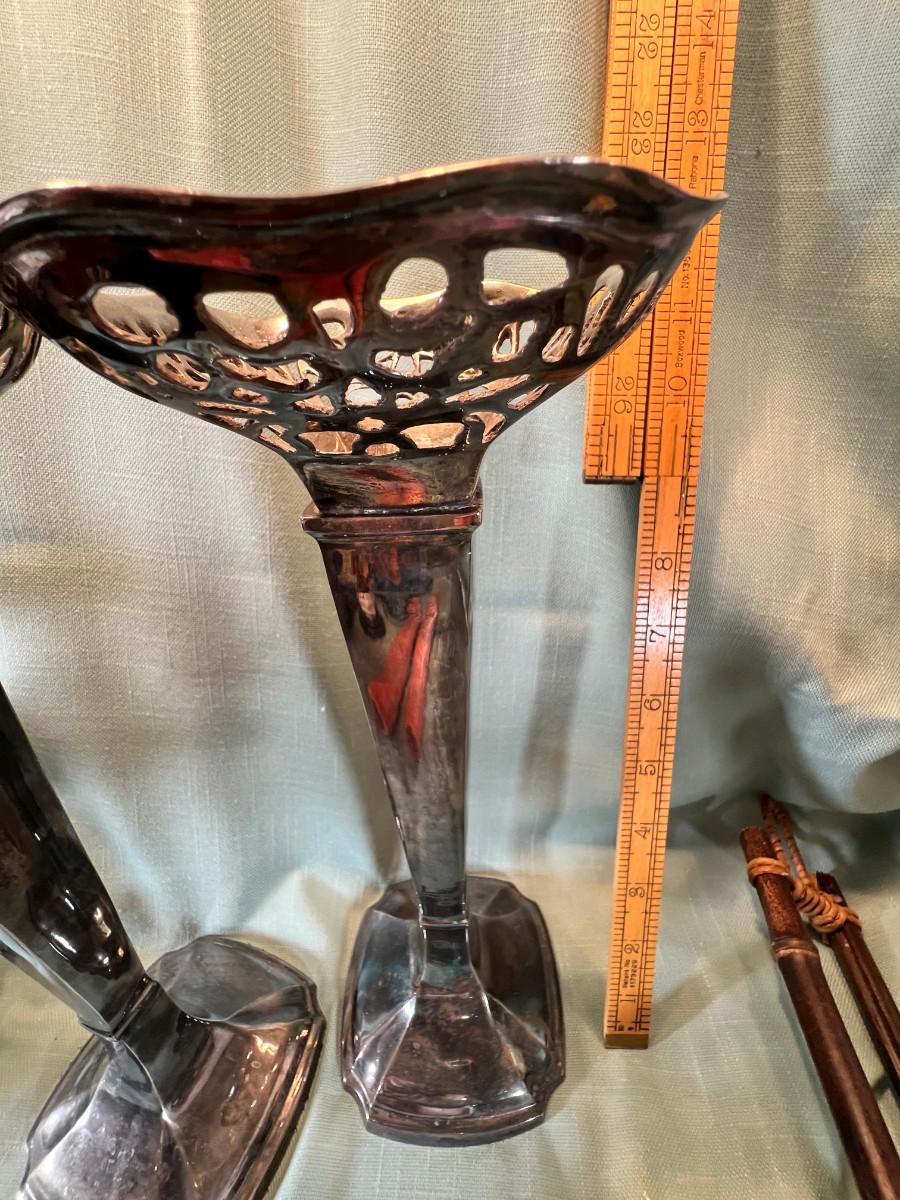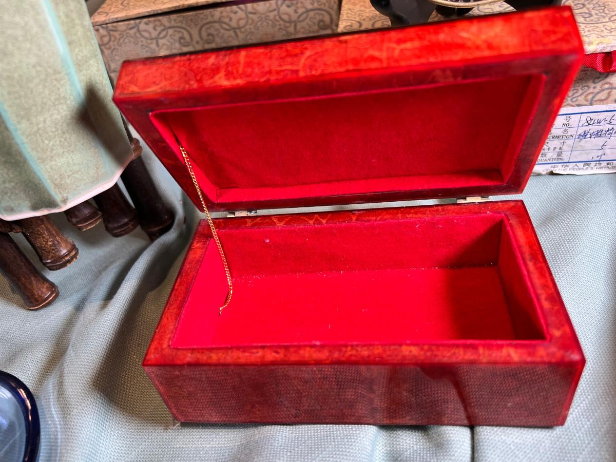 Wall display with Green Ginko ceramic vessel hanging, 2 Silver plated Portuguese metal filigree candle holders with orange tapers, Bamboo Box with a metallized Ginko lid and triple leaf mat . 3 Stone and jape trees, 2 fruit! Blue glass shaped hallmarked plate, miniature vase, Metal vessel and holder from Gumps, 2 translucent plates with boxes. Translucent Lotus Candle holder with new Crate and barrel candle, Reserve.