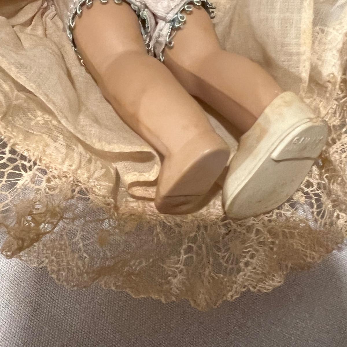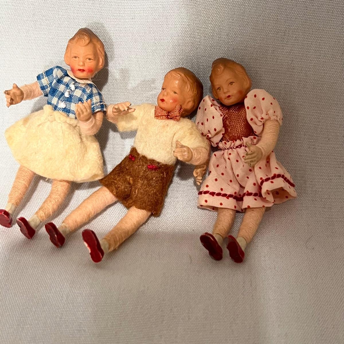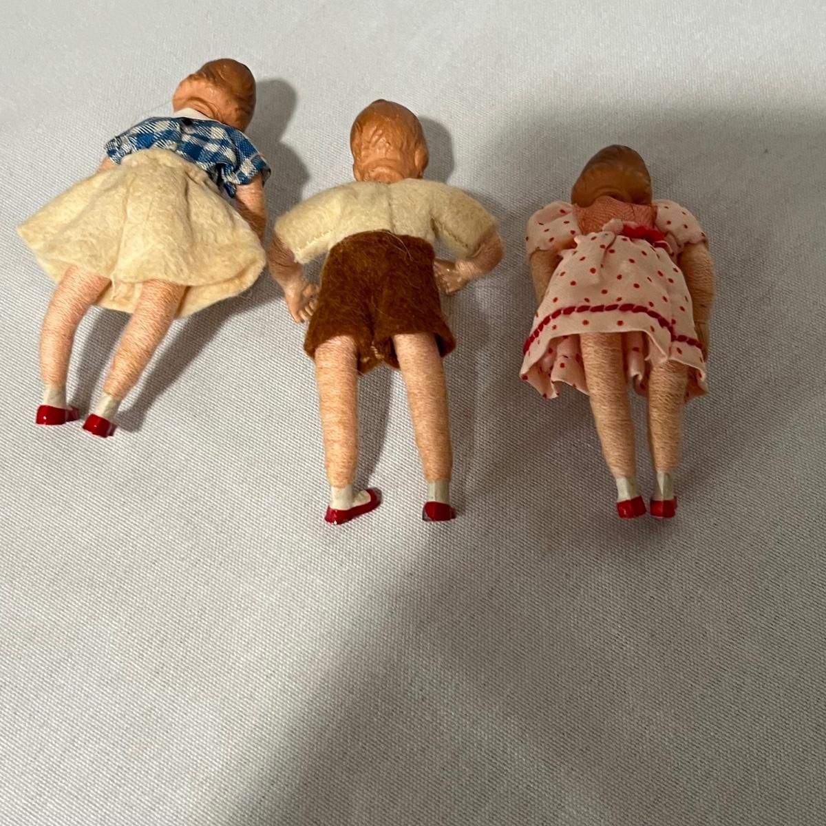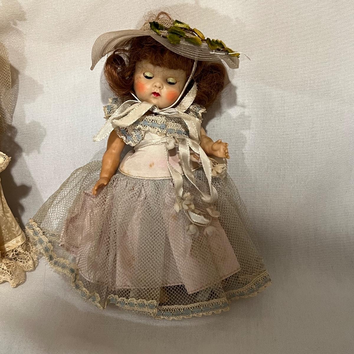 Seven collector dolls includes two Ginny Vogue, one of which appears to be a ‘Bride’ doll; this doll is missing one shoe. The other two larger dolls appear to be Davy Crockett but we didn’t attempt to take clothes off to find their markings. The three small dolls appear to be German Bisque dolls but no markings found.