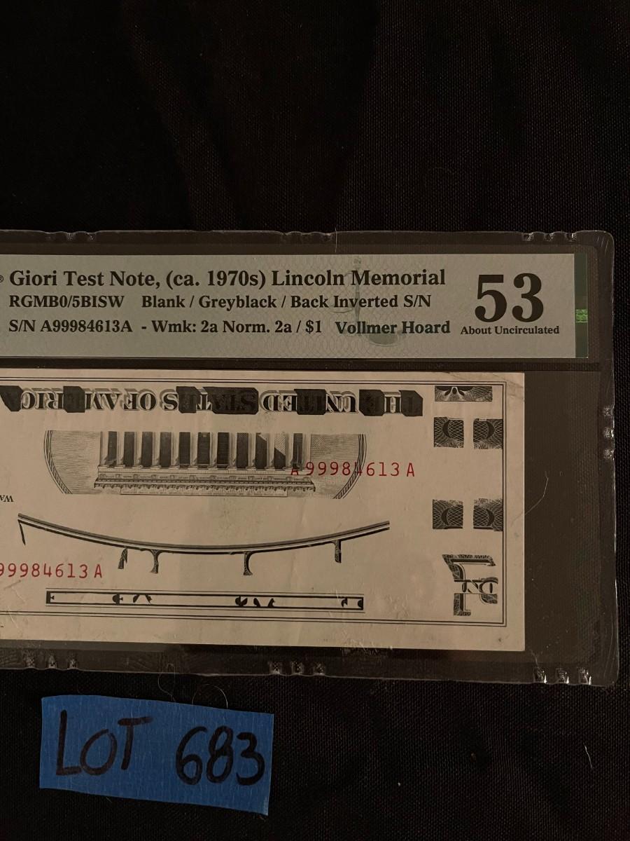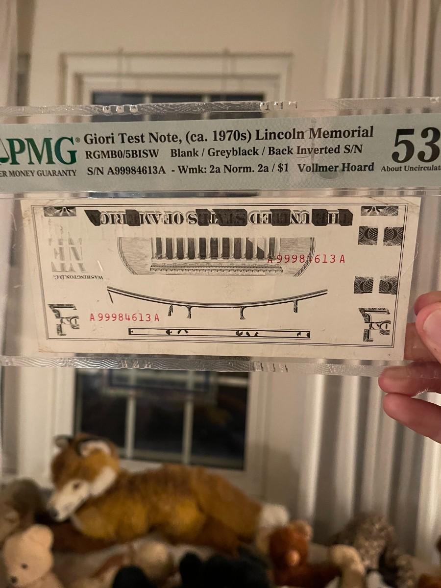 PMG Cert. Giori test note circa 1970's Lincoln Memorial 53 about unc.