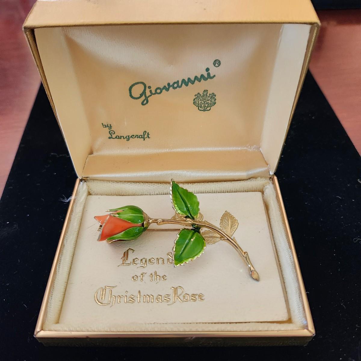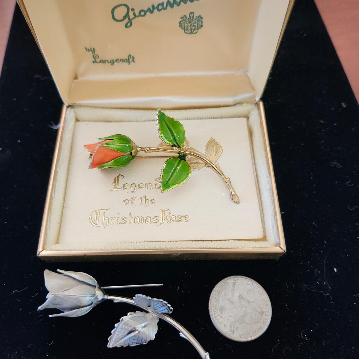 Vintage rose pins from Giovanni byRosecraft, original box. One is silvertone, one is coral enamel. Legend of the the Christmas Rose card included. ~ 2.75 inches long.