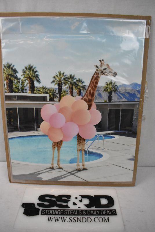 Giraffe Photo Print: 16x20 Giraffe with Balloons, Pool, Palm Trees. No frame