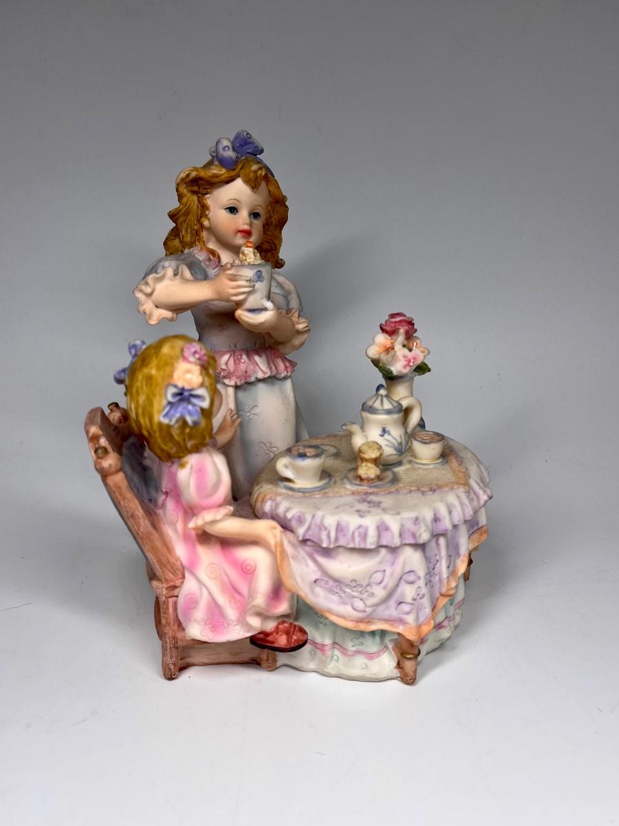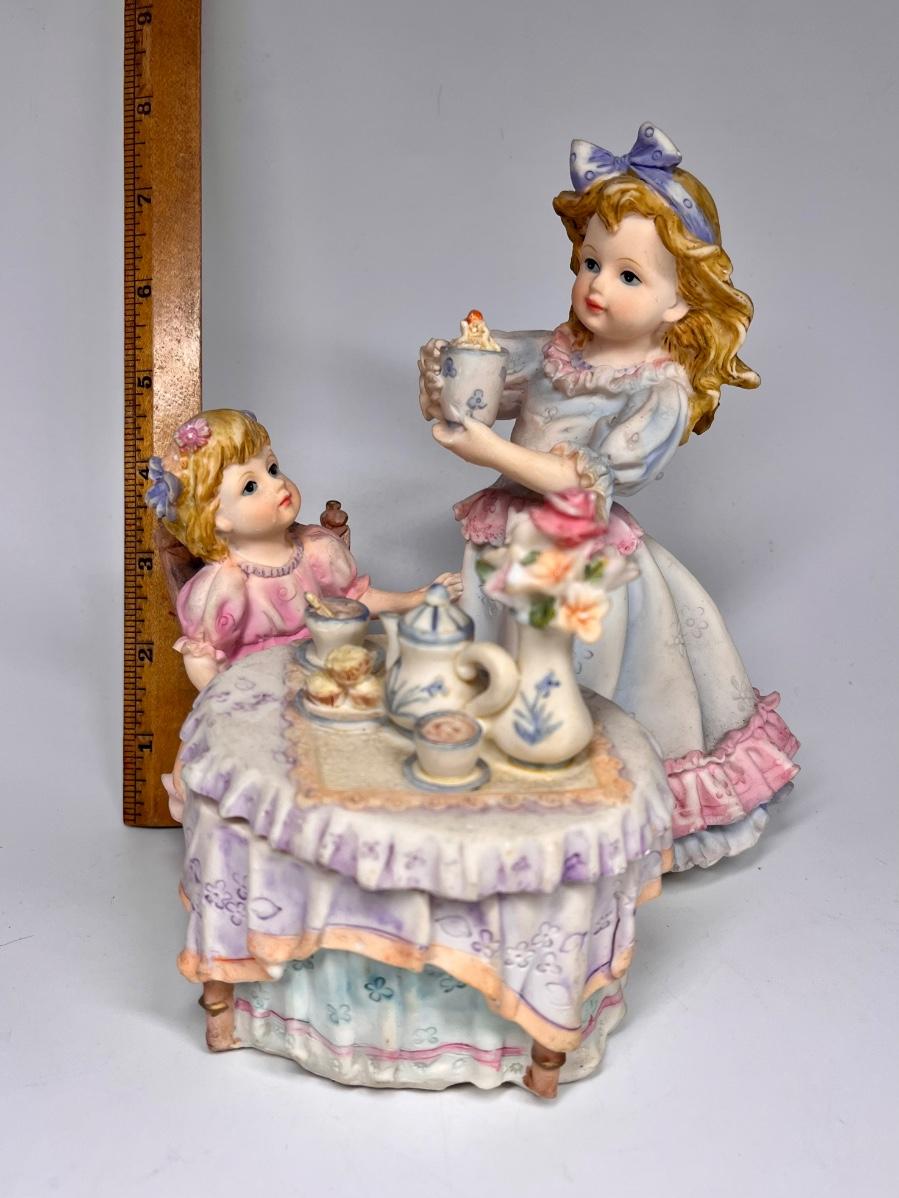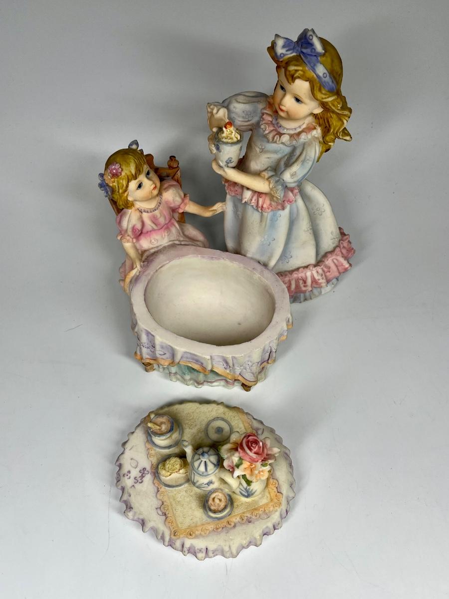 Girls Playing Tea Party Figurine Trinket Box. In good condition. Tabletop is trinket box lid.