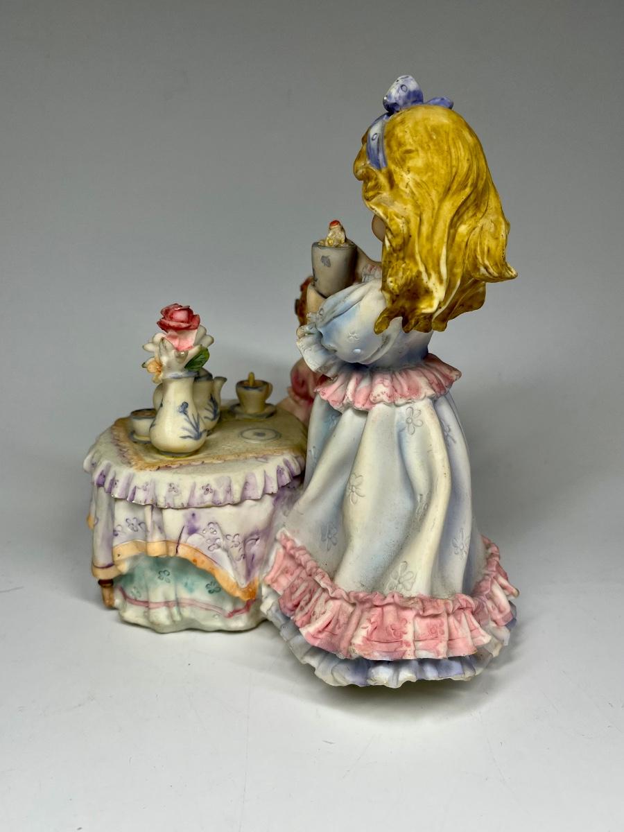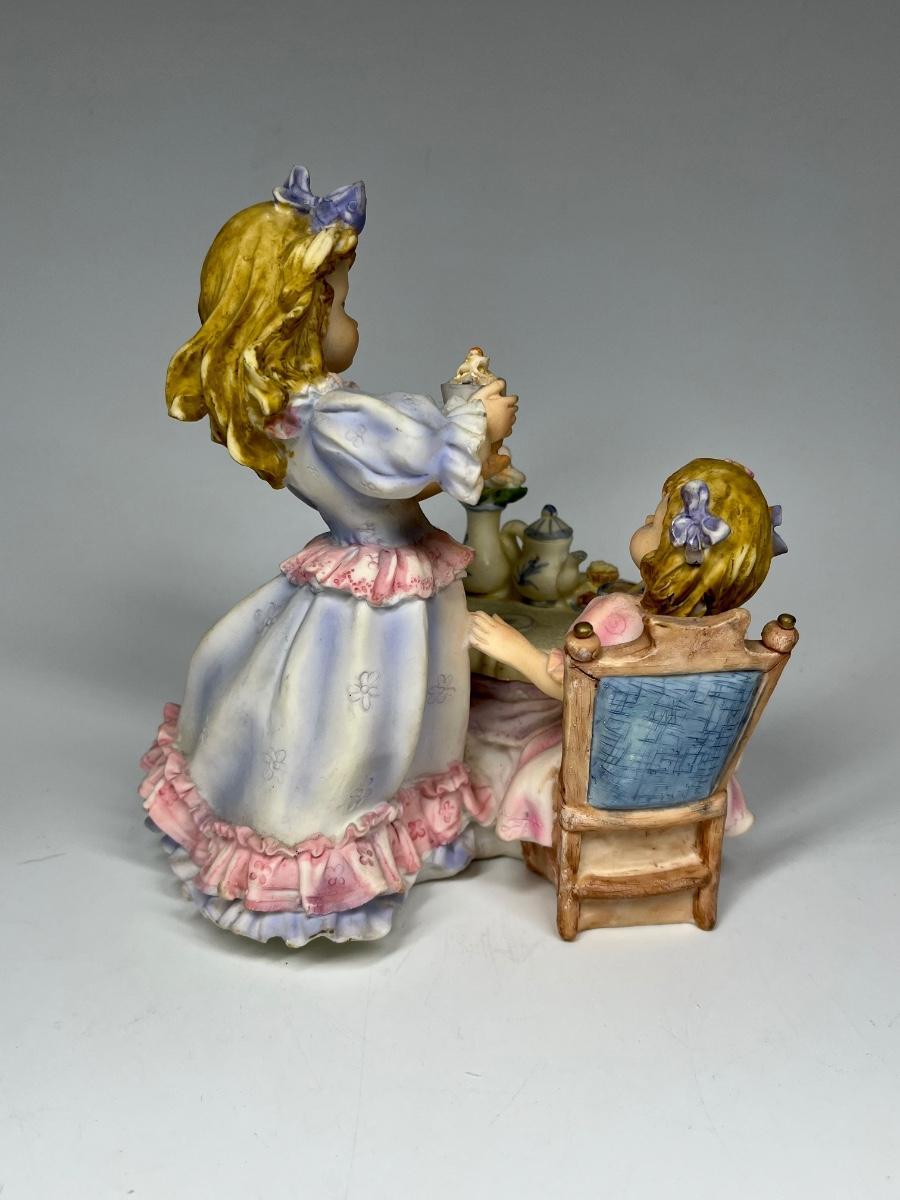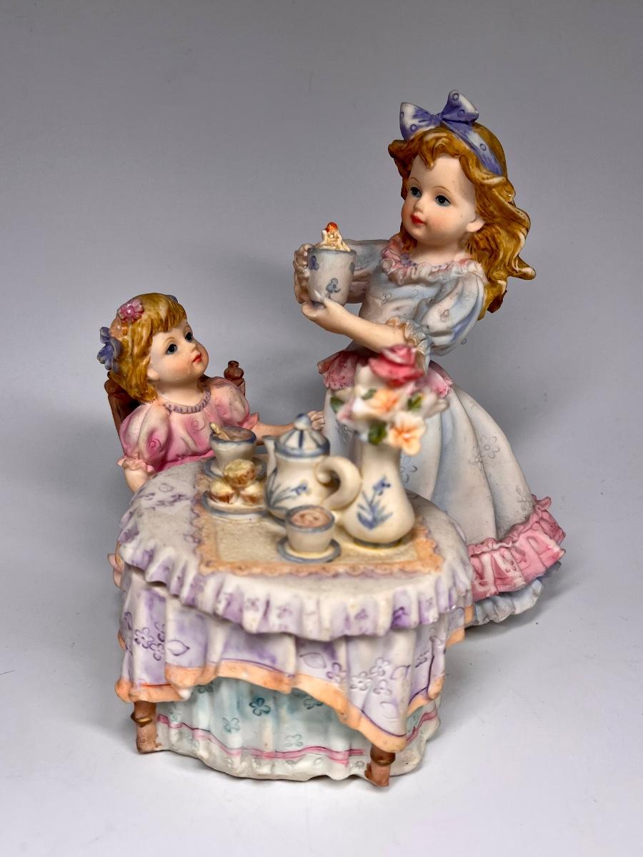 Girls Playing Tea Party Figurine Trinket Box. In good condition. Tabletop is trinket box lid.