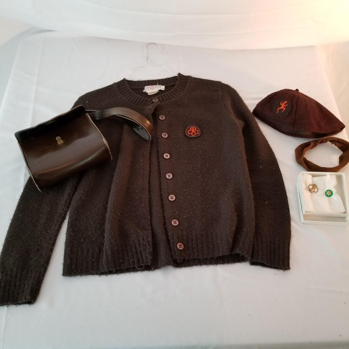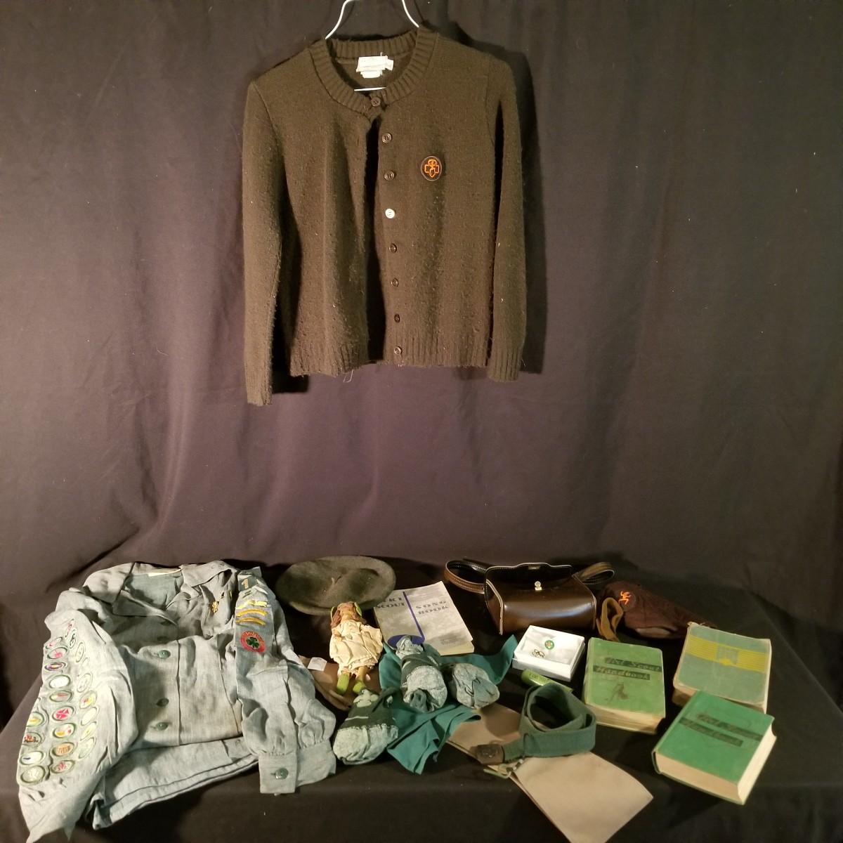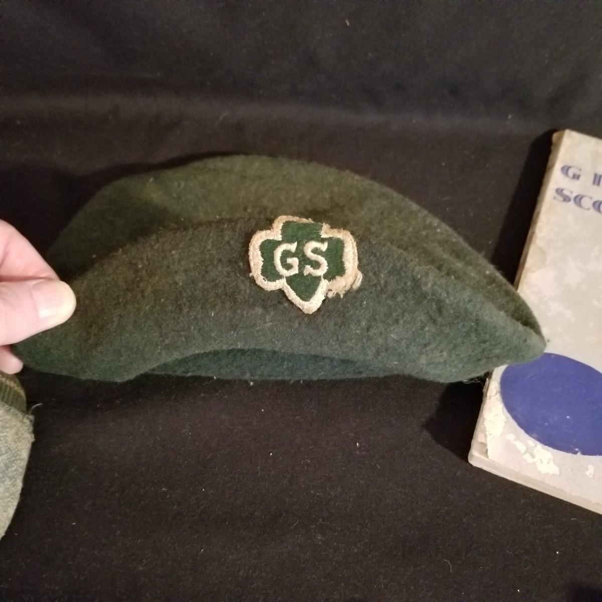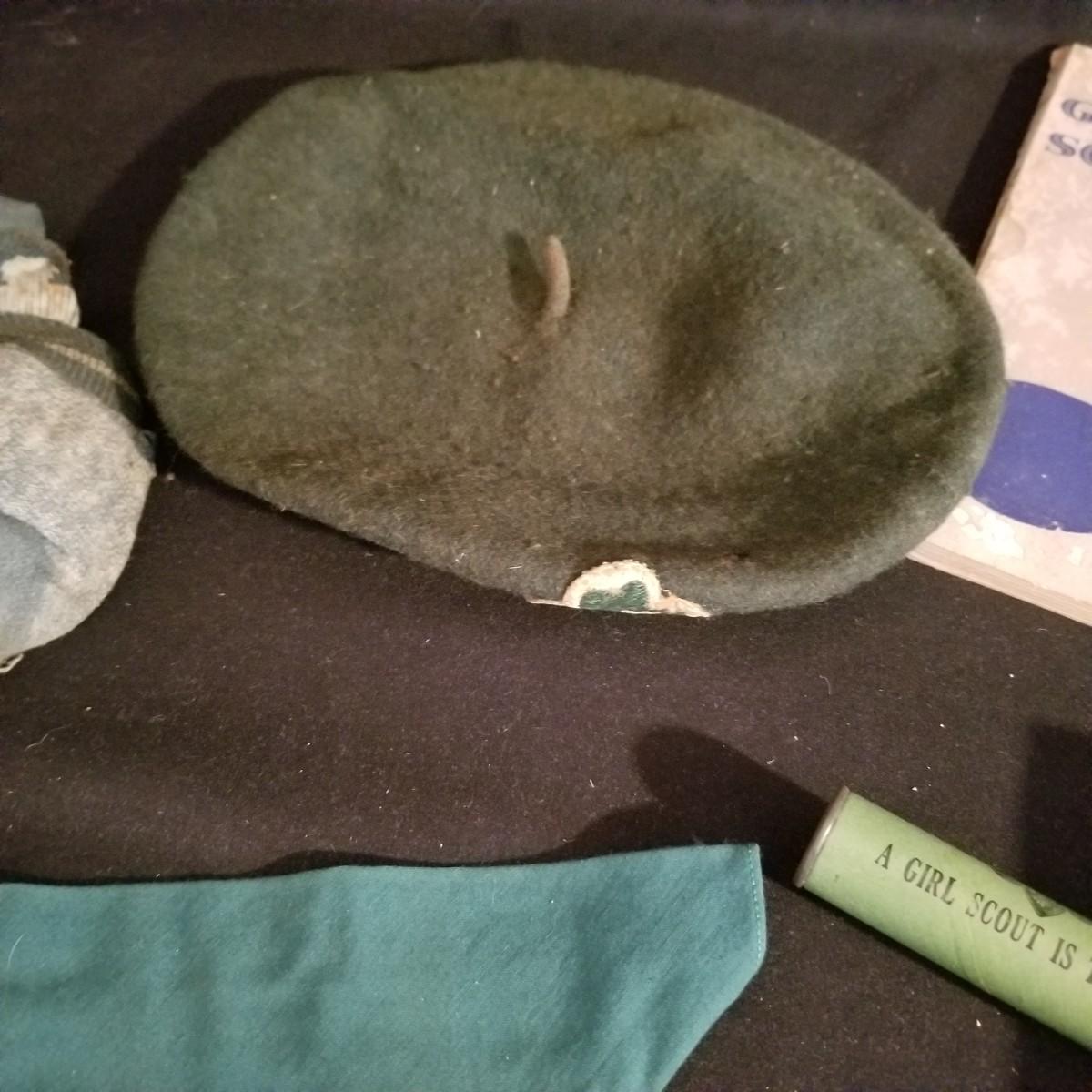 Vintage Girl Scout items. Sweater, scarf, beanie, pins. Handbooks, dress with pins and merit badges, beret, belt, songbook, scarves. See photos for details. Shipping available.