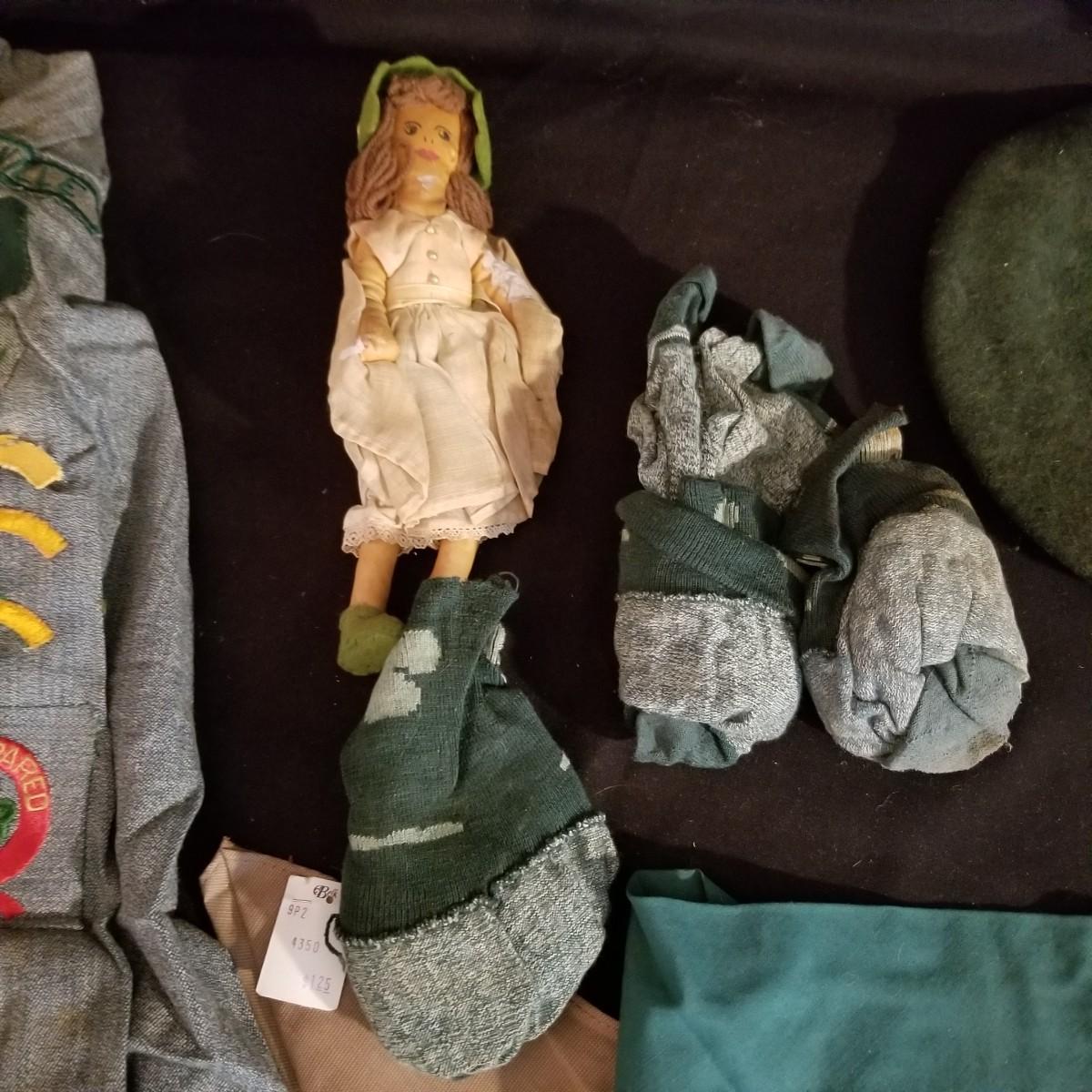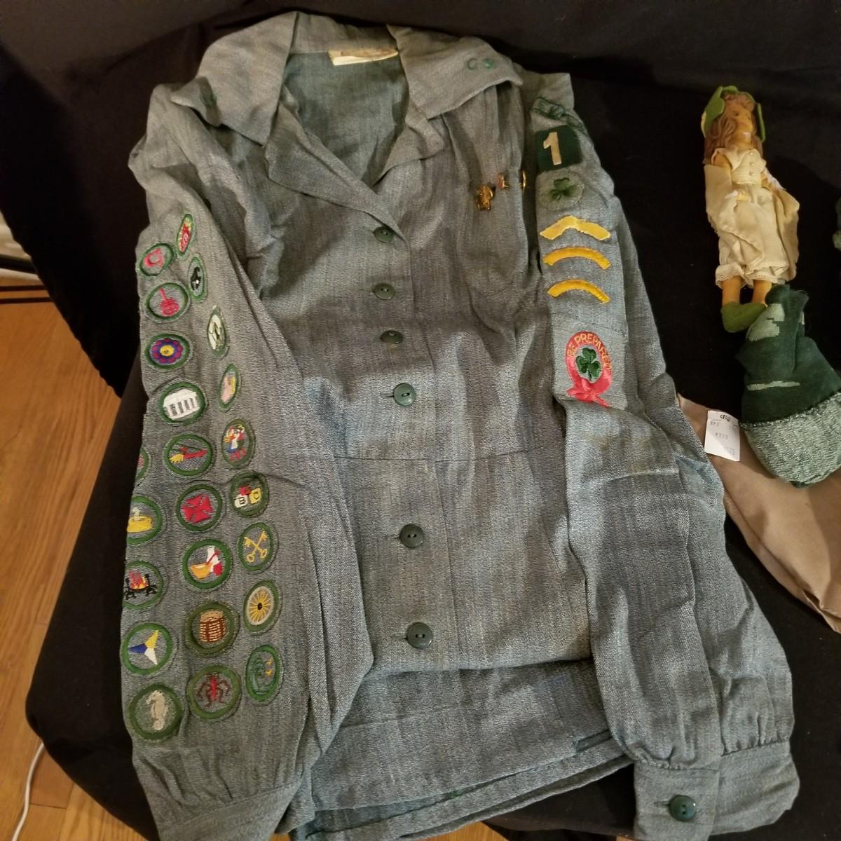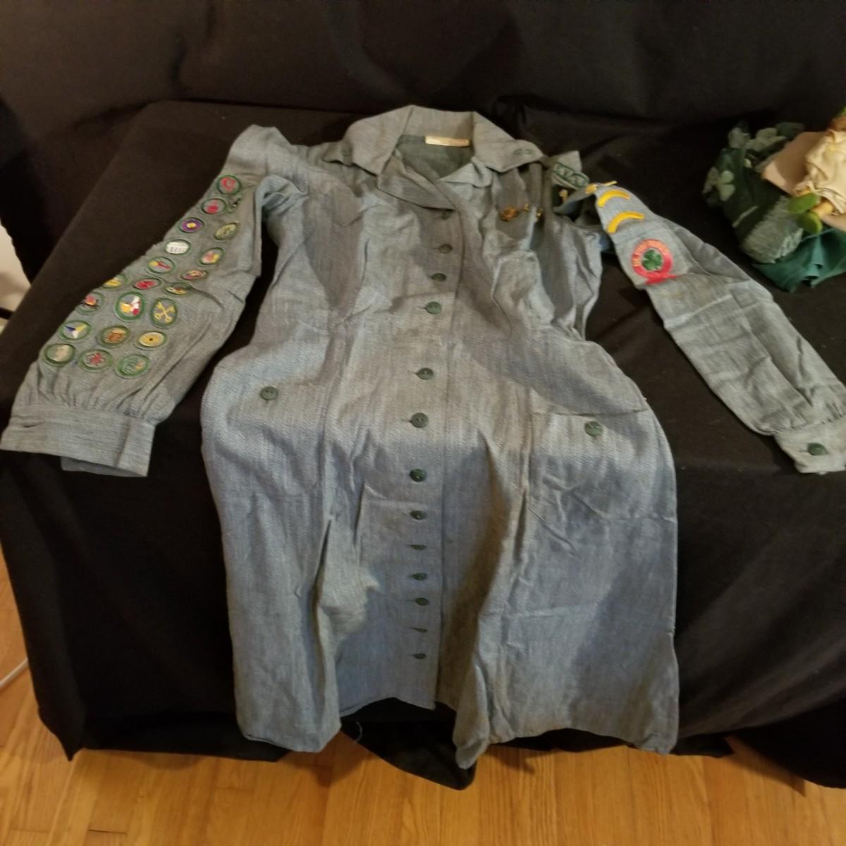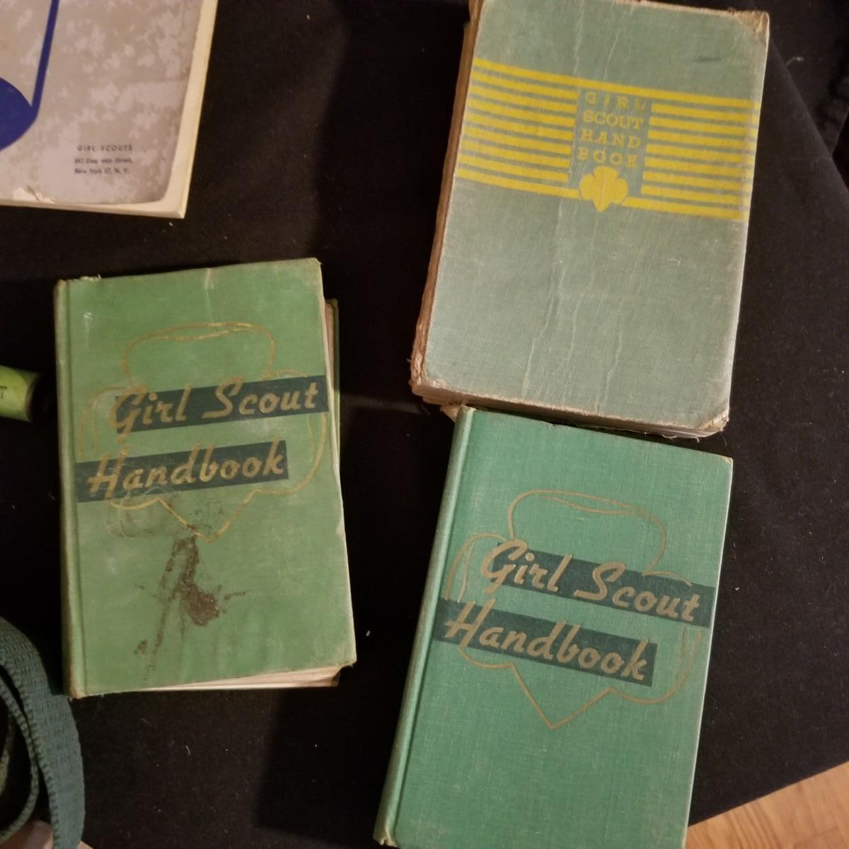Vintage Girl Scout items. Sweater, scarf, beanie, pins. Handbooks, dress with pins and merit badges, beret, belt, songbook, scarves. See photos for details. Shipping available.