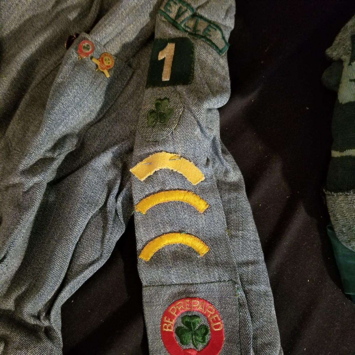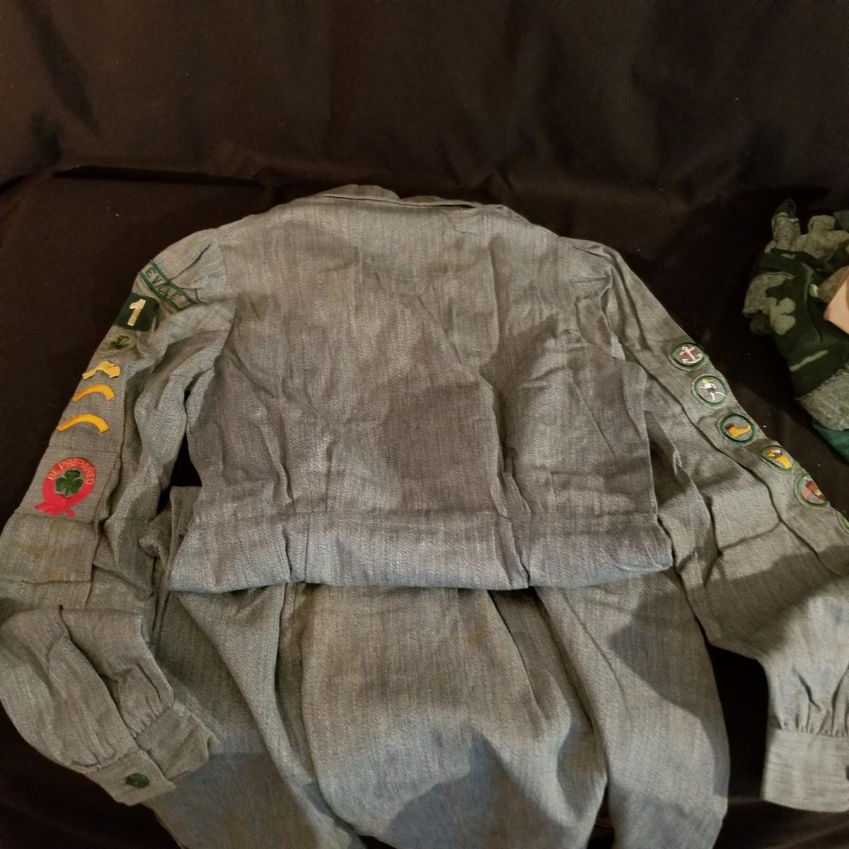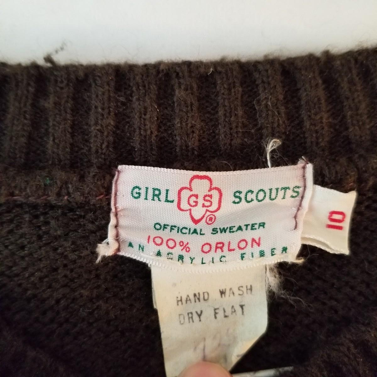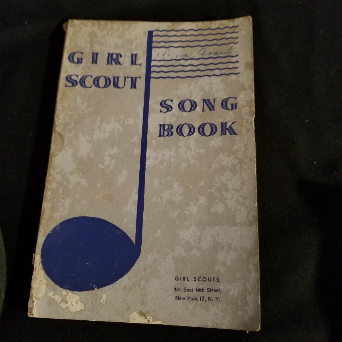 Vintage Girl Scout items. Sweater, scarf, beanie, pins. Handbooks, dress with pins and merit badges, beret, belt, songbook, scarves. See photos for details. Shipping available.