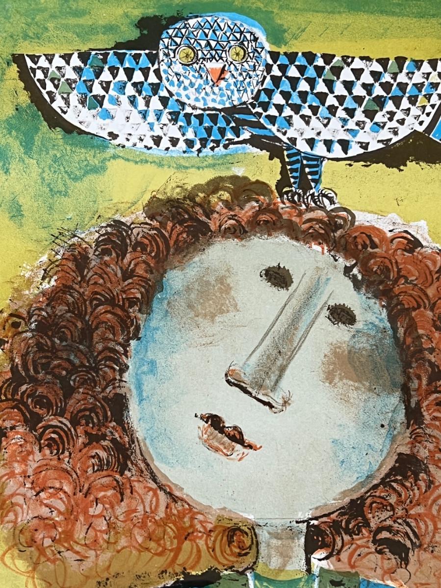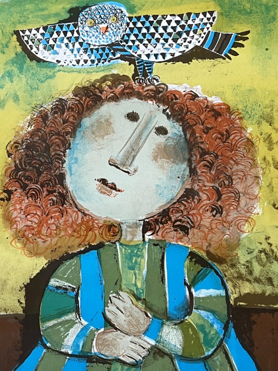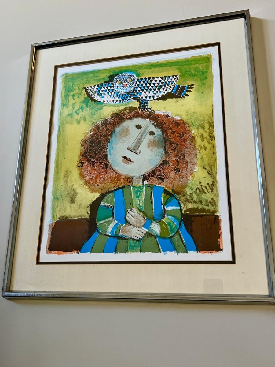 DESCRIPTION: The subject item is a limited edition color lithograph by noted and listed French artist, Graciela Boulanger. The artist has rendered a portrait of a young red headed girl with a small owl perched on her head. The artist is most famous for these whimsical images of young people engaged in recreational activities