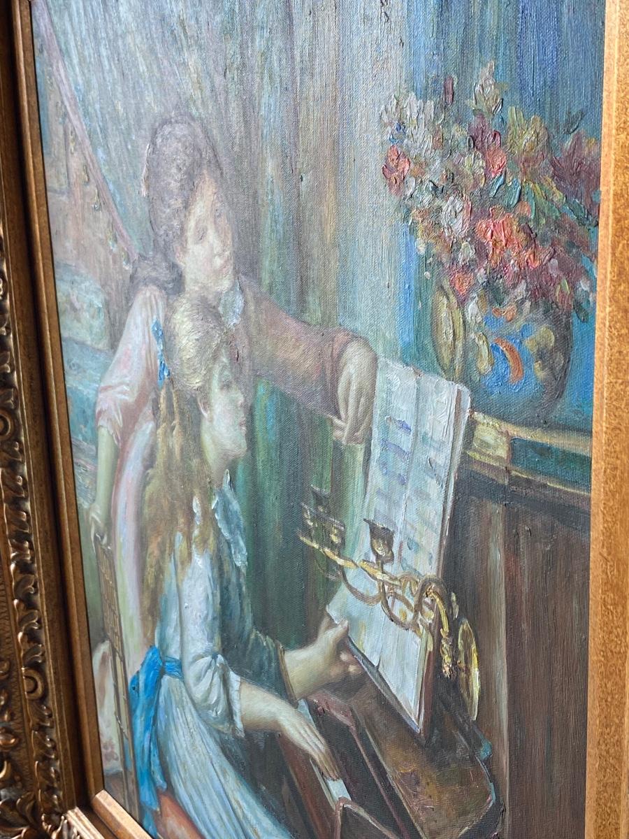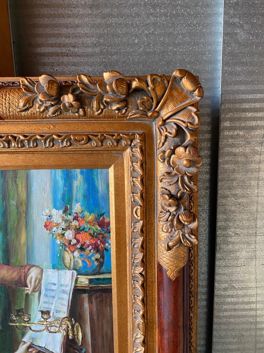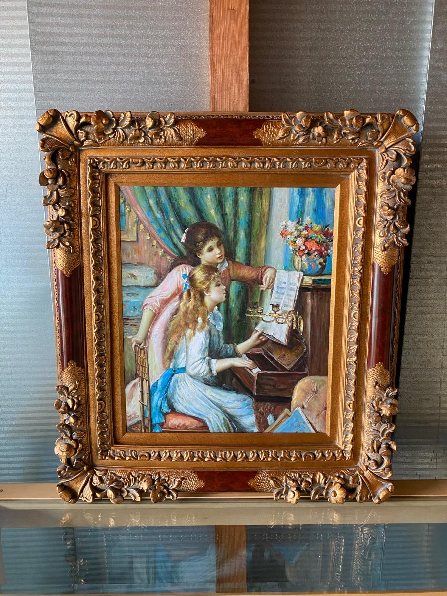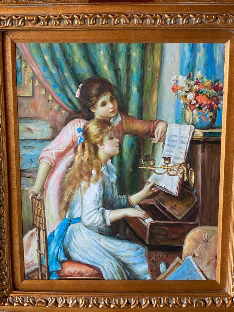 Girls at the Piano Renoir Reproduction Lithograph Framed Wall Art. Ornate gold accented wood frame. Signed Stevens as it is a litho reproduction piece. About 32"x36" size. Frame was originally made to go either direction when hanging, great for repurposing.
