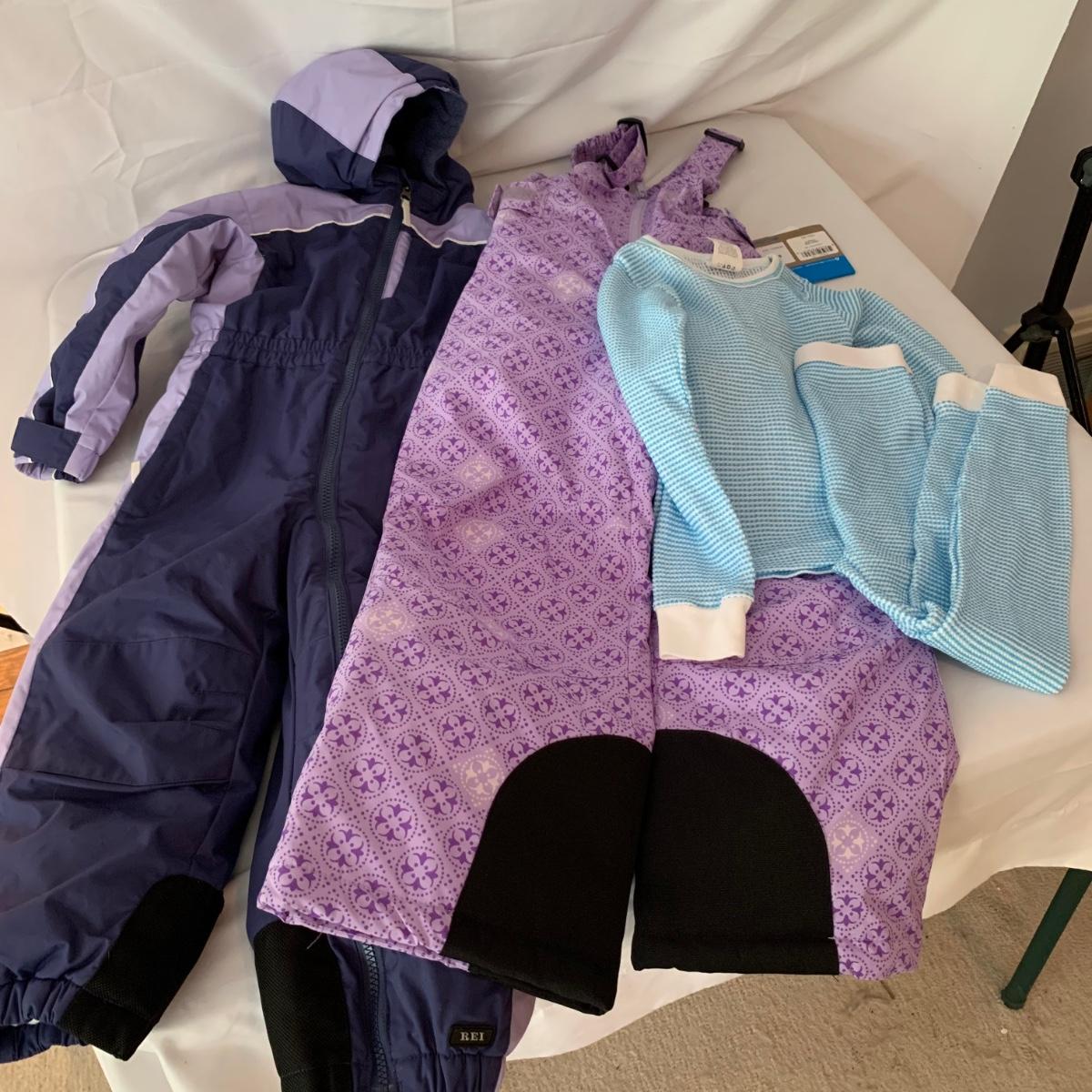 This lot includes a new with tags Columbia ski overall, an REI ski suit, and a set of Indera long johns. The Columbia ski overalls and the long johns are both size 6, while the REI suit is a size 4T. The Columbia overalls and the long john set are in excellent condition. The REI suit is in good condition with minor signs of wear. Shipping available.