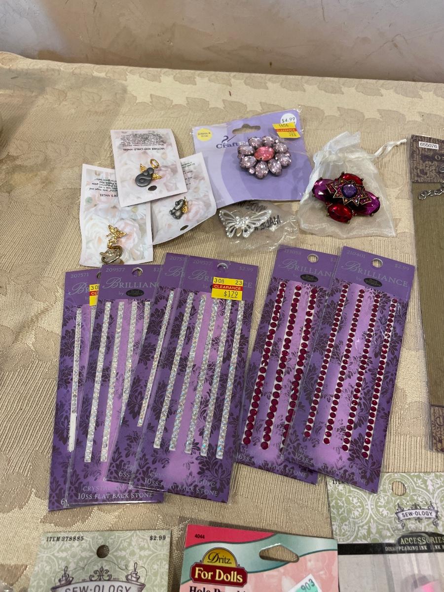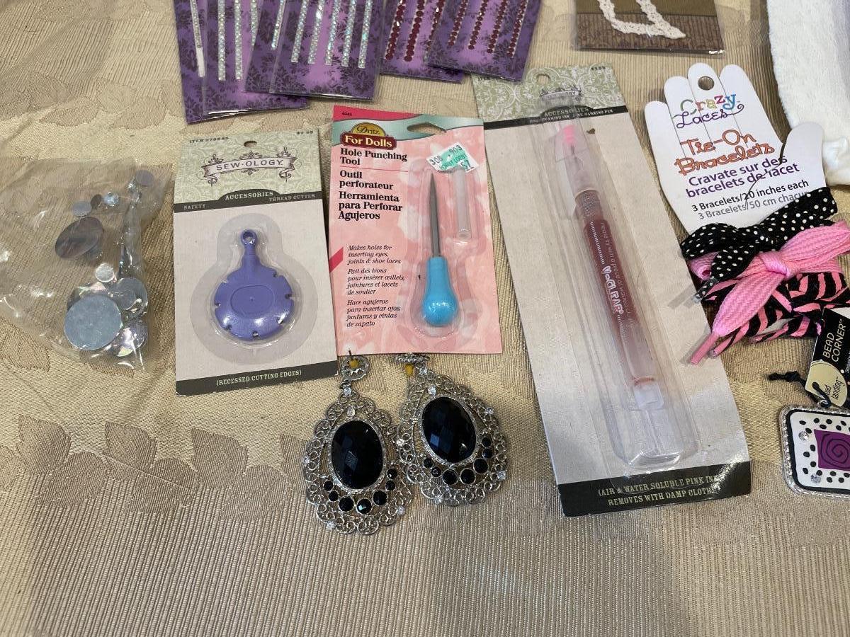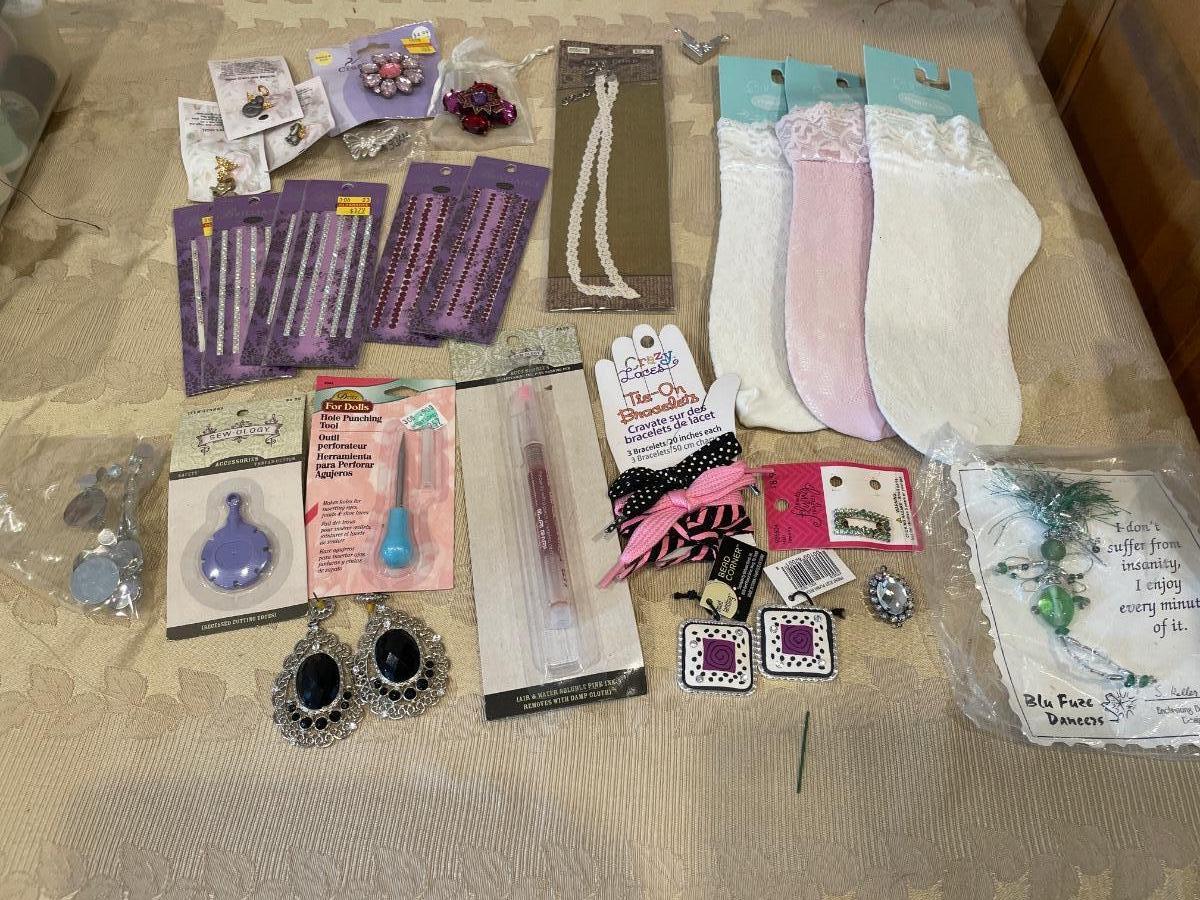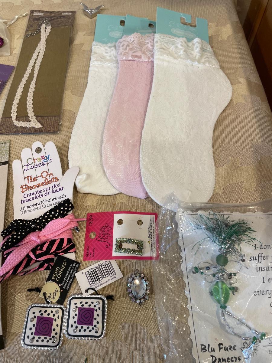 Includes lace socks, earrings, rhinestones, brooches, and pins