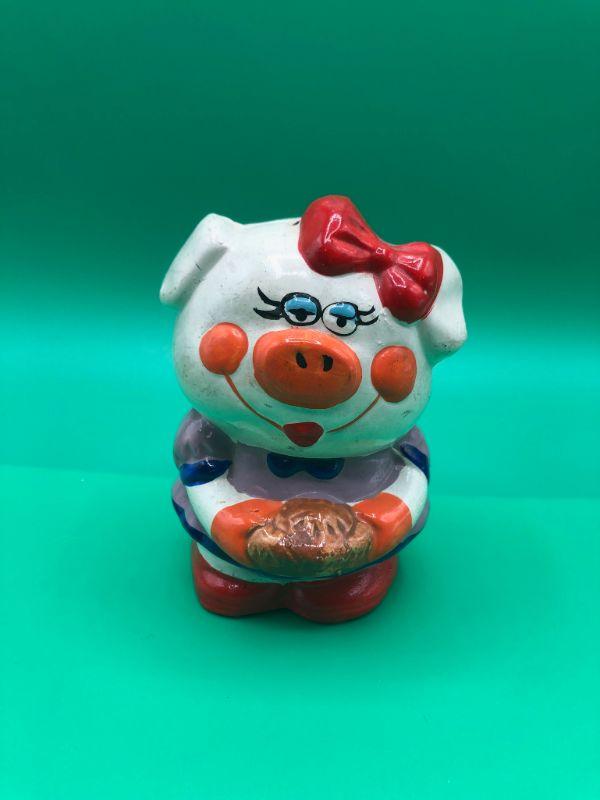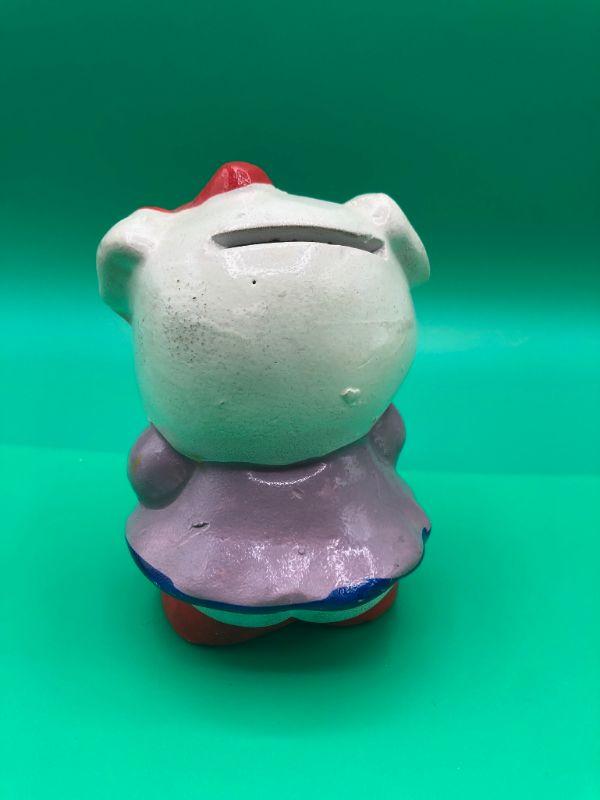 Colorfully painted Girly Pig coin bank. Missing the stopper in the bottom. One of a kind addition to ones collection. Has some smudges, marks, and flaws. No Chips.