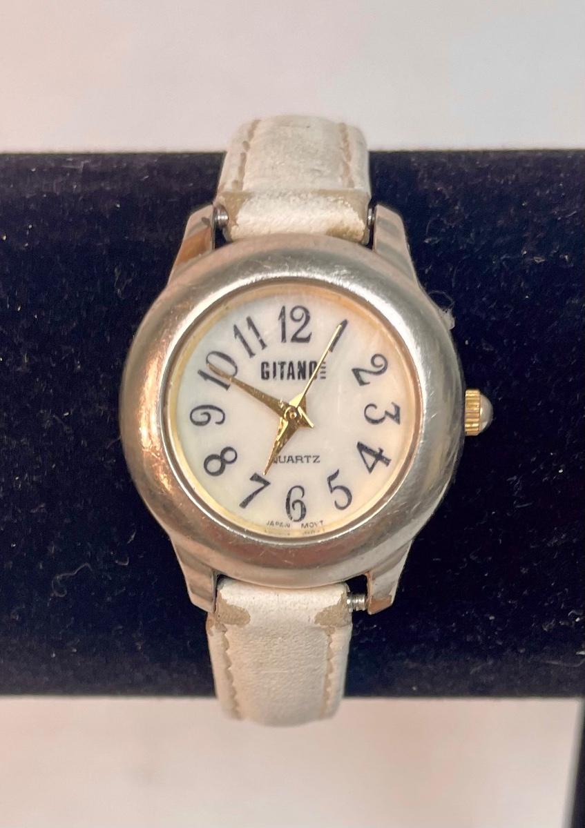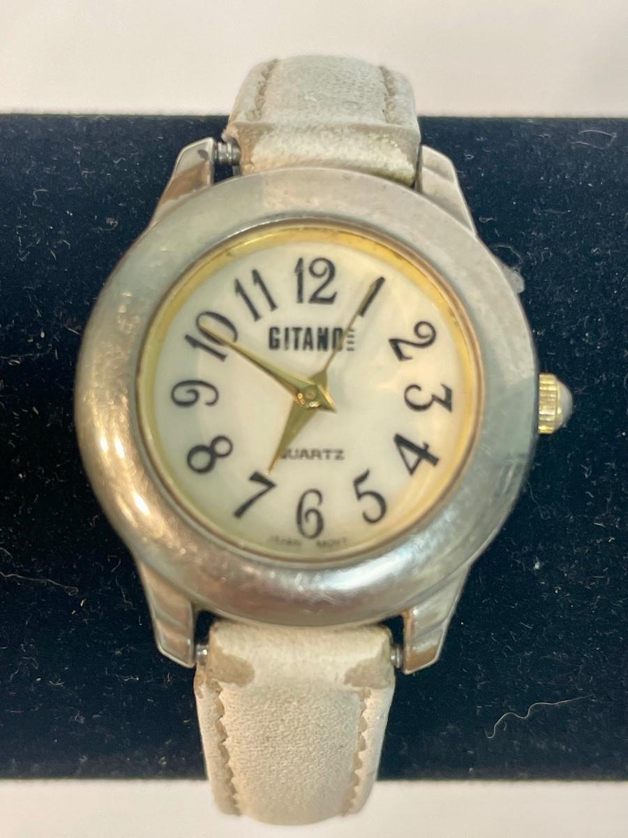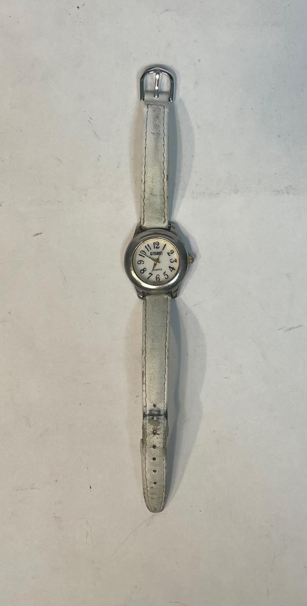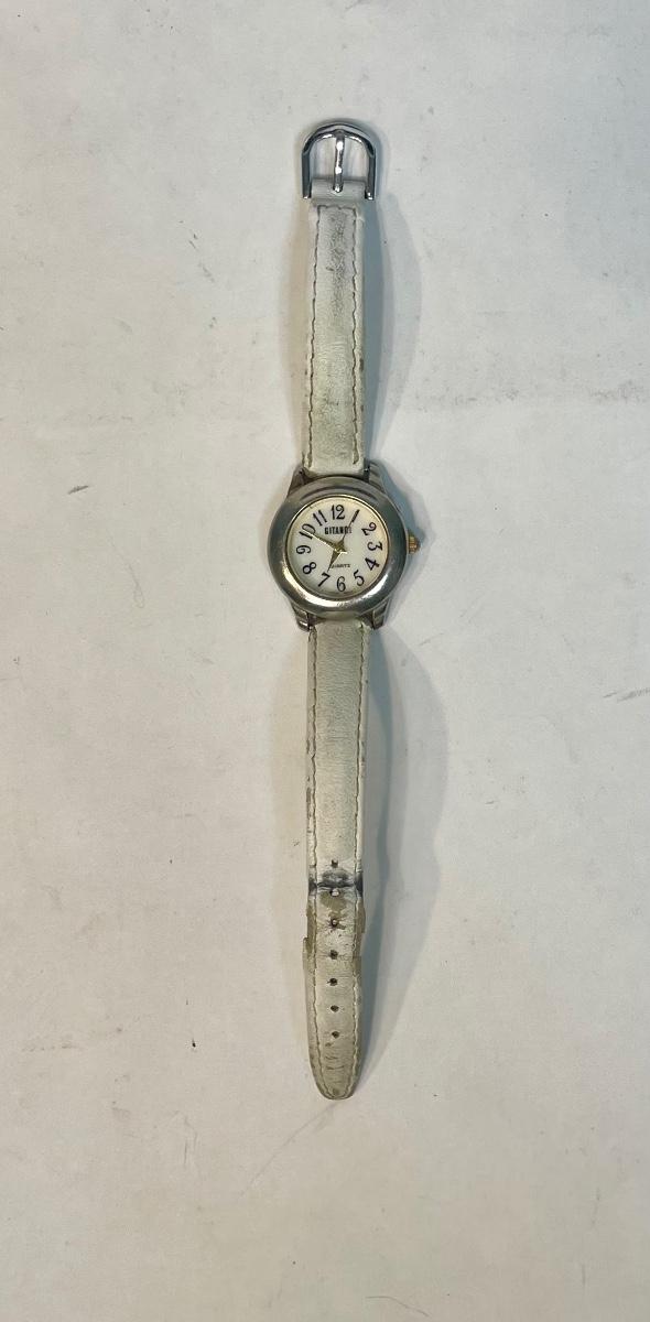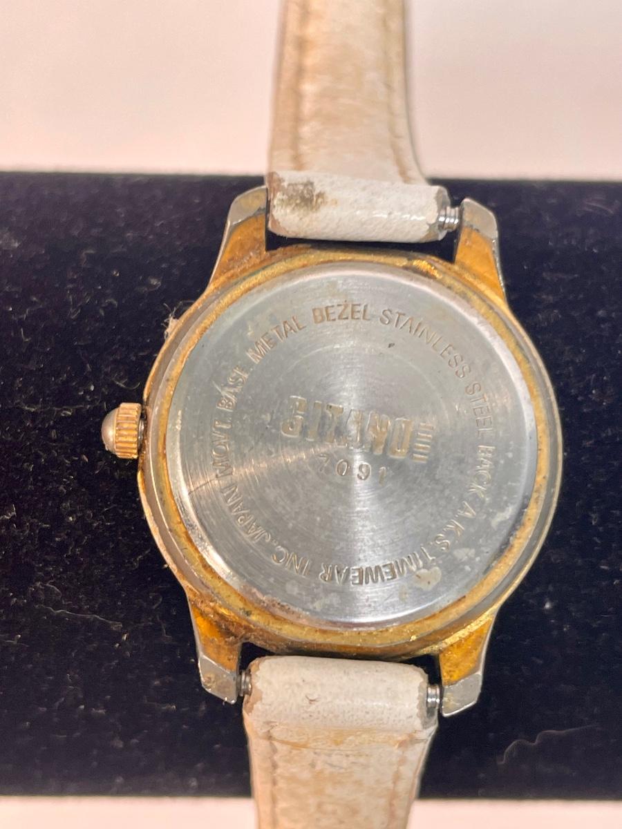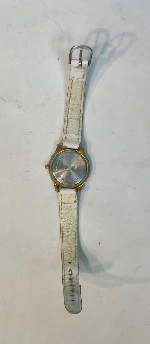 Currently not running, most likely just needs a new battery. Case is approx. 2.6 cm. White dial and strap. No scratches on glass. See photos for other details.