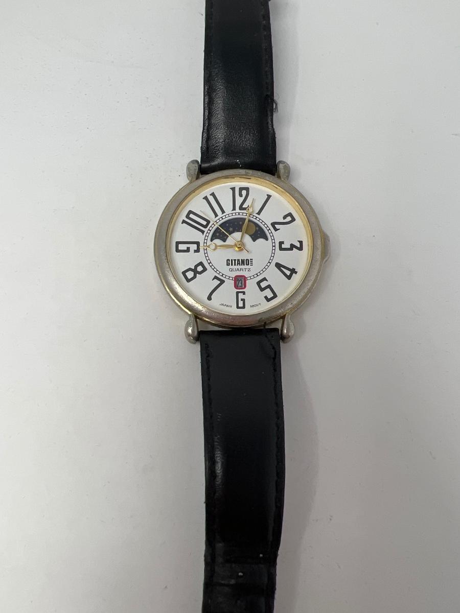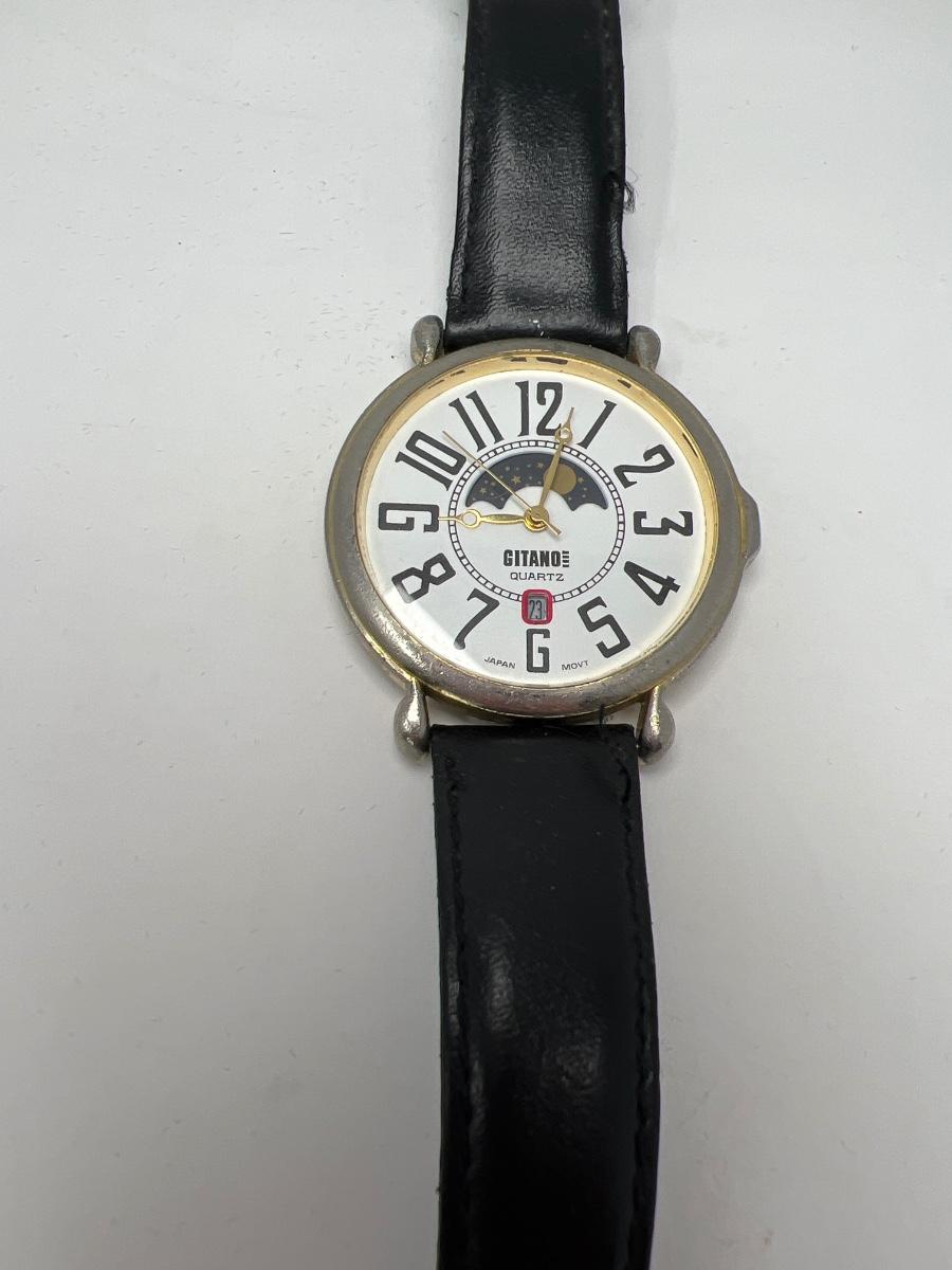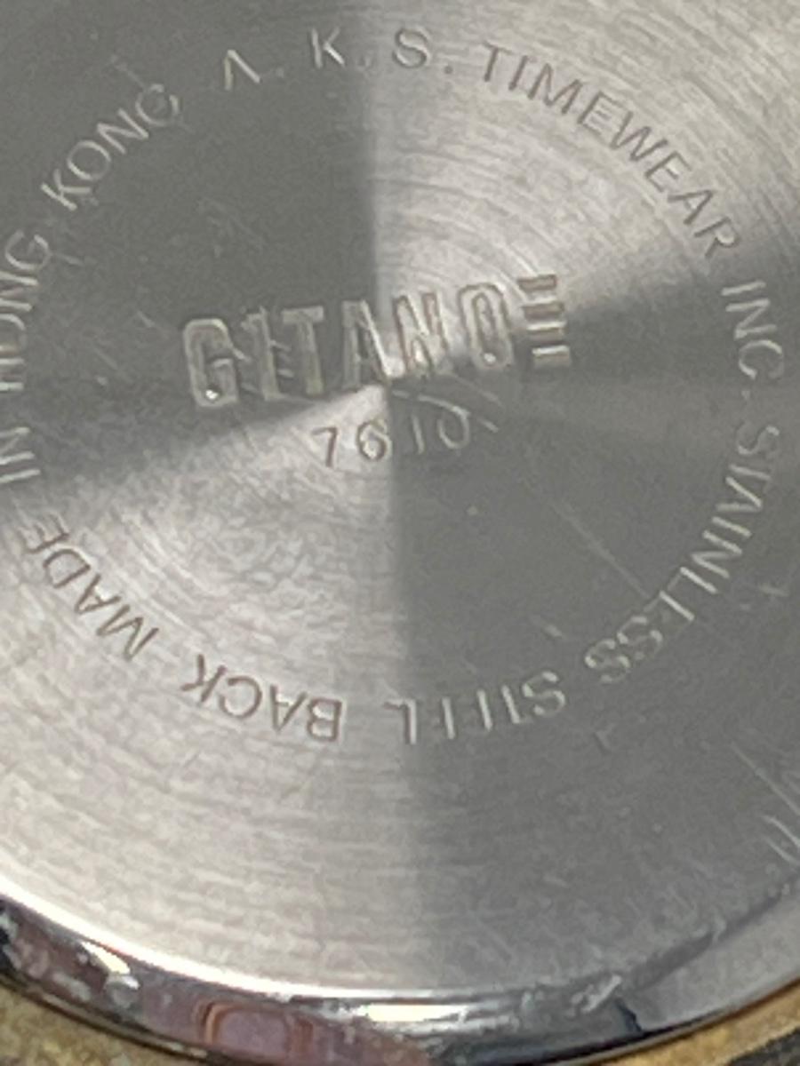 Gitano watch made in Hong Kong. Has Japanese movement. Quartz - needs new battery. Hands and date adjustment function properly. Has a second hand. Bezel is worn. Genuine leather strap.