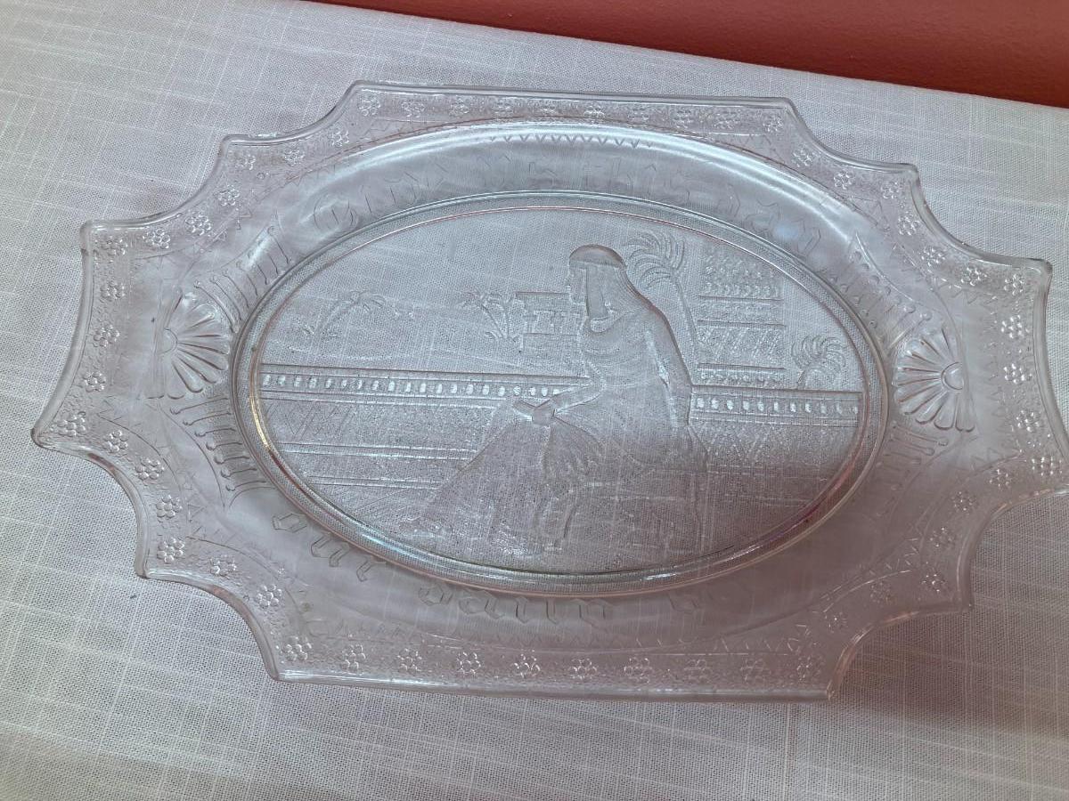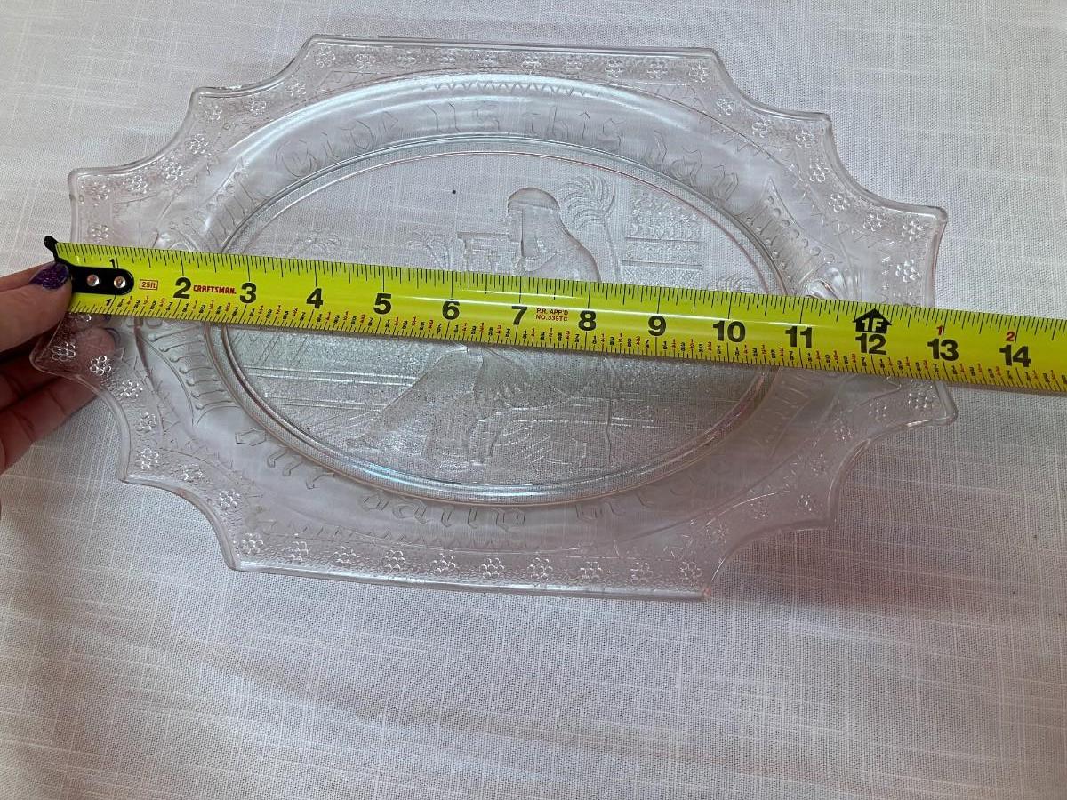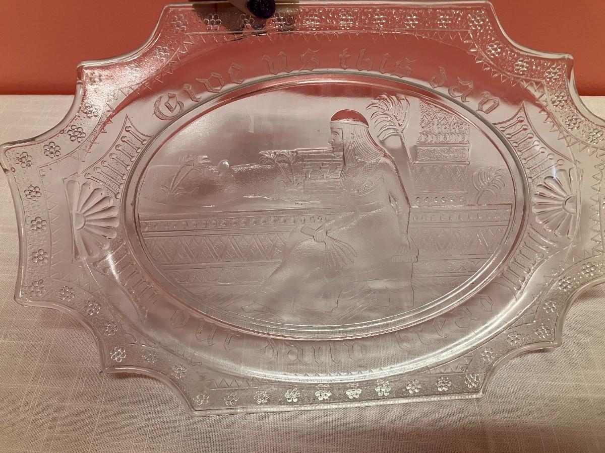 13" W clear glass plate/platter with etched Egyptian picture with inscription "Give us this day our daily bread"