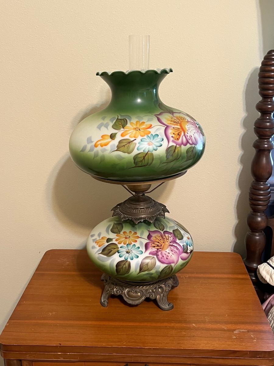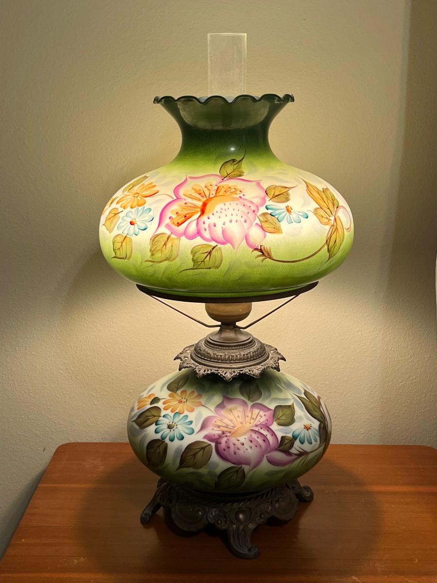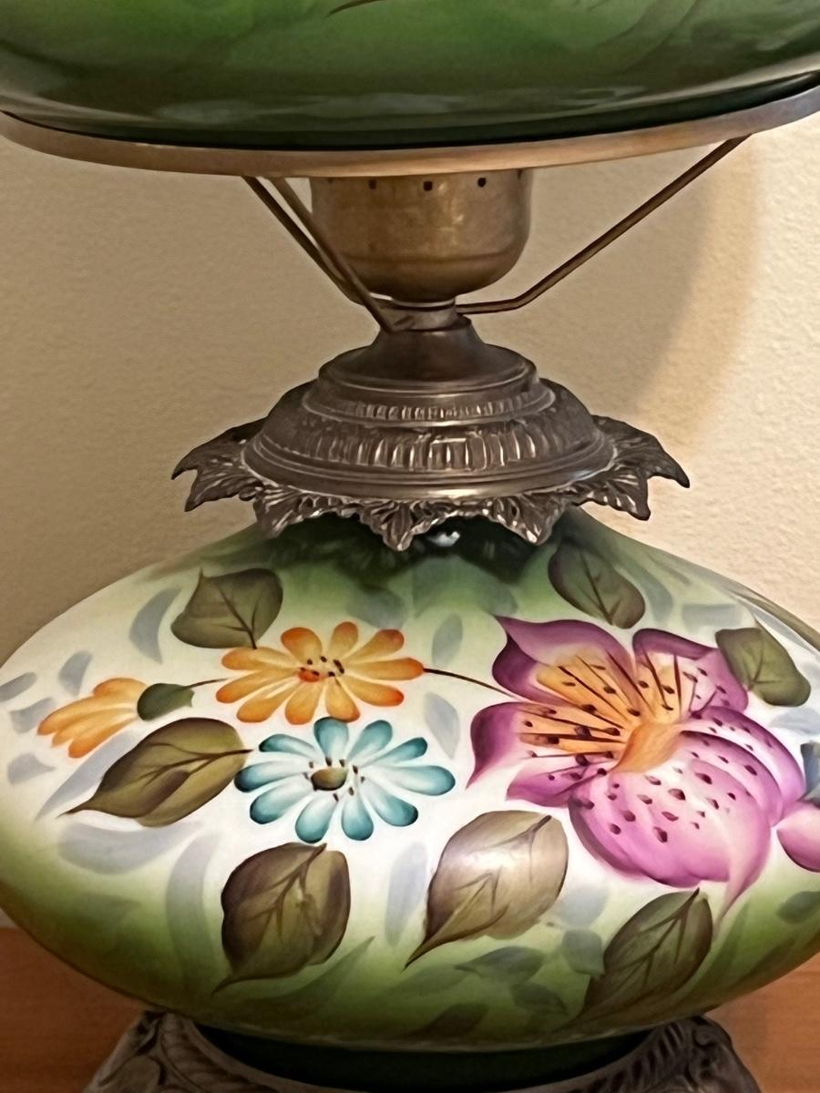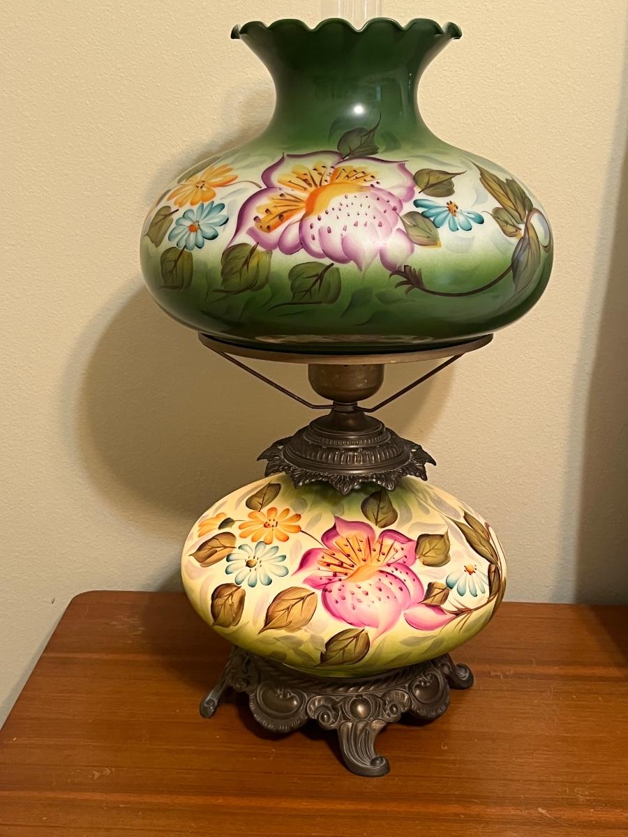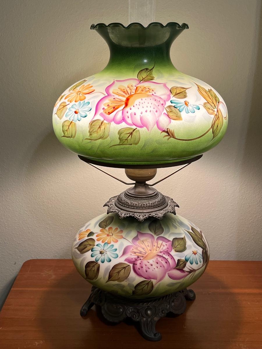 Vintage Hand Painted Electric Hurricane ~ Milk Glass & Brass Lamp