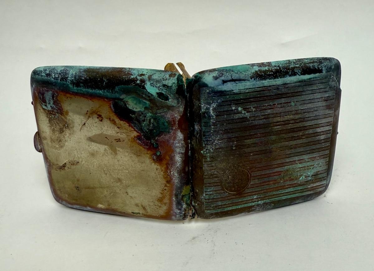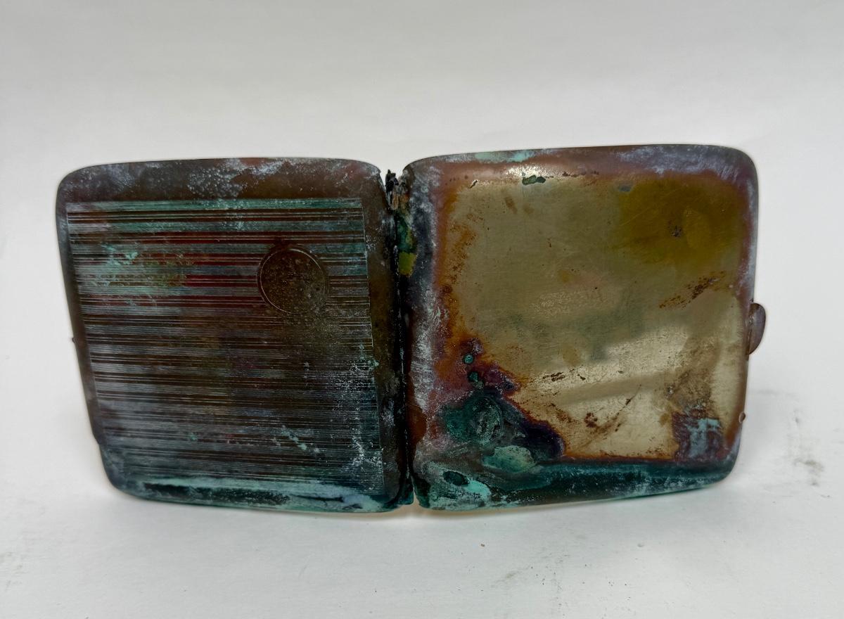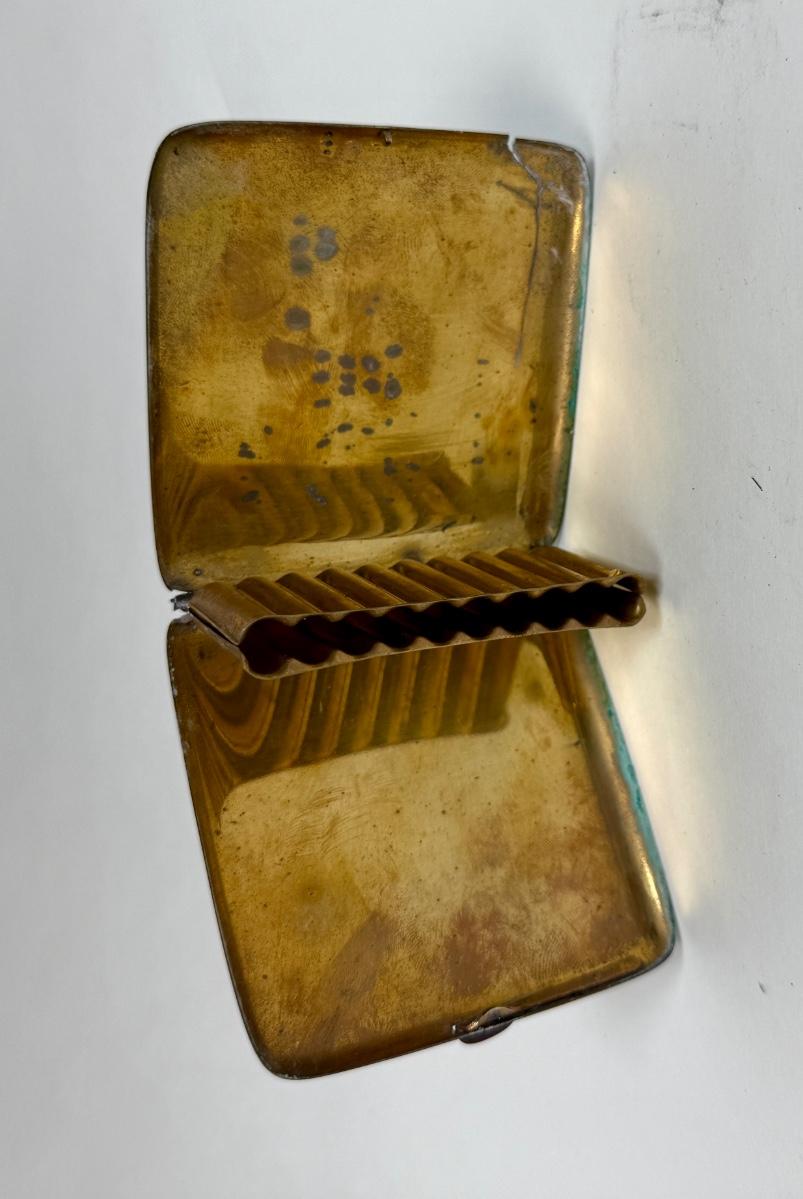 External surfaces are suffering from corrosion, much of the silver-plate is gone. Insides are very clean. Irregular crack on the case top. Designed to hold 10 cigarettes.