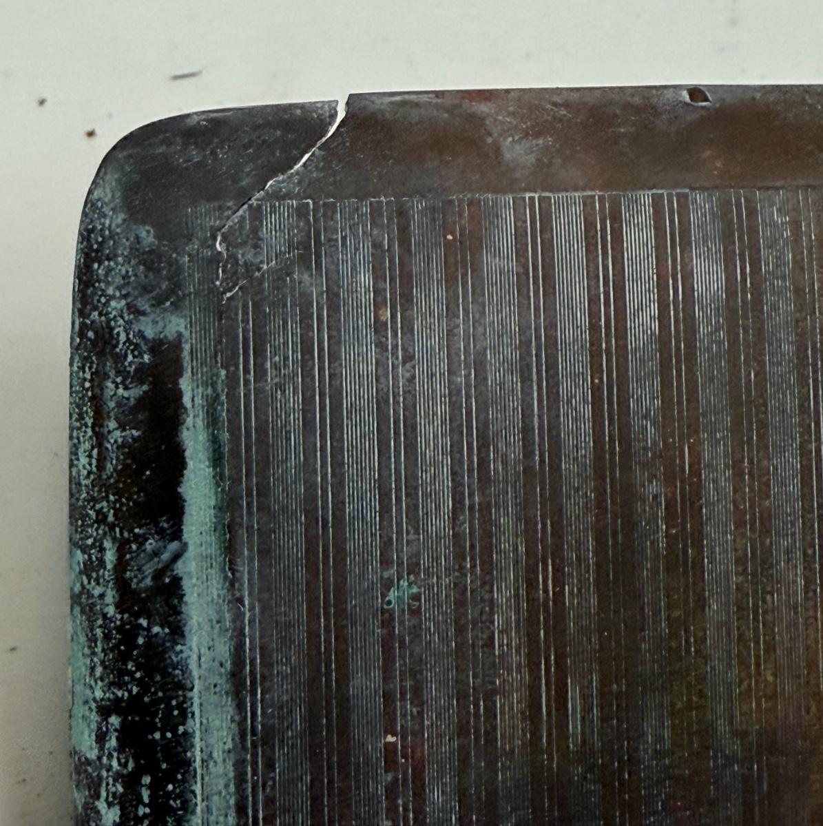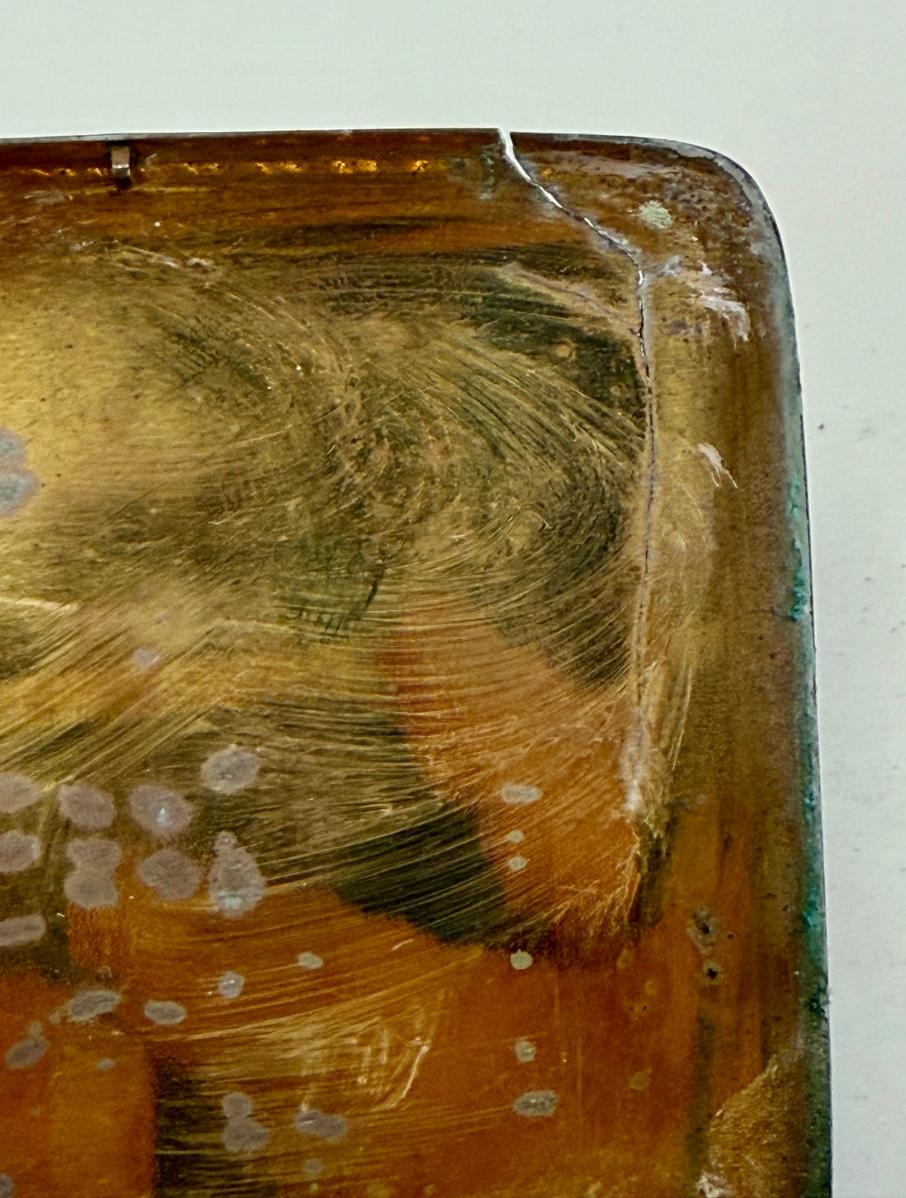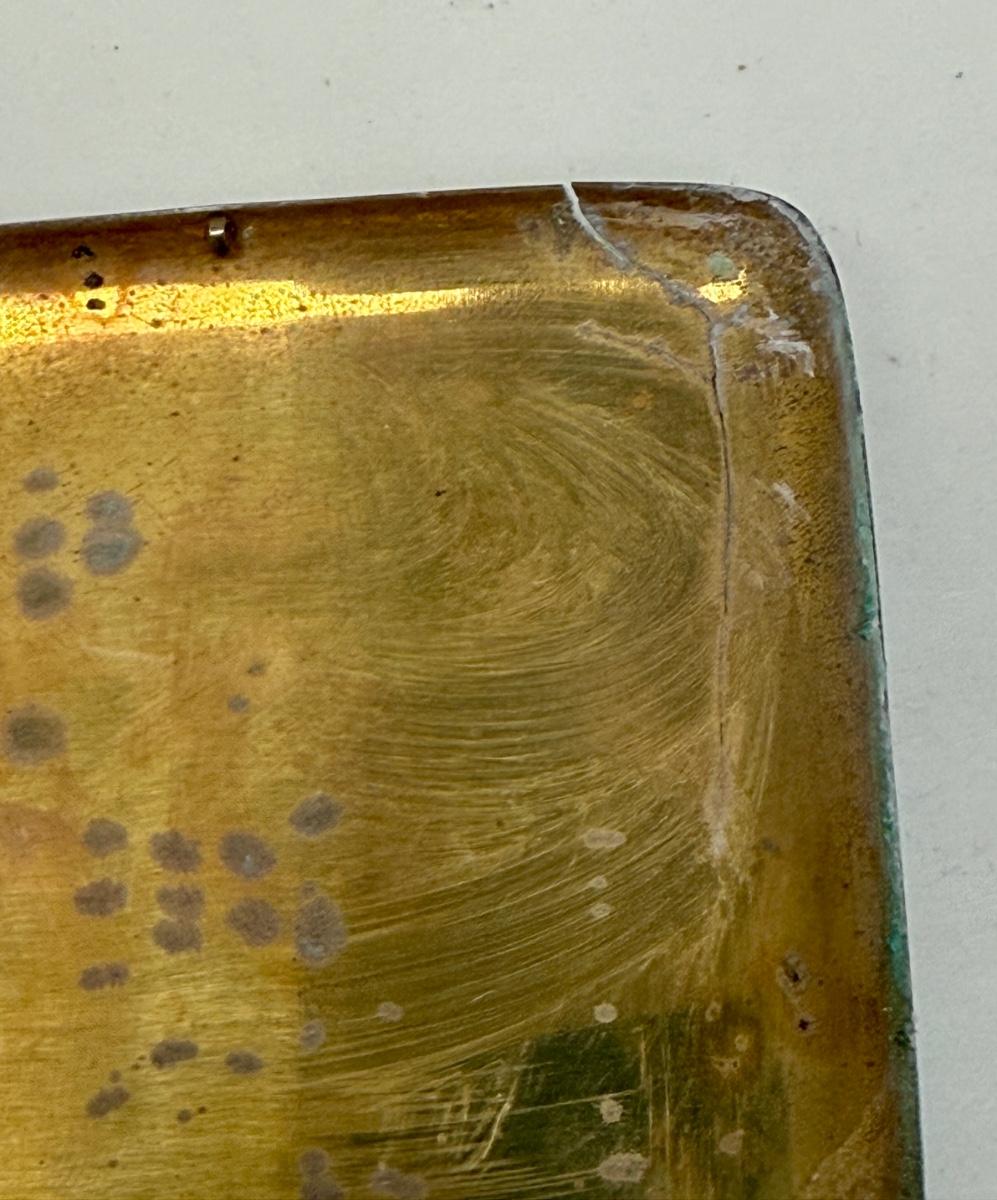 External surfaces are suffering from corrosion, much of the silver-plate is gone. Insides are very clean. Irregular crack on the case top. Designed to hold 10 cigarettes.