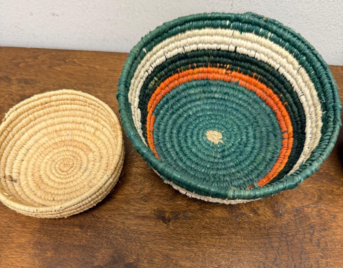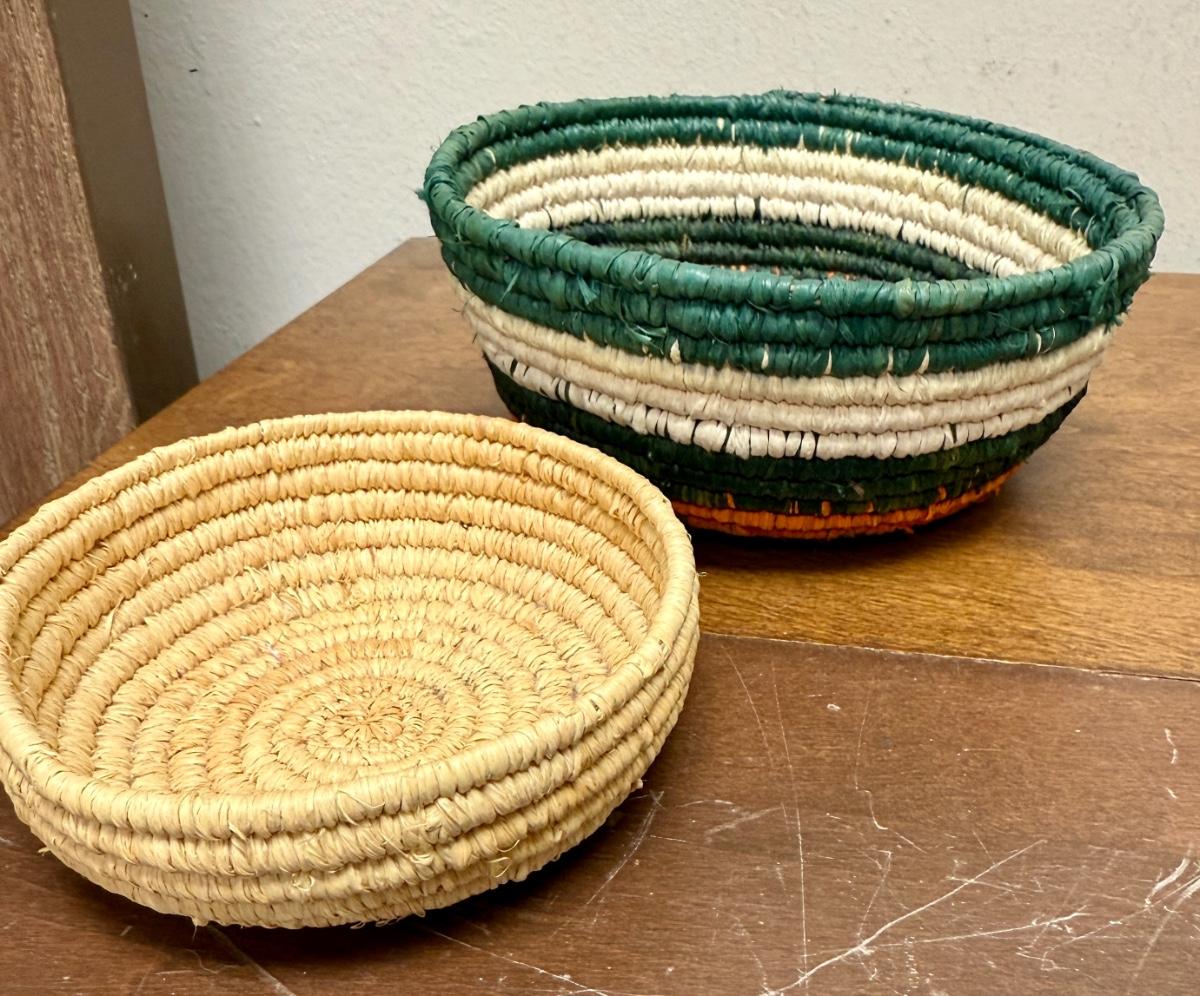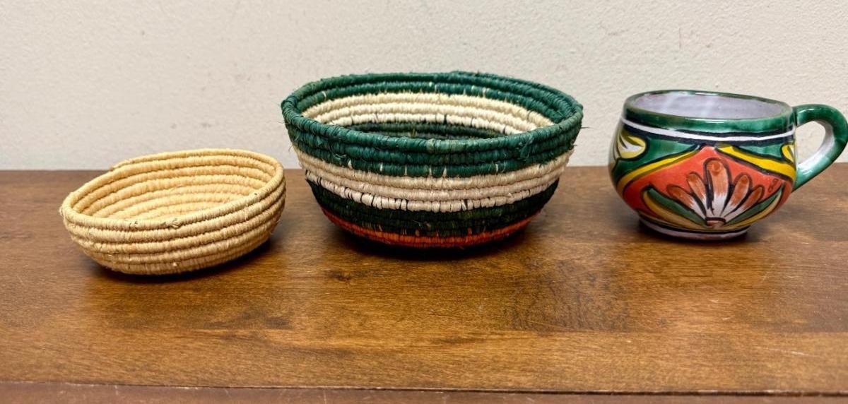 2 Handmade Round Bowl Shaped Woven Baskets and 1 Ceramic Cup