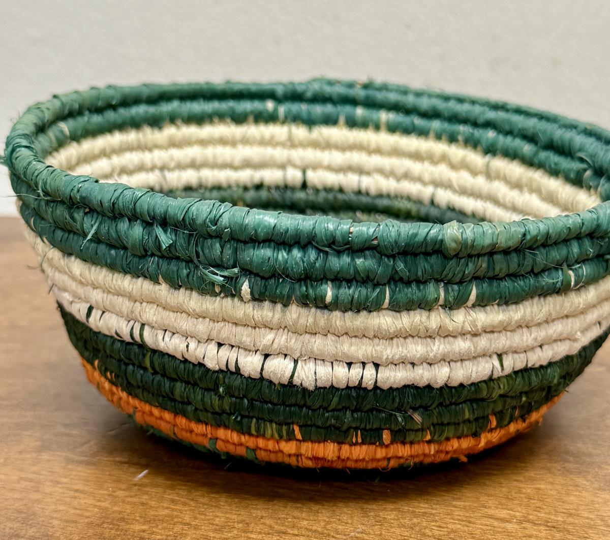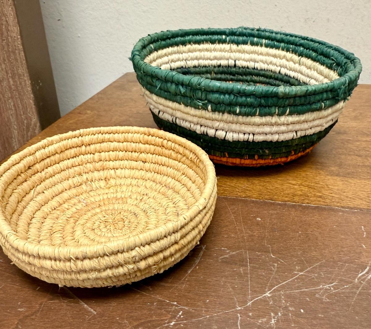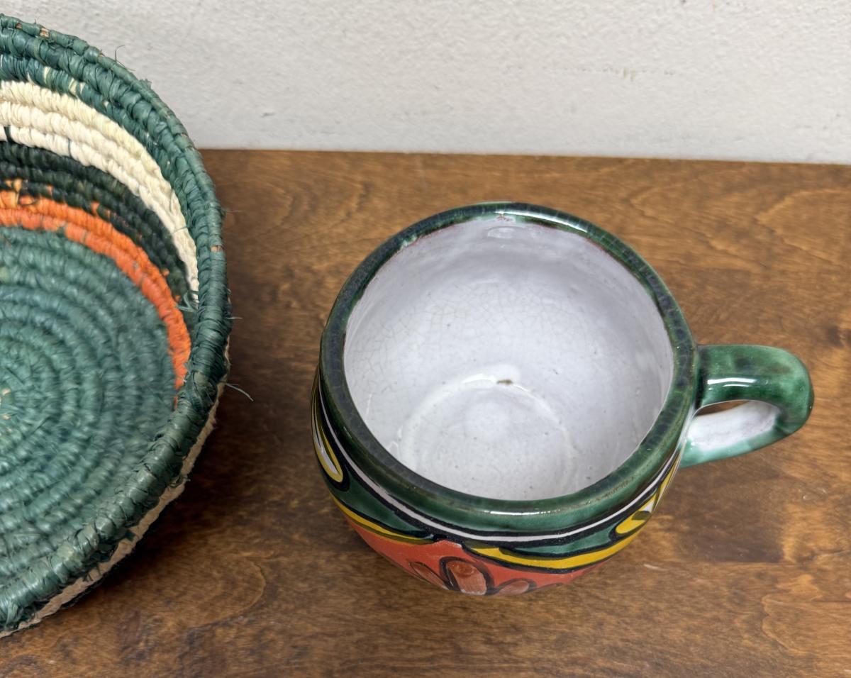 2 Handmade Round Bowl Shaped Woven Baskets and 1 Ceramic Cup