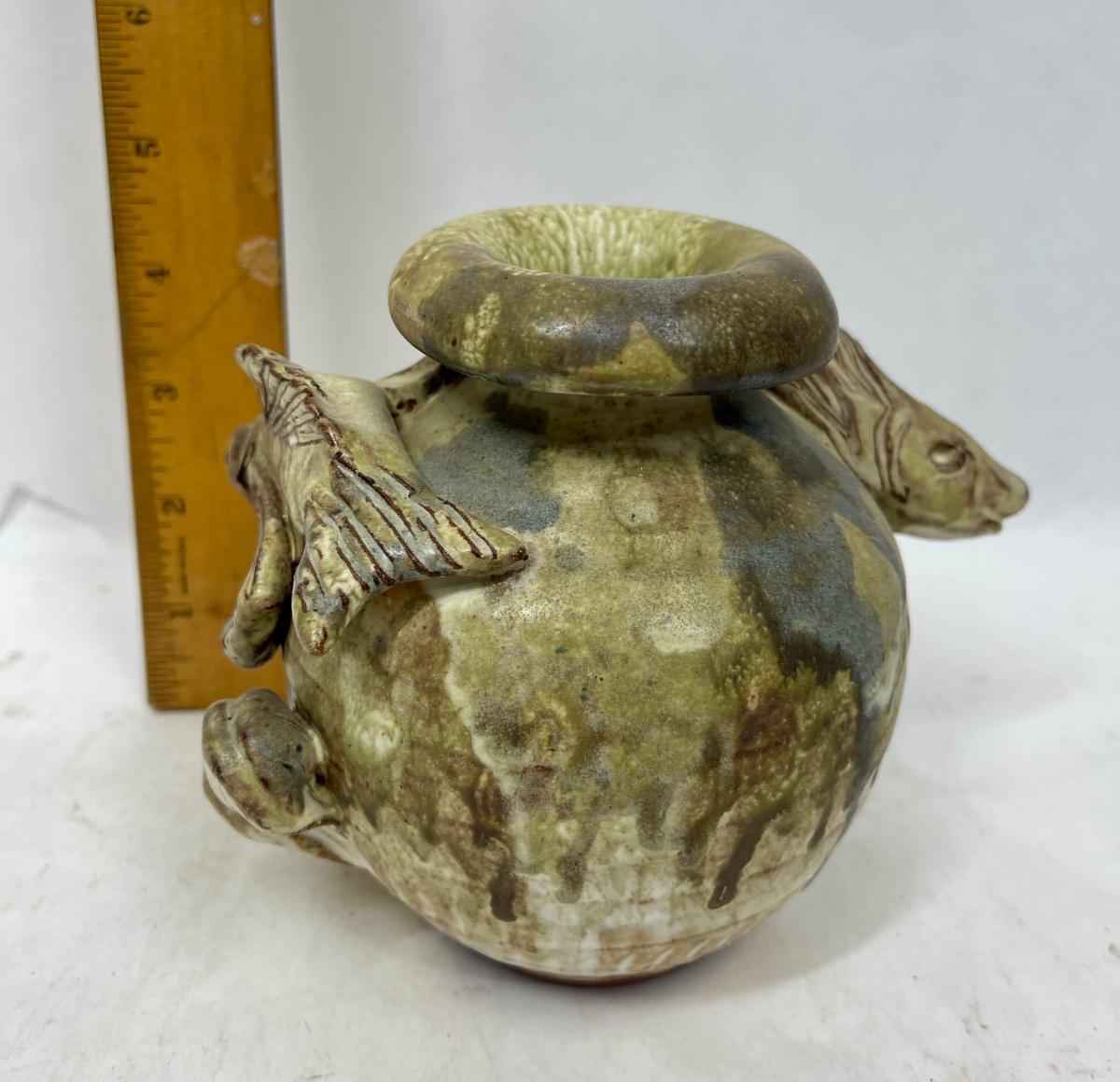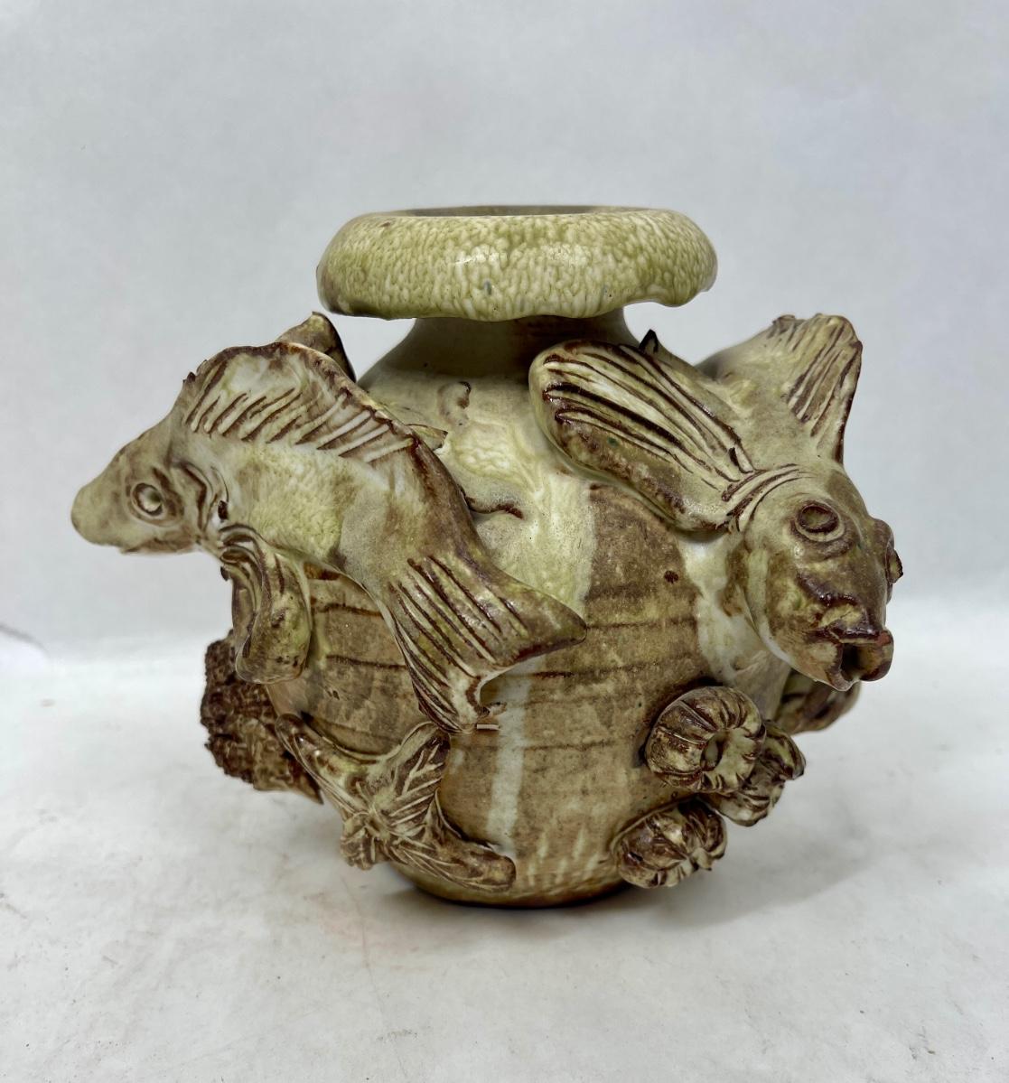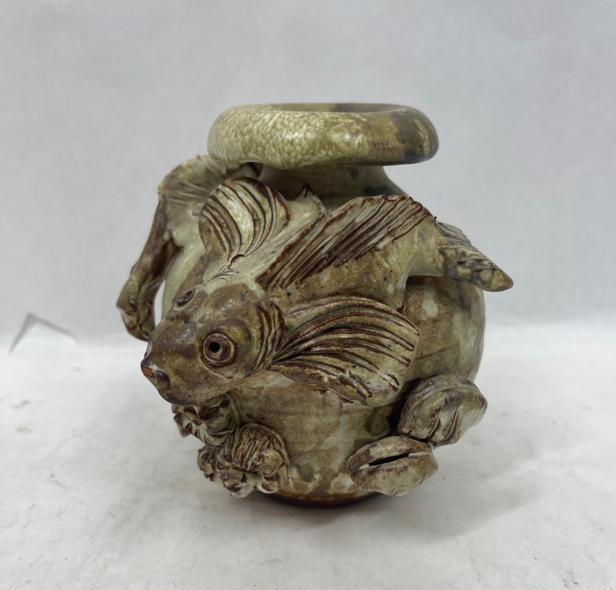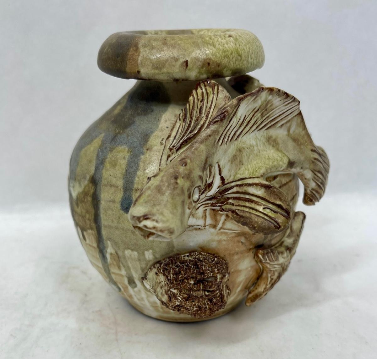A lovely unusual vintage French studio pottery vase. Two high relief fish swimming around the outside with shells, barnacles and a star fish. Matt glaze. Made from clay, in excellent vintage condition no chips, cracks or repairs. Approx. 5" tall.
