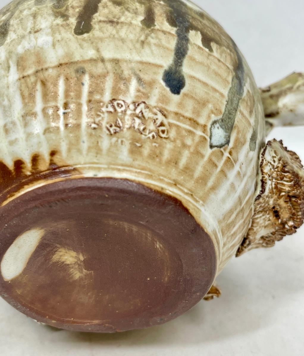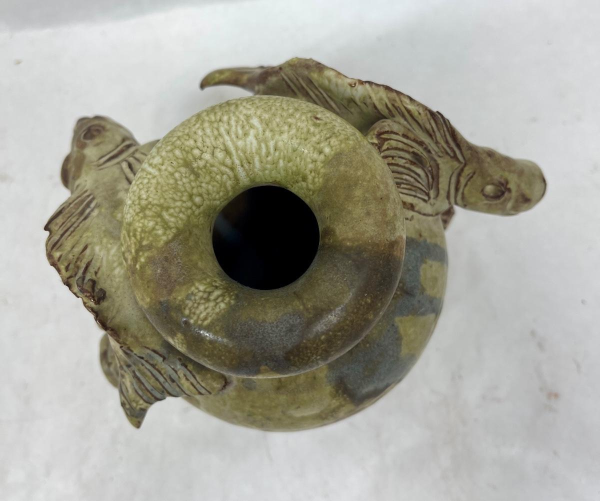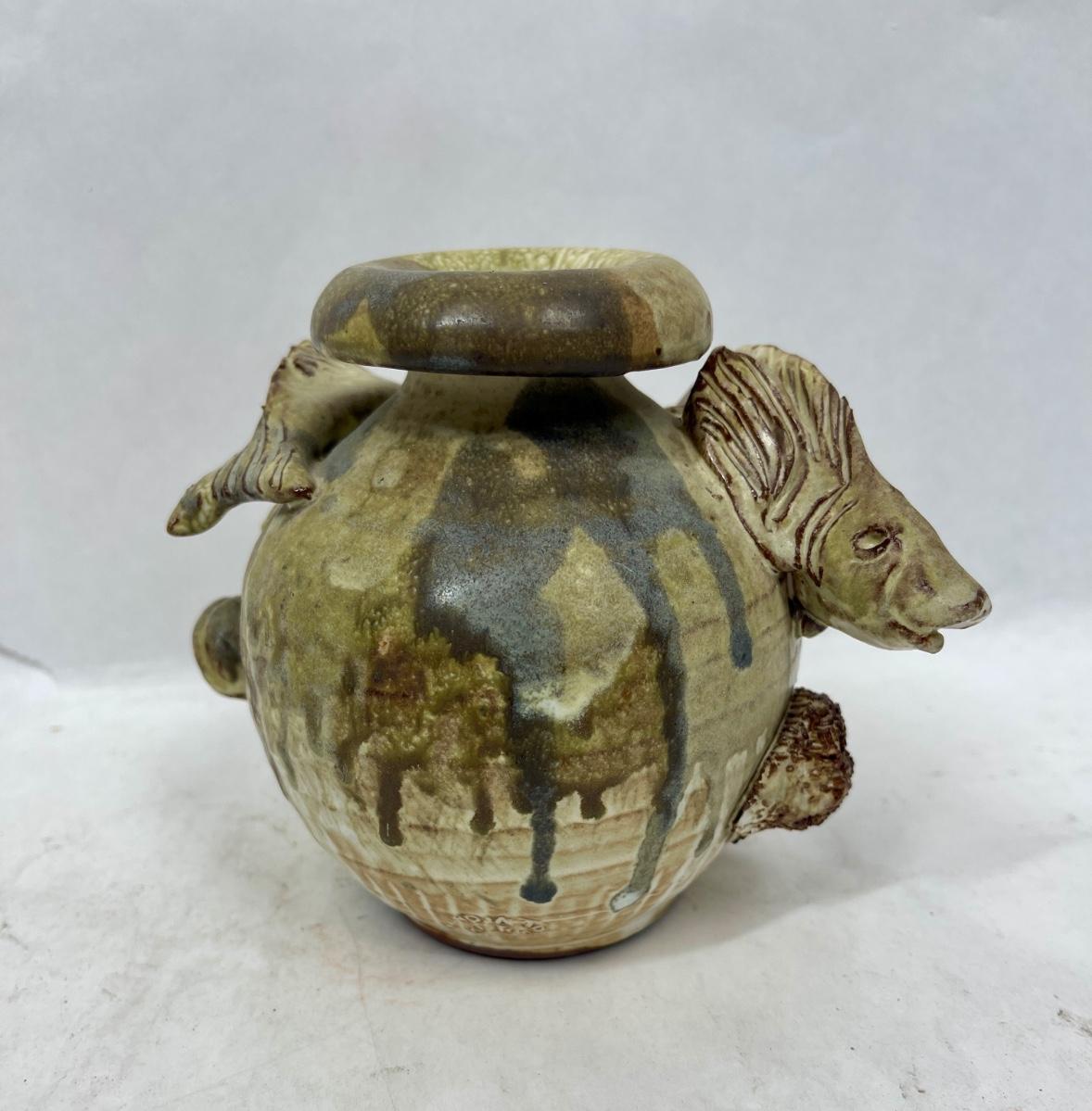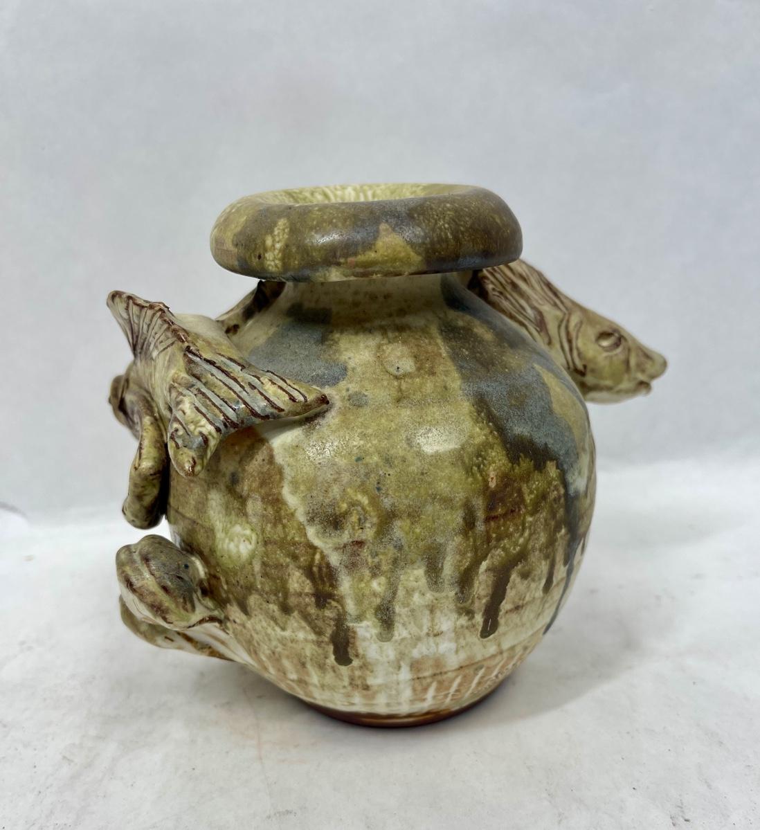 A lovely unusual vintage French studio pottery vase. Two high relief fish swimming around the outside with shells, barnacles and a star fish. Matt glaze. Made from clay, in excellent vintage condition no chips, cracks or repairs. Approx. 5" tall.