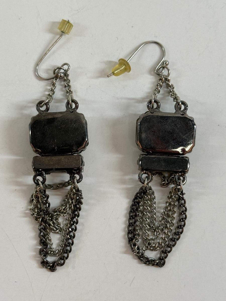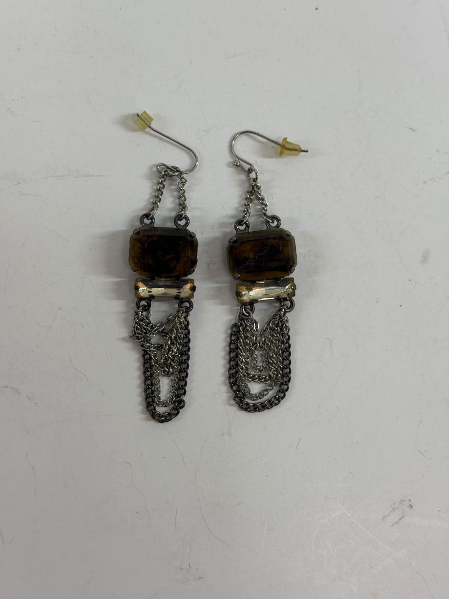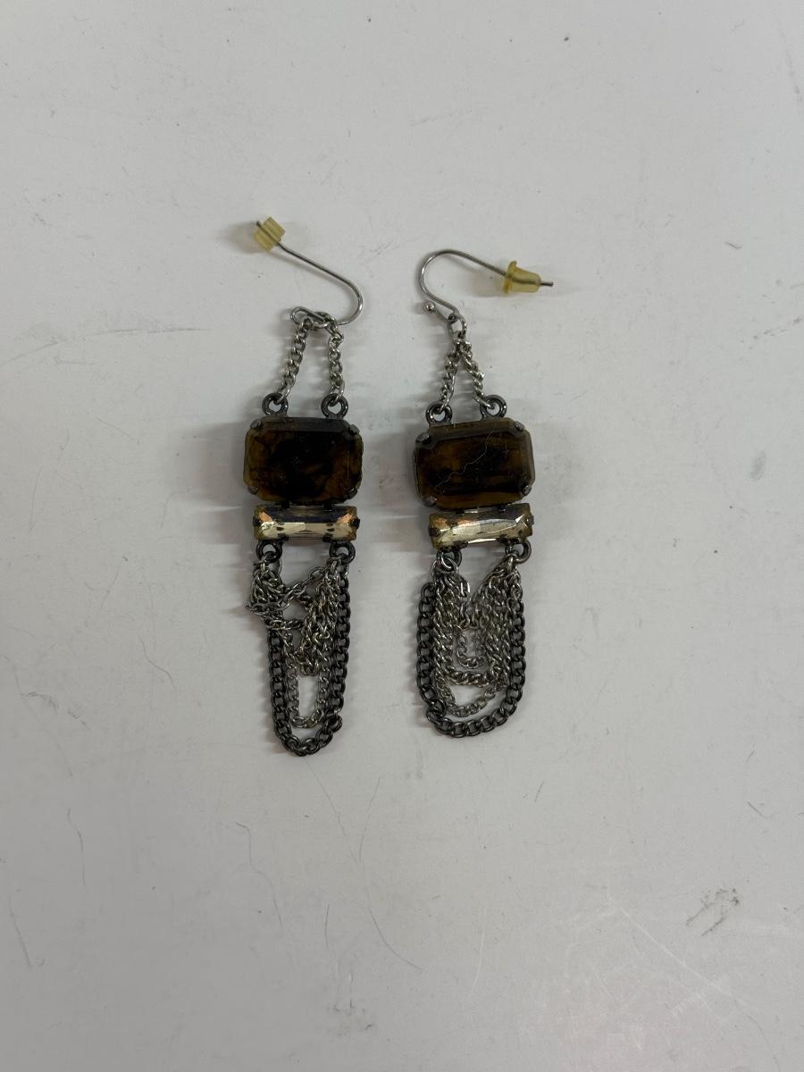 With dark rectangular stones and tiny loops of silver tone chains below.