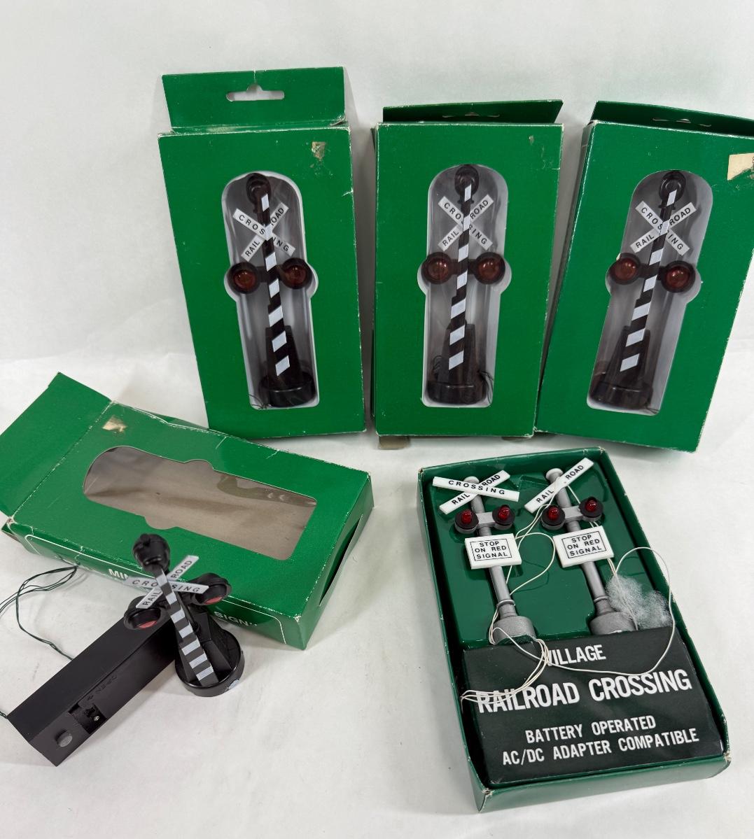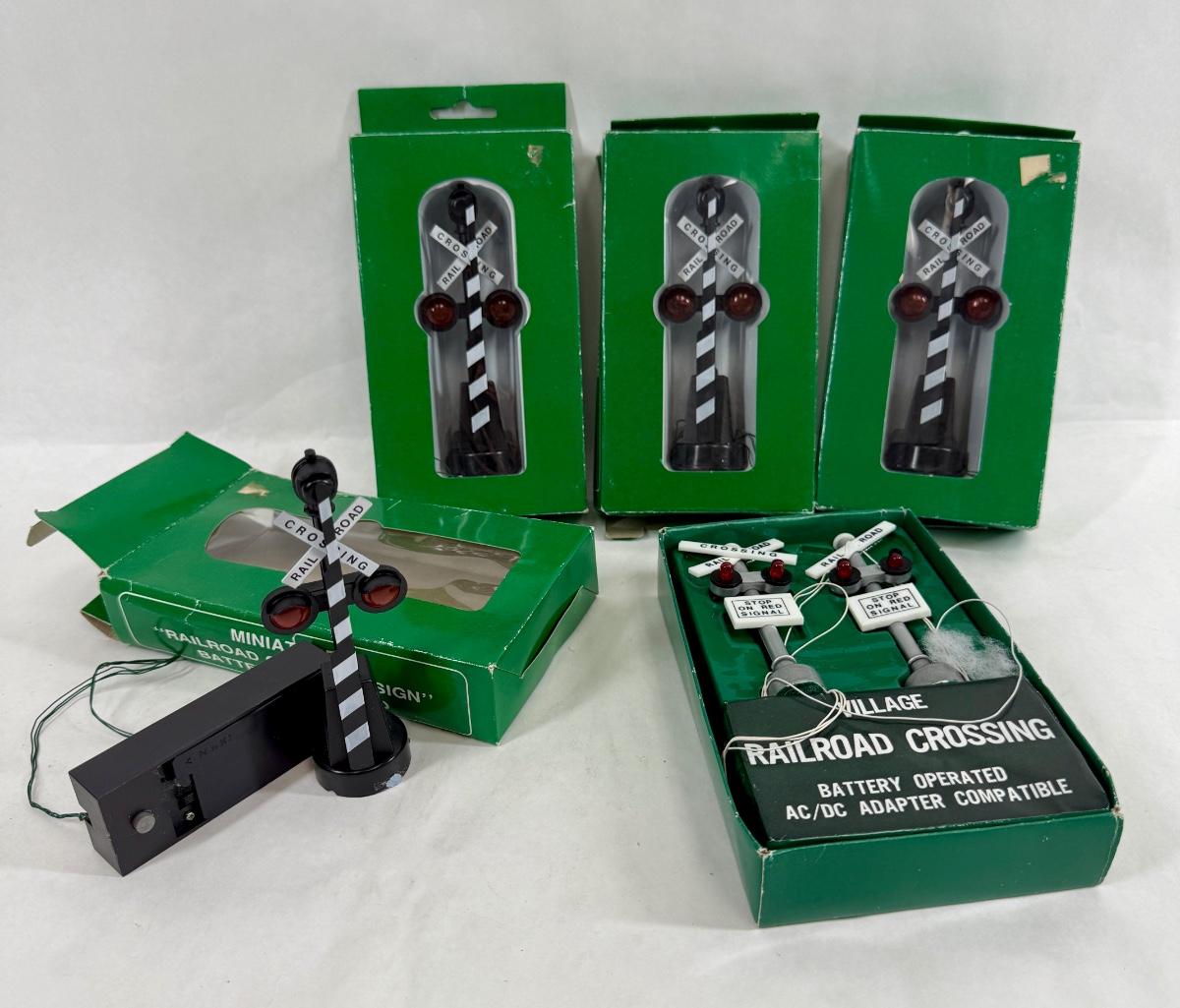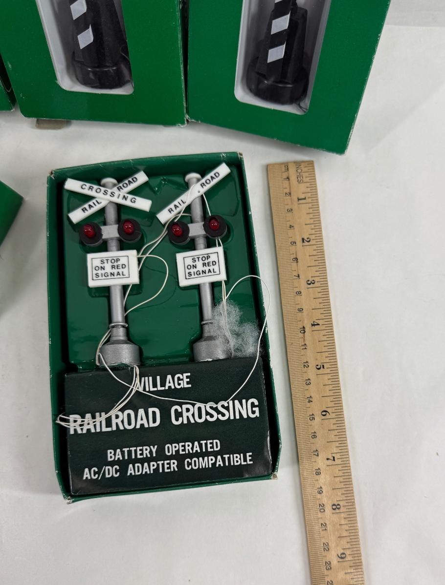 Battery powered railroad crossing signs. Can also be converted to DC (plug-in) power. Look to be for 027 gauge. Near new condition with original boxes. Made in Taiwan.