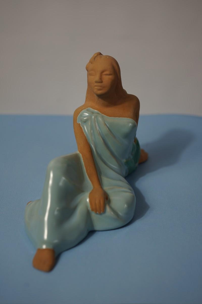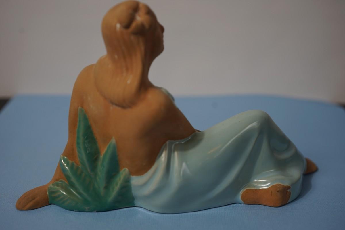 GLADDING MCBEAN POTTERY OF CALIFORNIA 1940'S ELEGANT FORM OF TERRA COTTA WOMAN IWTH TEAL GLAZE ROBE