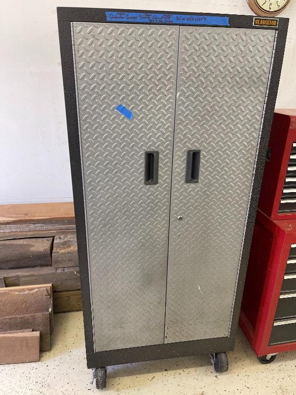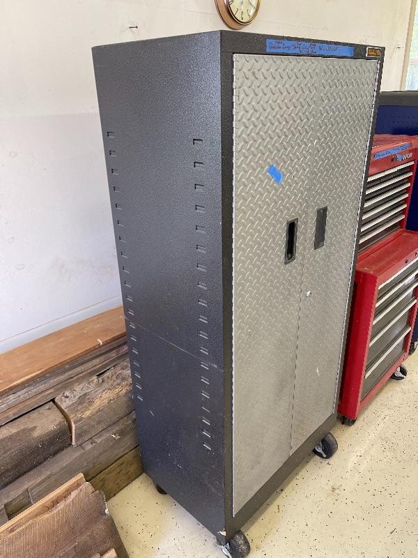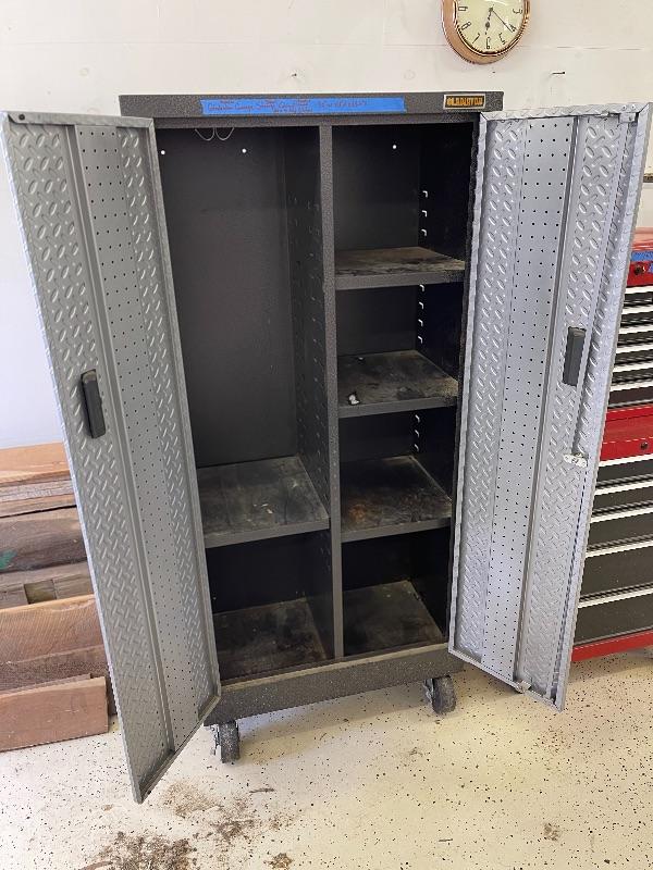 Powder coated sides and back. Diamond treadplate pattern steel doors. Hinged left and right four adjustable shelves.