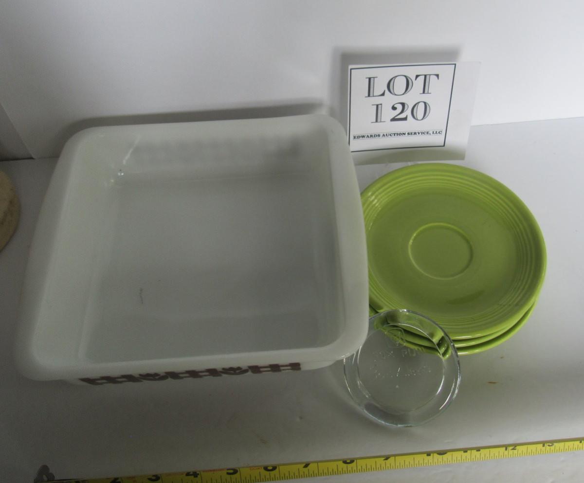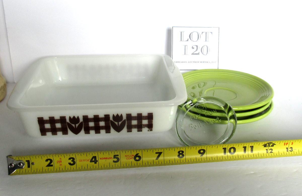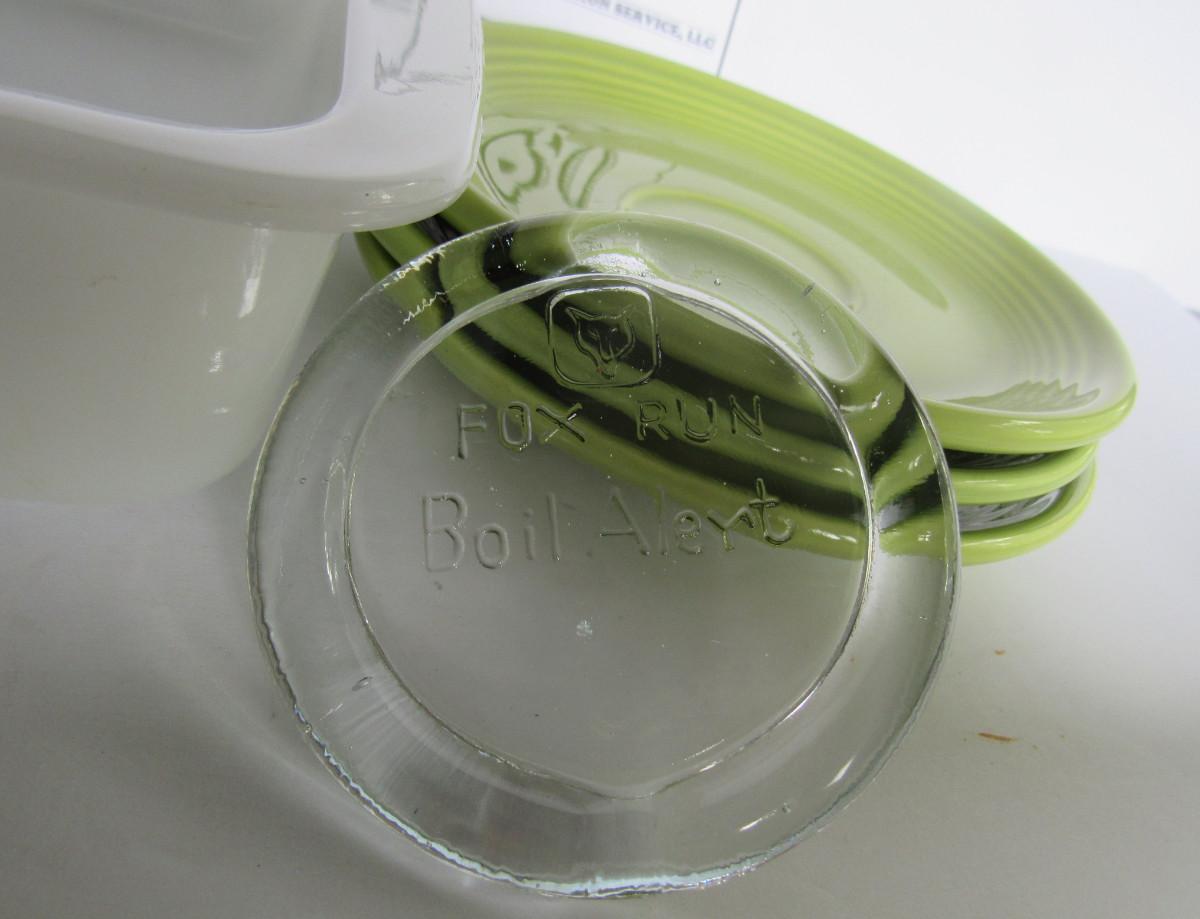 Glasbake Baking Dish, Fiesta Saucers, Boil Alert Glass Anti Boil Tool