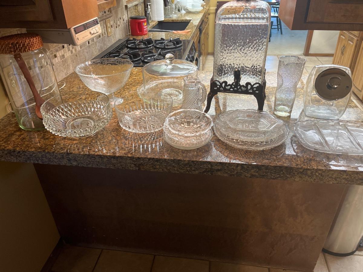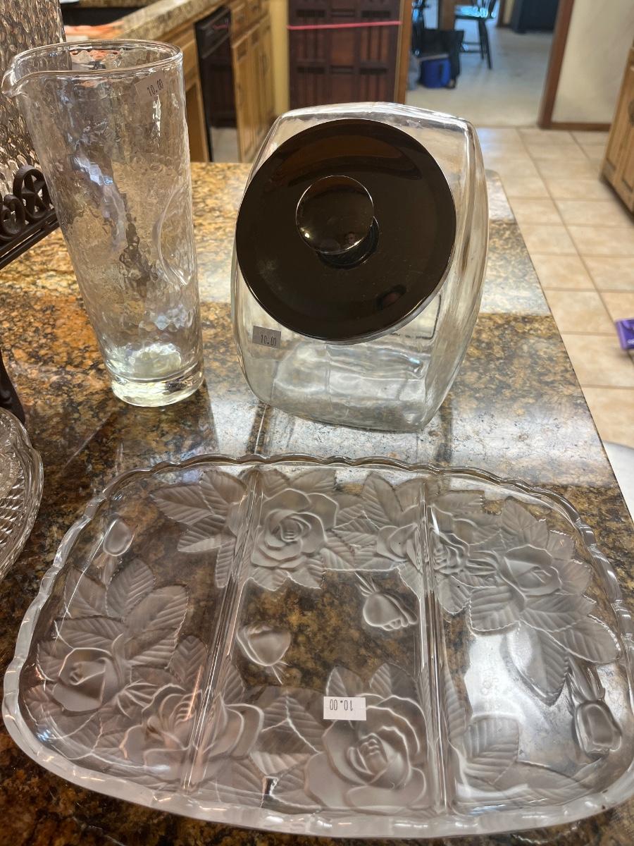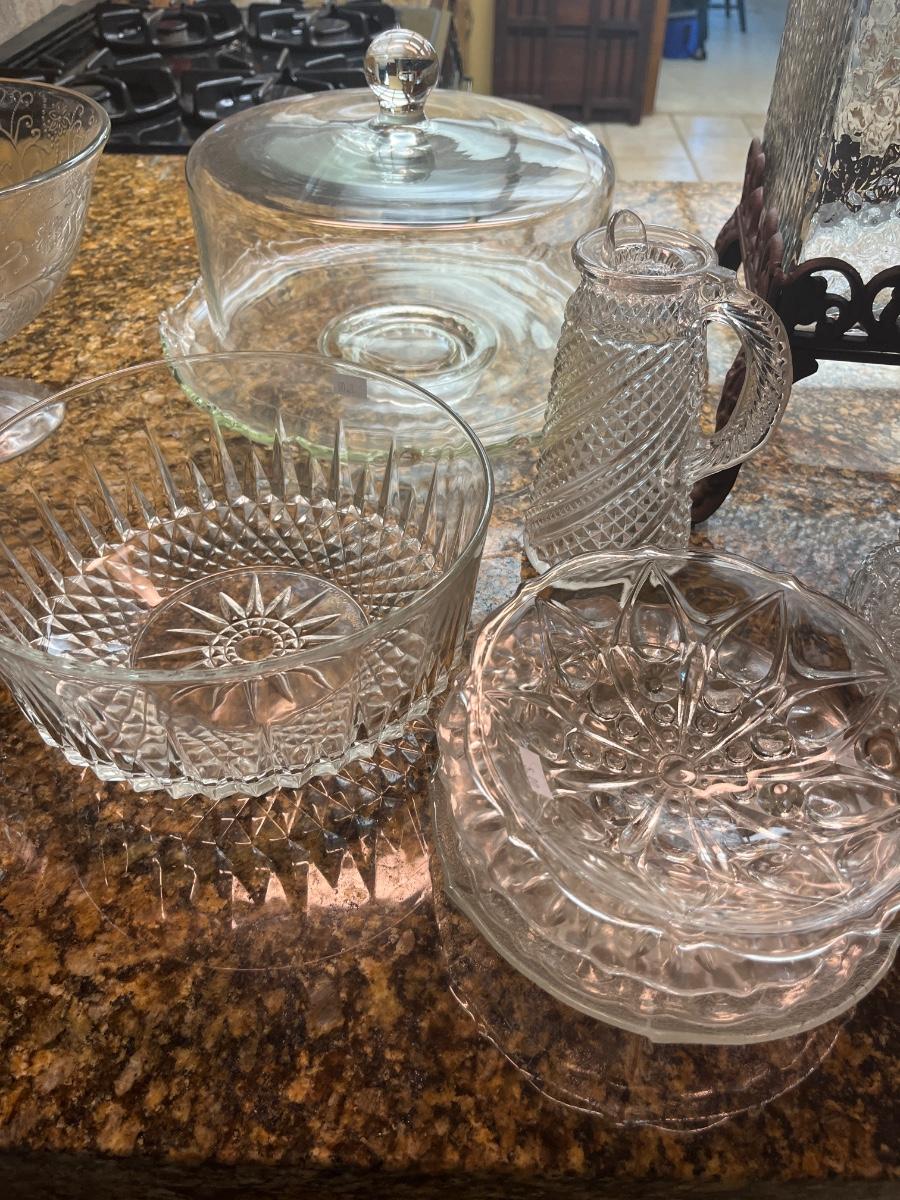 Glass cake pans, punch and hand eats bowls, glass liguid decanter, condiment plate, etc.