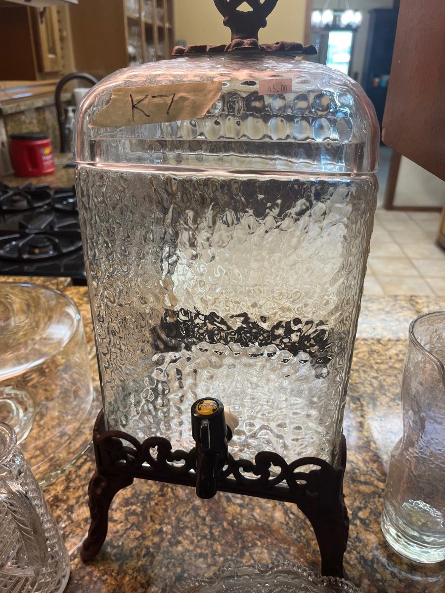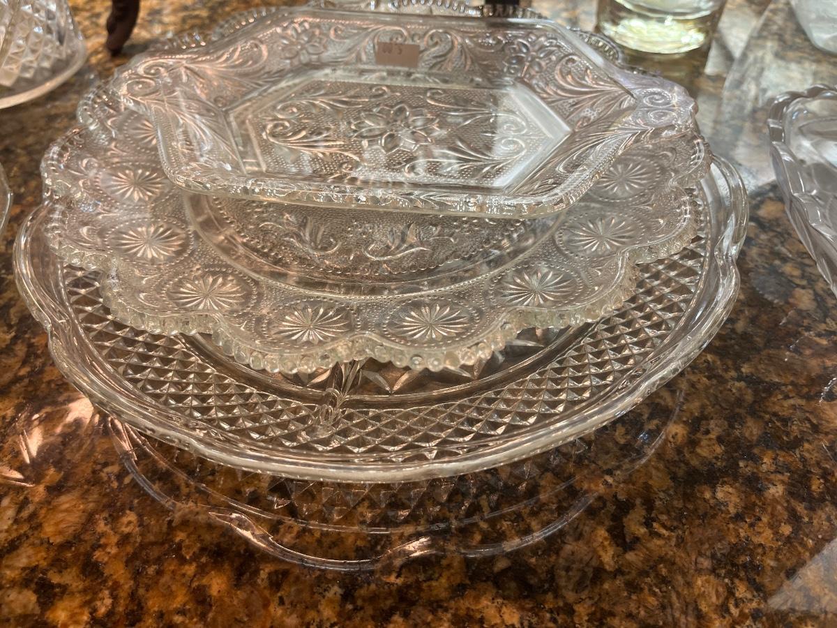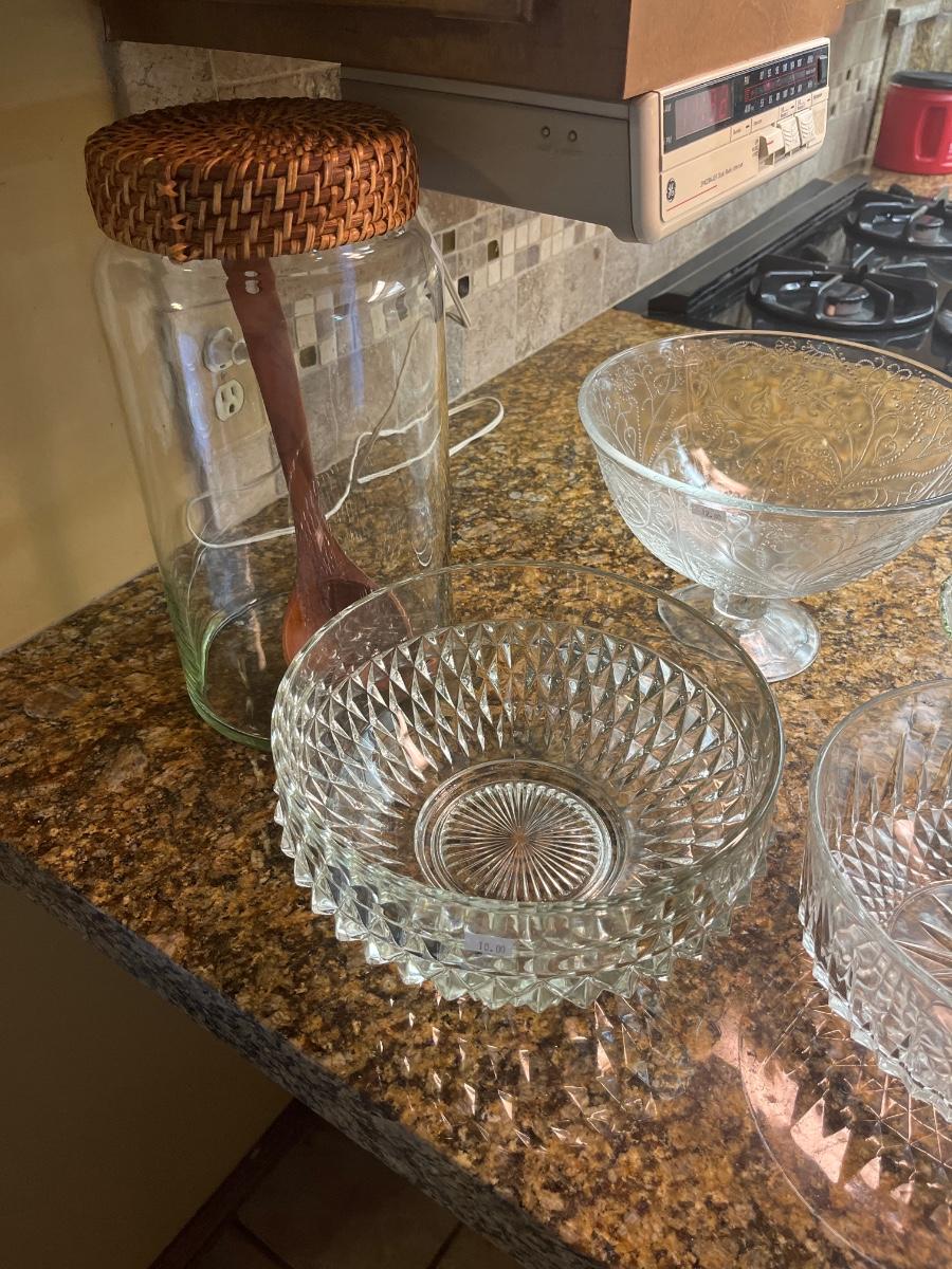 Glass cake pans, punch and hand eats bowls, glass liguid decanter, condiment plate, etc.