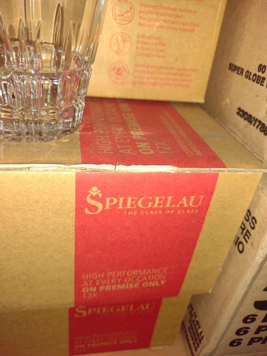 3 Boxes of Spiegelau Drinking Glasses 3 Doz Total Shipping option via freight or local mover is Buyer's responsibility and expense. Buyer must have all shipping scheduled within the stated dates and times of pickup. Recommended local movers are Beaty Bros. Moving 828-201-2982 and Carolina Pack n Go 828-489-9773.