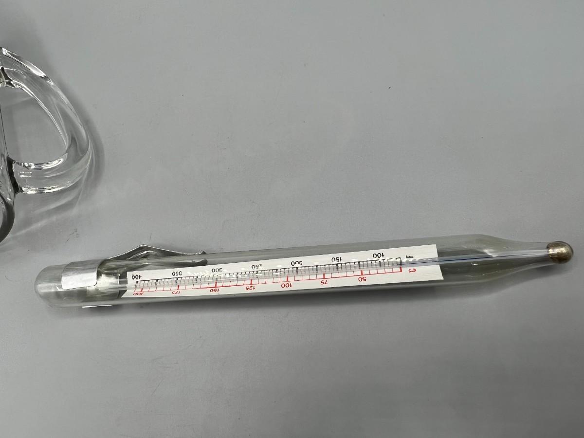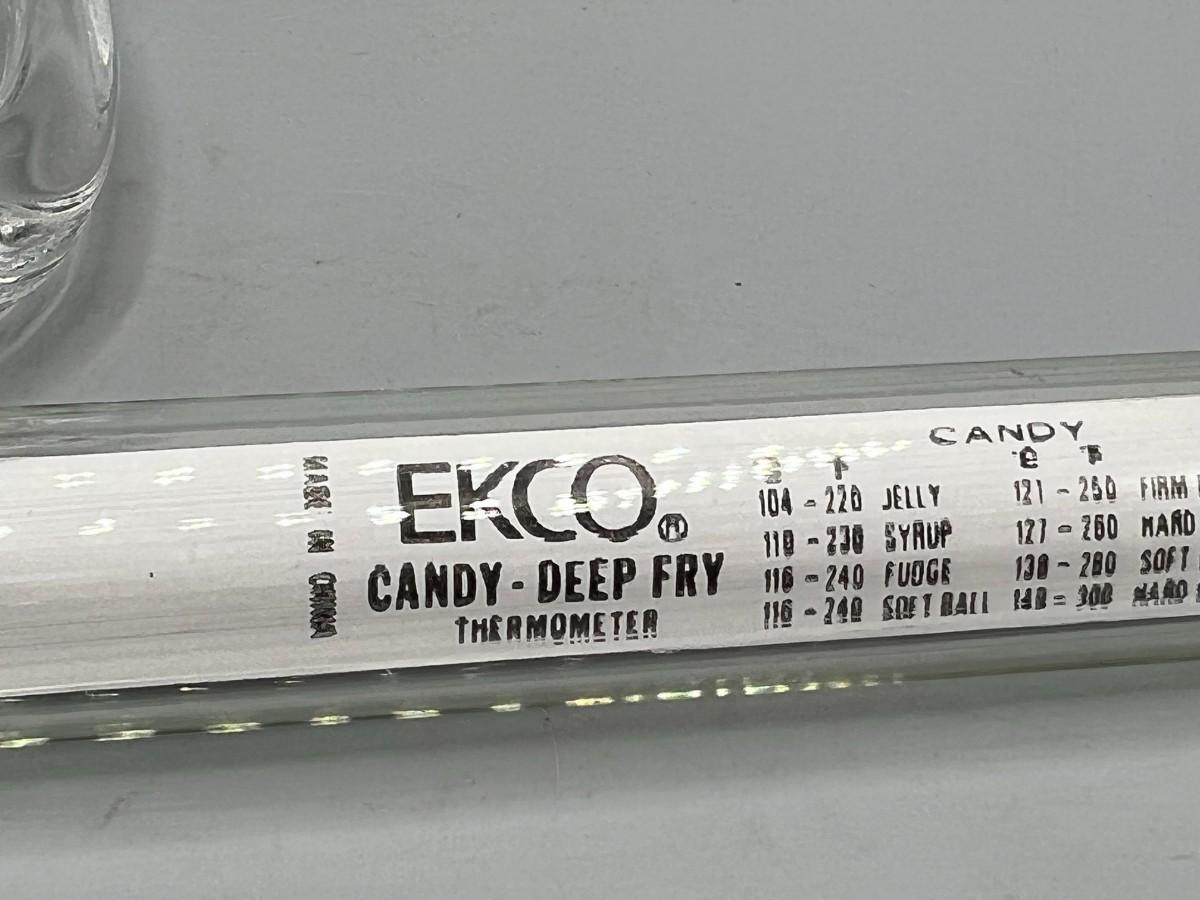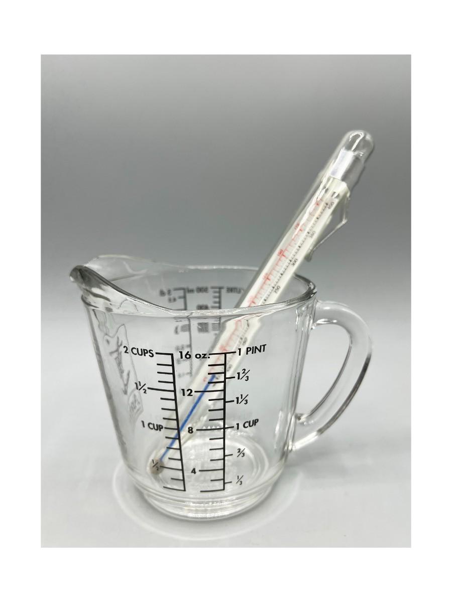 Glass Anchor Hocking 2c Cup Measuring Cup and Candy Thermometer. Thermometer is missing cover but is useable.
