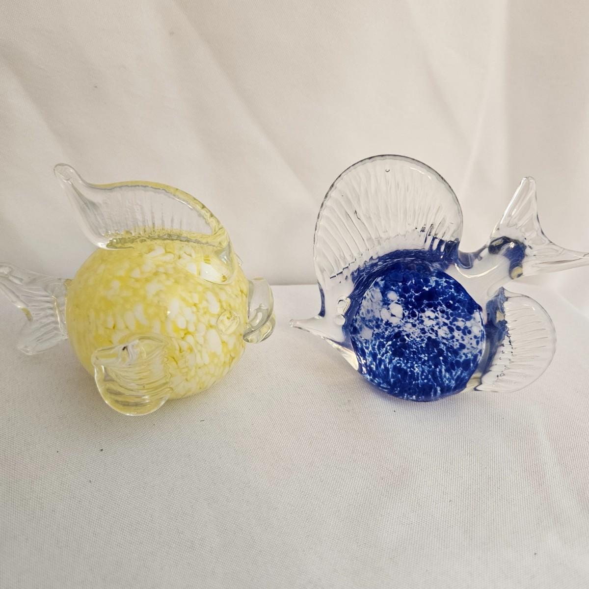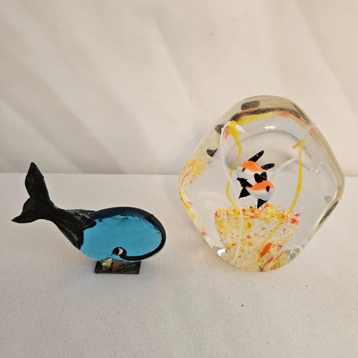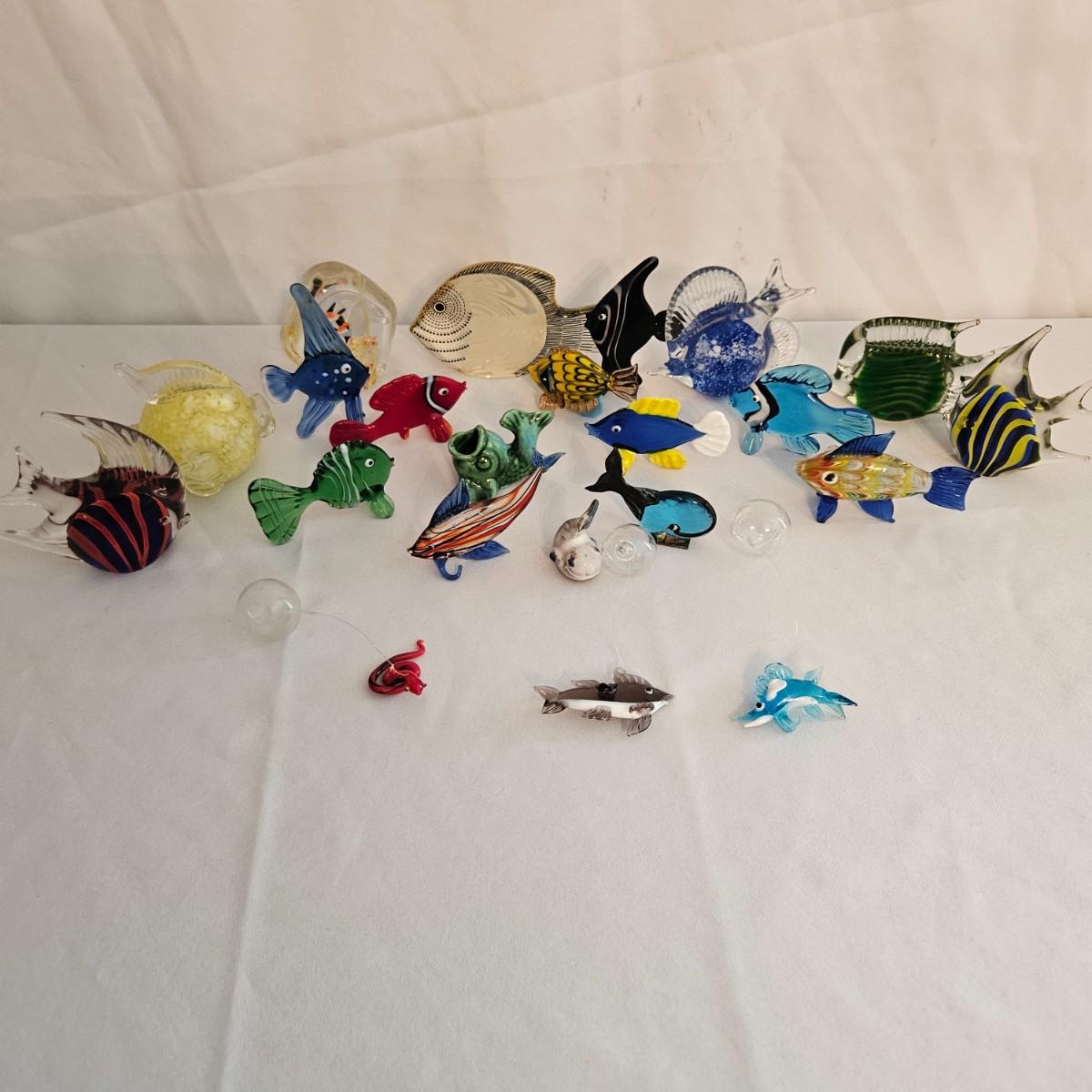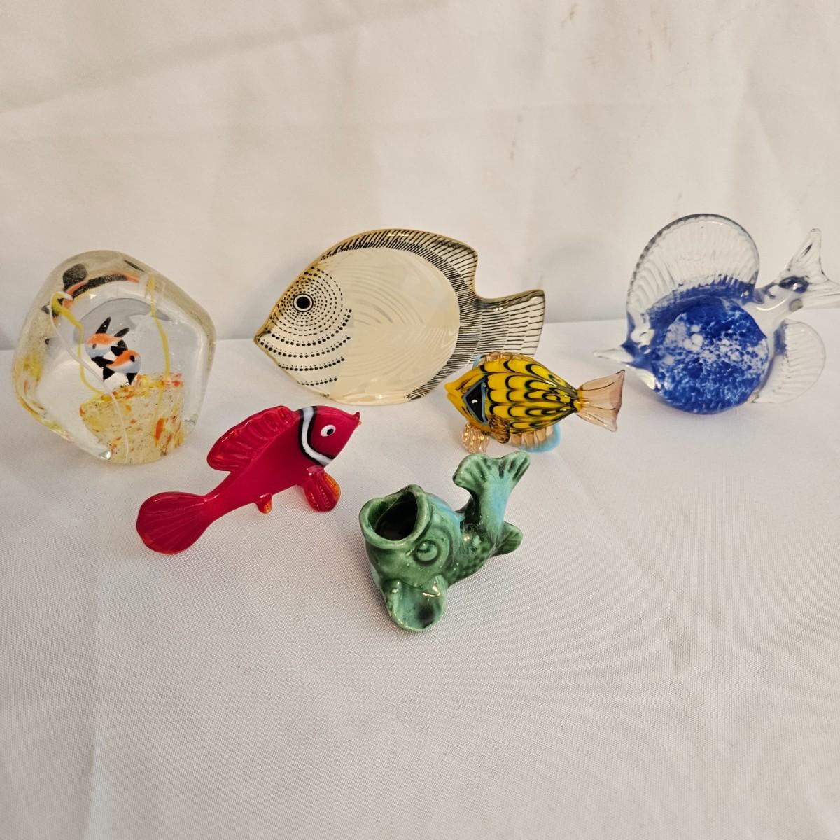An assortment of fish that are mostly glass, but the last two pictured are made of pottery. The paperweight with orange and yellow measures approximately 3" x 1.5" x 3.5"H. Shipping available.