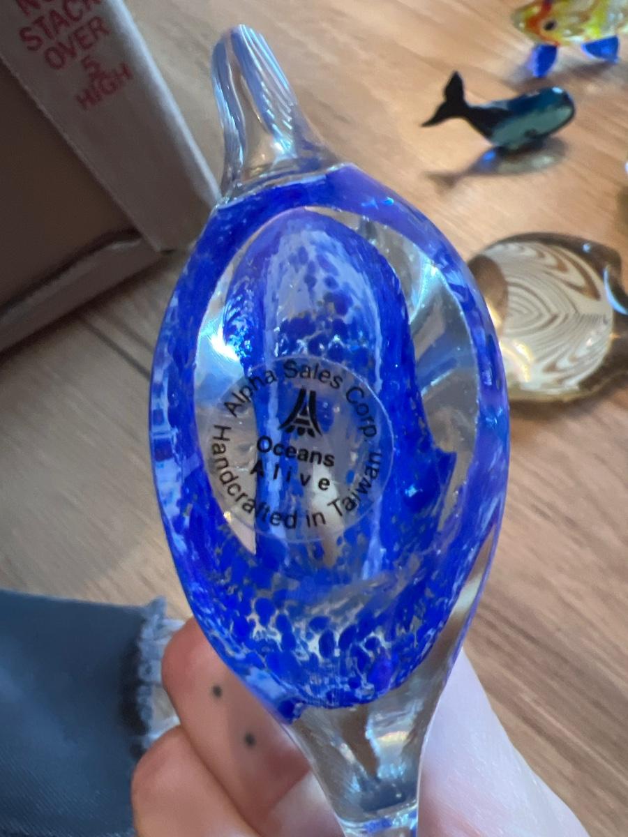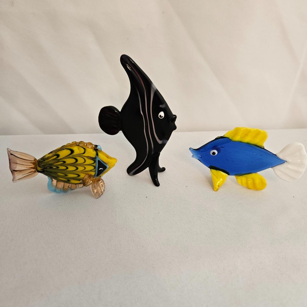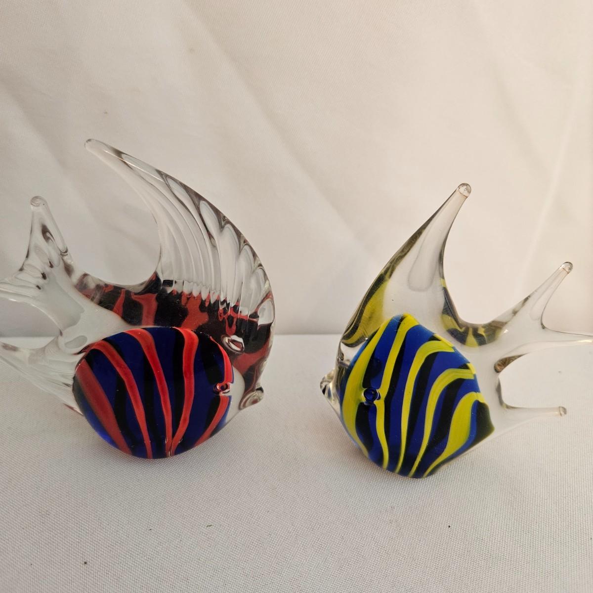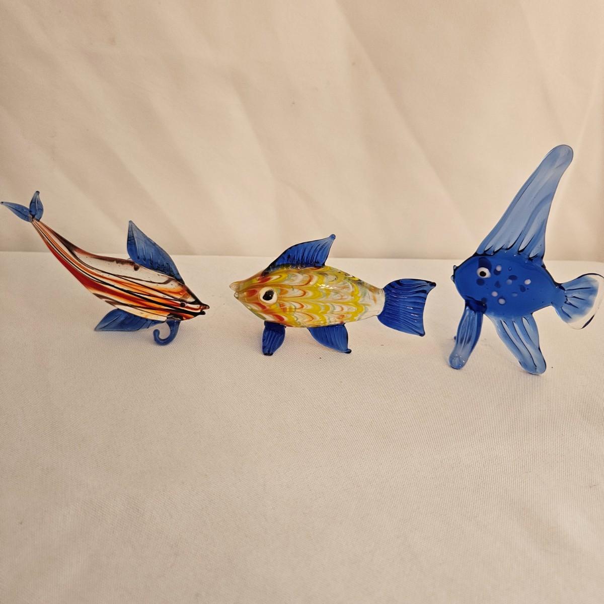 An assortment of fish that are mostly glass, but the last two pictured are made of pottery. The paperweight with orange and yellow measures approximately 3" x 1.5" x 3.5"H. Shipping available.