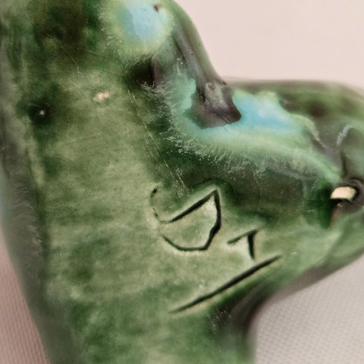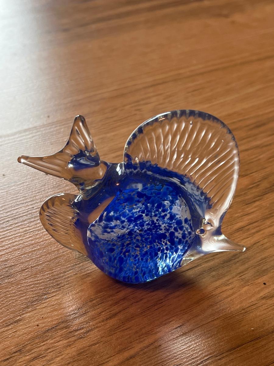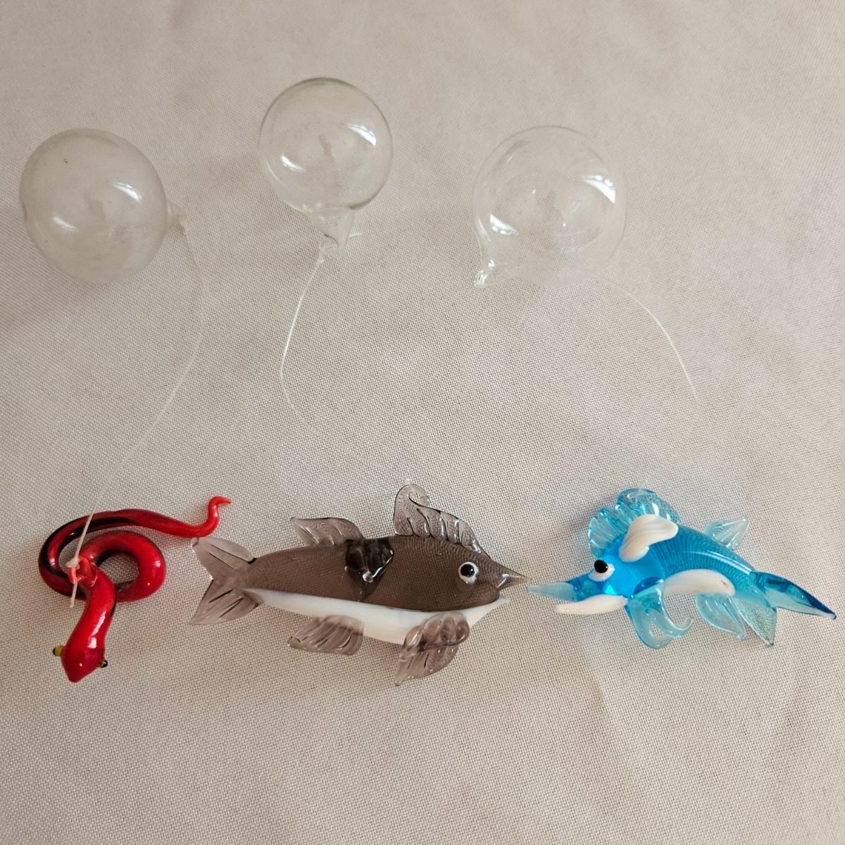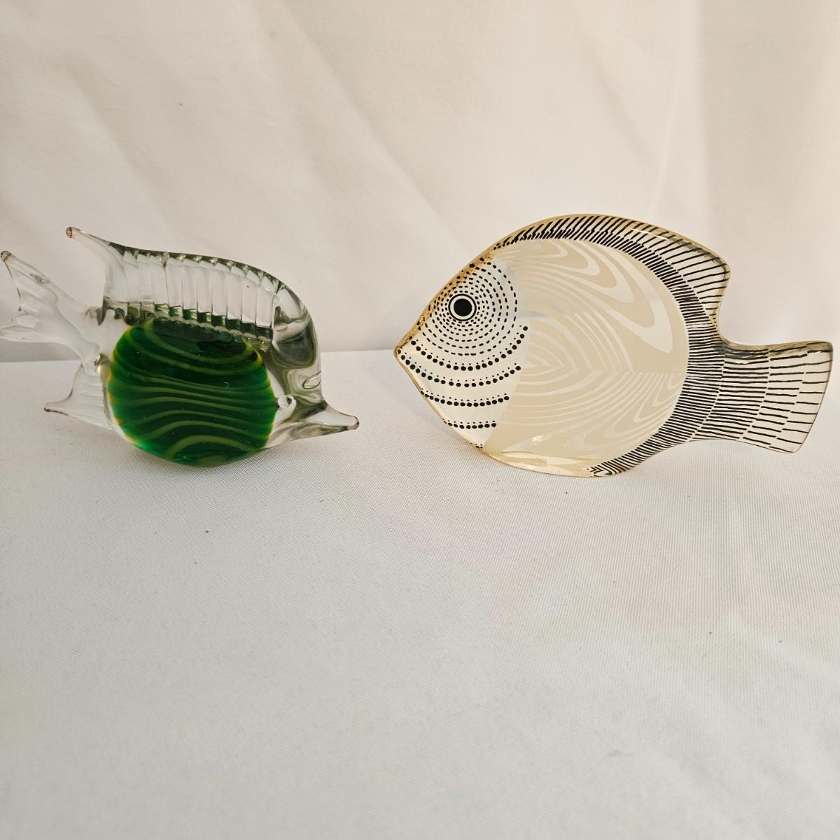 An assortment of fish that are mostly glass, but the last two pictured are made of pottery. The paperweight with orange and yellow measures approximately 3" x 1.5" x 3.5"H. Shipping available.