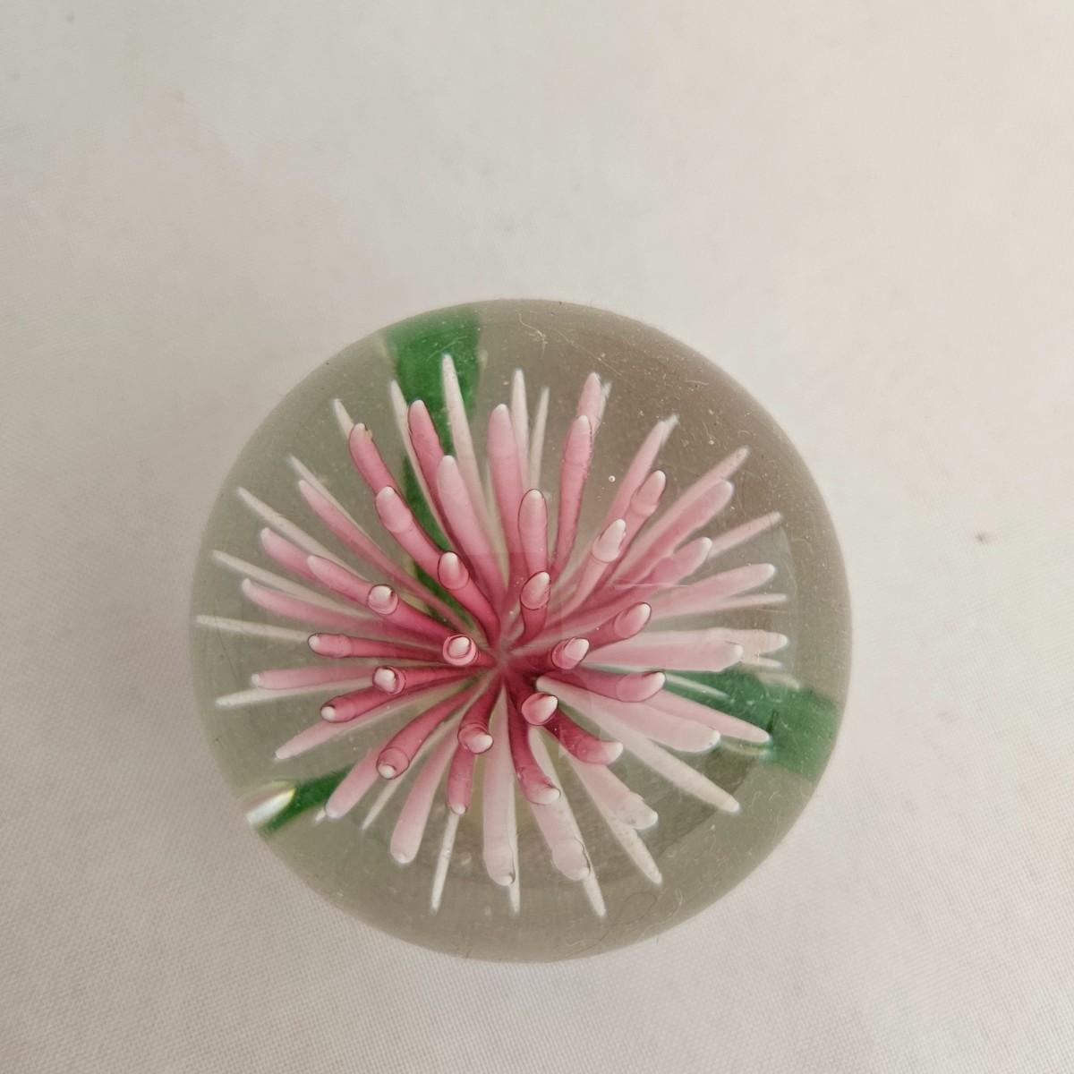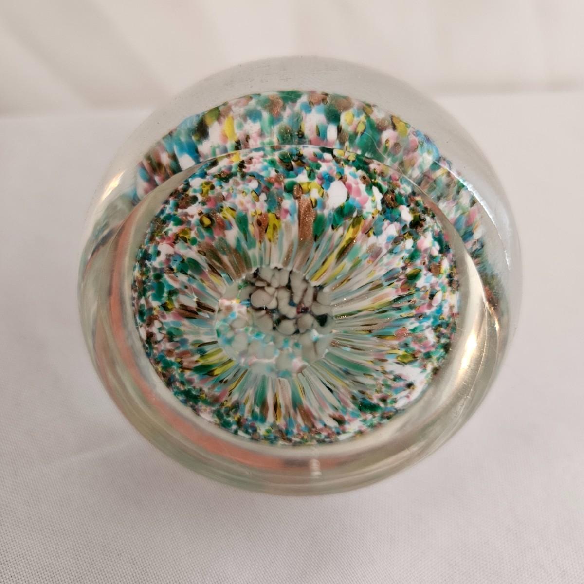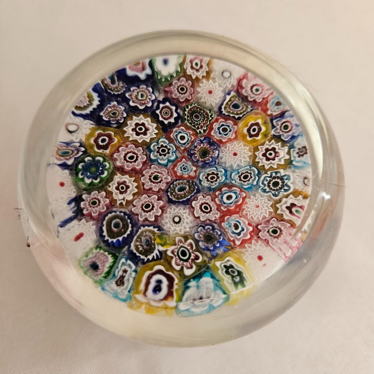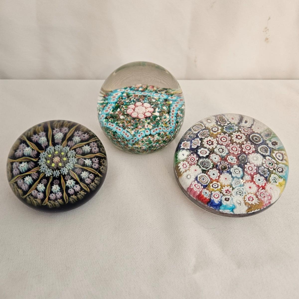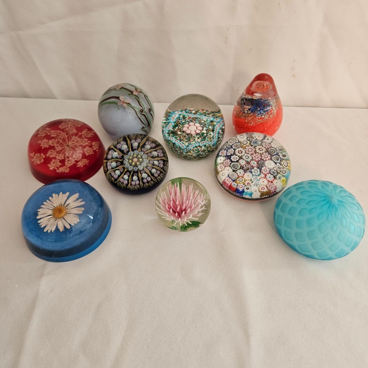 An assortment nine paperweights, seven made of glass and the last two pictured that appear to be epoxy pours and measure approximately 3.5"D x 2"H. Shipping available