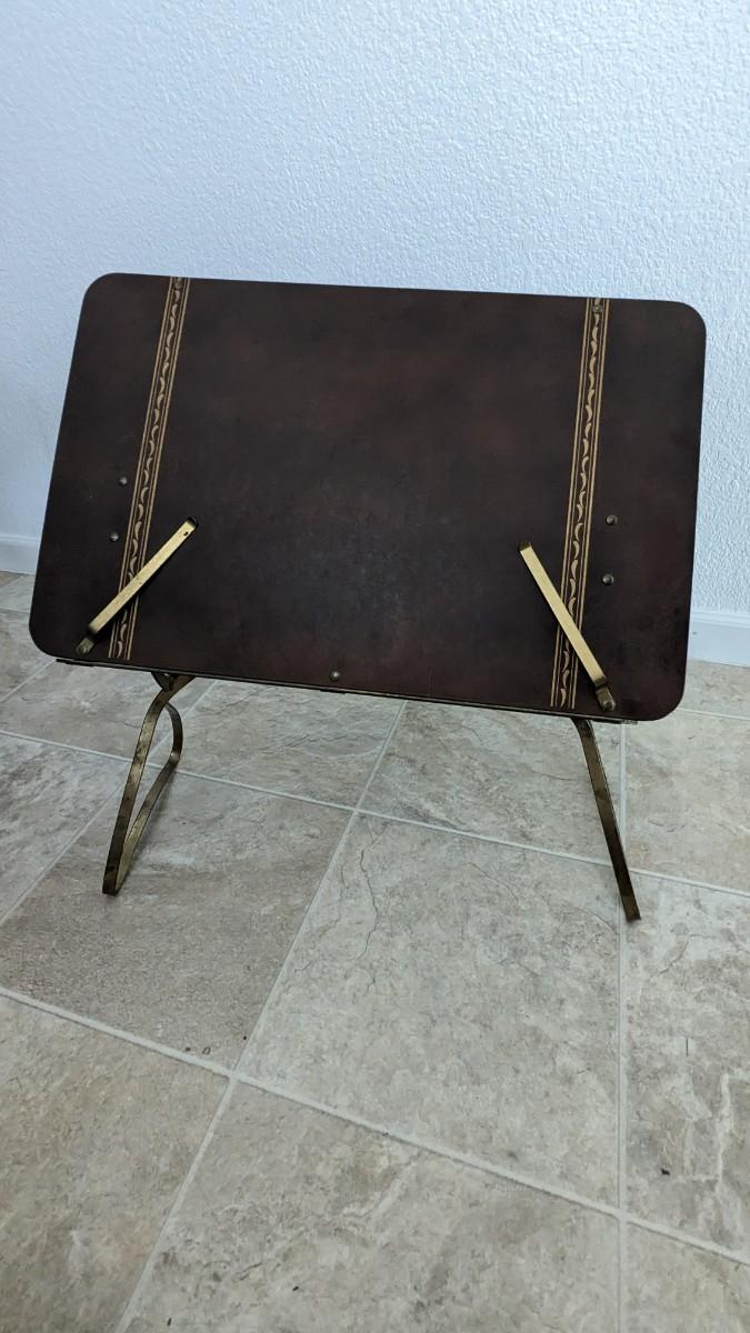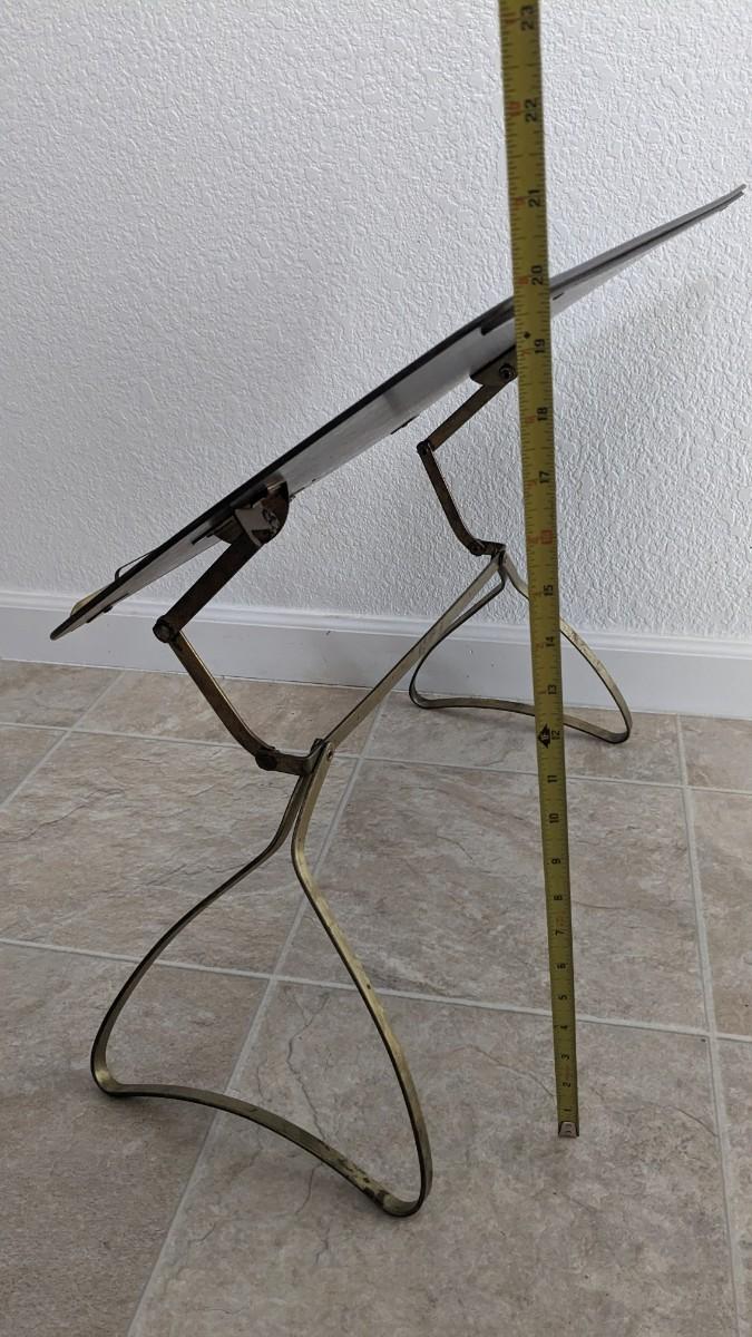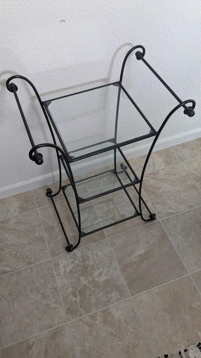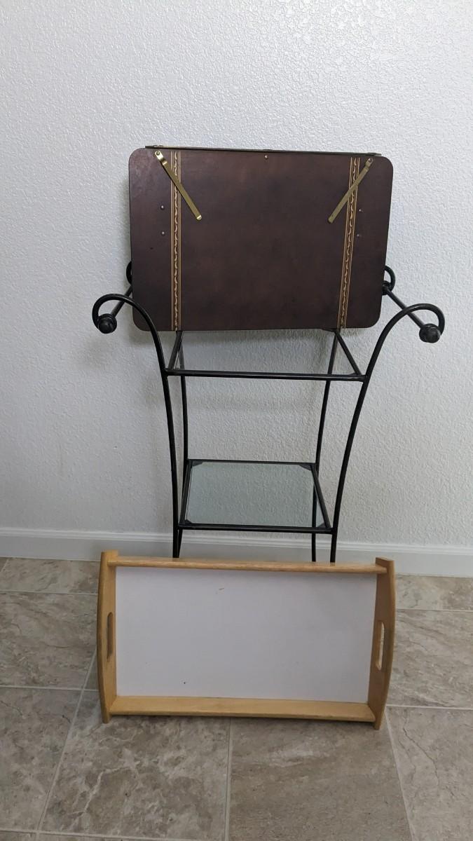 21.75"x 16"x 32"bent iron 3 tier glass shelf. Also includes 2 lap trays, one for everyday use and the other a lovely older art board with folding arms . All pieces in great condition. No shipping