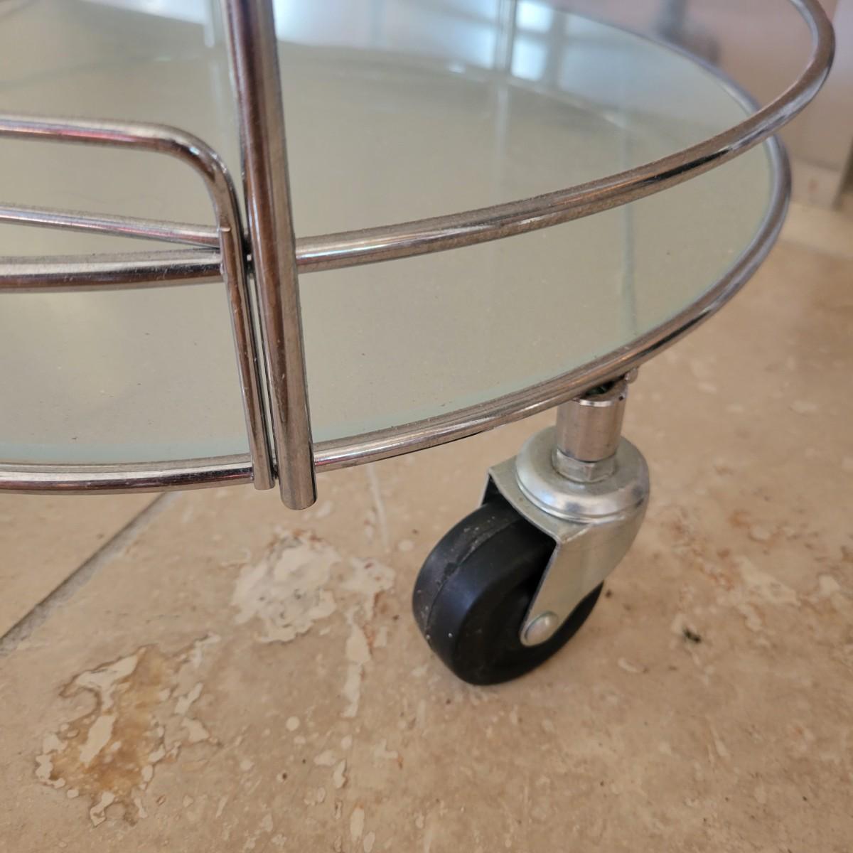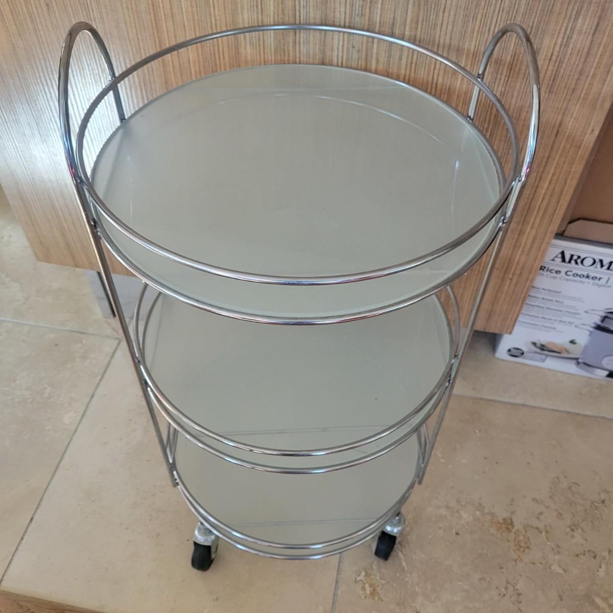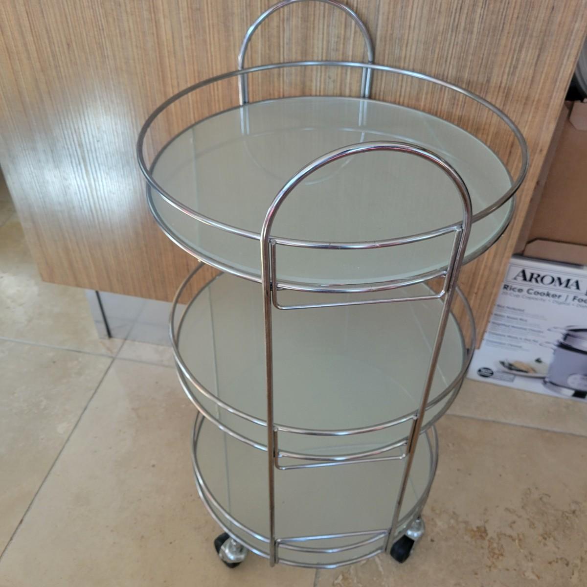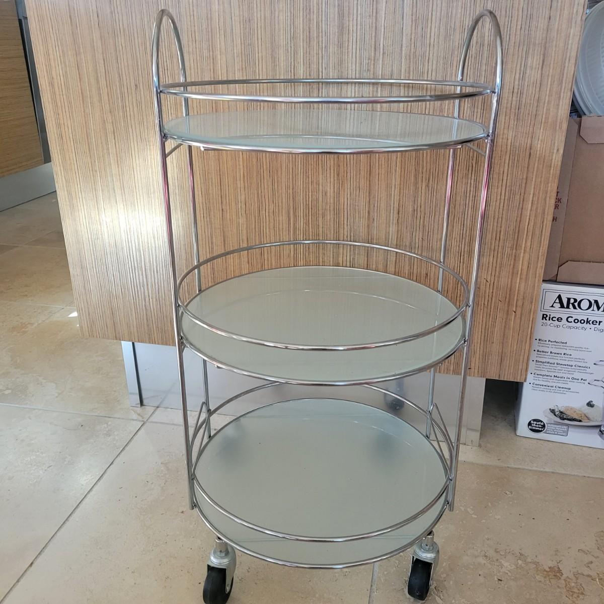 A glass and metal bar cart that has no damage. This cart has a metal frame with three glass shelves and casters. Measures approximately 15"D x 27.5"H. Local pickup only